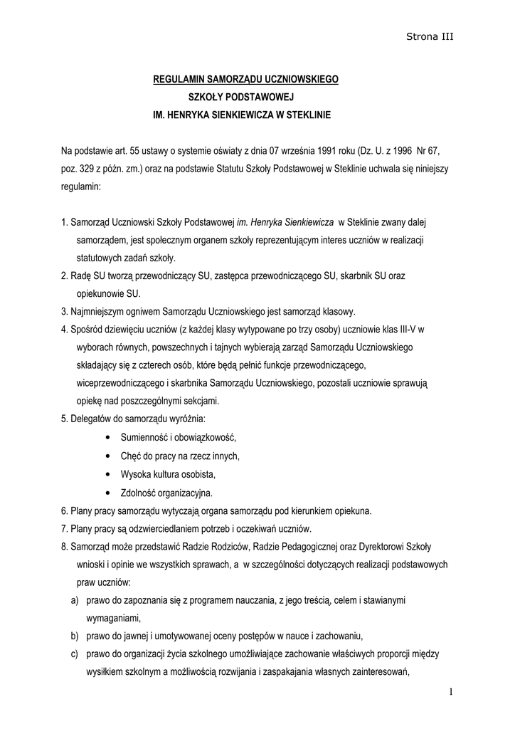 Strona III REGULAMIN SAMORZĄDU UCZNIOWSKIEGO SZKOŁY PODSTAWOWEJ IM. HENRYKA SIENKIEWICZA W STEKLINIE Na podstawie art. 55 ustawy o systemie oświaty z dnia 07 września 1991 roku (Dz. U. z 1996 Nr 67, poz. 329 z późn. zm.) oraz na podstawie Statutu Szkoły Podstawowej w Steklinie uchwala się niniejszy regulamin: 1. Samorząd Uczniowski Szkoły Podstawowej im. Henryka Sienkiewicza w Steklinie zwany dalej samorządem, jest społecznym organem szkoły reprezentującym interes uczniów w realizacji statutowych zadań szkoły. 2. Radę SU tworzą przewodniczący SU, zastępca przewodniczącego SU, skarbnik SU oraz opiekunowie SU. 3. Najmniejszym ogniwem Samorządu Uczniowskiego jest samorząd klasowy. 4. Spośród dziewięciu uczniów (z każdej klasy wytypowane po trzy osoby) uczniowie klas III-V w wyborach równych, powszechnych i tajnych wybierają zarząd Samorządu Uczniowskiego składający się z czterech osób, które będą pełnić funkcje przewodniczącego, wiceprzewodniczącego i skarbnika Samorządu Uczniowskiego, pozostali uczniowie sprawują opiekę nad poszczególnymi sekcjami. 5. Delegatów do samorządu wyróżnia: • Sumienność i obowiązkowość, • Chęć do pracy na rzecz innych, • Wysoka kultura osobista, • Zdolność organizacyjna. 6. Plany pracy samorządu wytyczają organa samorządu pod kierunkiem opiekuna. 7. Plany pracy są odzwierciedlaniem potrzeb i oczekiwań uczniów. 8. Samorząd może przedstawić Radzie Rodziców, Radzie Pedagogicznej oraz Dyrektorowi Szkoły wnioski i opinie we wszystkich sprawach, a w szczególności dotyczących realizacji podstawowych praw uczniów: a) prawo do zapoznania się z programem nauczania, z jego treścią, celem i stawianymi wymaganiami, b) prawo do jawnej i umotywowanej oceny postępów w nauce i zachowaniu, c) prawo do organizacji życia szkolnego umożliwiające zachowanie właściwych proporcji między wysiłkiem szkolnym a możliwością rozwijania i zaspakajania własnych zainteresowań, 1 Strona III d) prawo redagowania i wydawania własnej gazetki szkolnej, e) prawo organizowania działalności kulturalnej, oświatowej i sportowej oraz rozrywkowej zgodnie z właściwymi potrzebami i możliwościami organizacyjnymi, w porozumieniu z Dyrektorem Szkoły. 9. Realizację planów pracy wspomagają wybrani opiekunowie oraz zaproszeni przez samorząd nauczyciele. 10. Zebrane pieniądze z przeprowadzonych imprez są przeliczane komisyjnie – sporządzany jest protokół. 11. Upoważnionymi do dysponowania funduszami są przedstawiciele samorządu. 12. Opiekun Samorządu Uczniowskiego składa Radzie Pedagogicznej sprawozdanie semestralne i roczne z działalności organizacji. 13. Kadencja władz samorządu trwa jeden rok. 14. Do powinności i uprawnień samorządu należy: a) przedstawianie opiekunowi, Dyrektorowi Szkoły, Radzie Pedagogicznej, Radzie Szkoły opinii dotyczących organizacji zajęć w szkole, b) zgłaszanie uwag do Statutu Szkoły oraz regulaminów wewnętrznych szkoły, c) opiniowanie regulaminu ustalania ocen z zachowania, d) występowanie z poręczeniem za ucznia, na którego nałożono karę, e) zgłaszanie uwag dotyczących zagrożenia bezpieczeństwa uczniów, f) organizowanie działań na rzecz poprawy warunków nauki w szkole, g) występowanie do Dyrektora Szkoły i nauczycieli o nagrody, wyróżnienia dla uczniów, h) reprezentowanie interesów uczniów w organizowaniu zajęć szkolnych i pozaszkolnych, i) występowanie w obronie ucznia, w przypadku, gdy naruszone zostały jego statutowe prawa, j) prowadzenie samopomocy koleżeńskiej, k) organizowanie i udział w pracach społecznych na rzecz szkoły, l) organizowanie życia kulturalnego szkoły, m) kultywowanie tradycji narodowych i ceremoniału szkolnego, n) organizowanie dyżurów szkolnych podczas przerw, o) współpraca z rodzicami w organizowaniu uroczystości szkolnych, p) troska o właściwe zachowanie się uczniów, popularyzowanie postawy poszanowania mienia szkolnego i własnego, szacunków dla rówieśników, osób starszych i pracowników szkoły, q) troska o wystrój szkoły, r) przestrzeganie norm prawnych przyjętych w szkole, a zwłaszcza regulaminów wewnętrznych, s) opiniowanie pracy nauczycieli. 15. Samorząd Uczniowski współpracuje ze wszystkimi organami szkoły, w szczególności zwraca się z wnioskami do Dyrektora Szkoły i Opiekuna SU. 2 Strona III 16. Samorząd Uczniowski może tworzyć sekcje. 17. Rada Samorządu uchwala regulamin. 18. Zarząd jest organem wykonawczym dla Samorządu Uczniowskiego. W celu pozyskania środków pieniężnych może: a) prowadzić działalność o charakterze dochodowym, b) gromadzić środki z innych źródeł. Rok szkolny Podpis Przew. Samorządu Podpis Opiekunów Samorządu Uczniowskiego Uczniowskiego 3