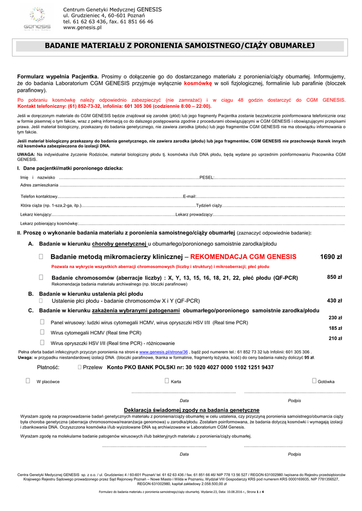 Centrum Genetyki Medycznej GENESIS ul. Grudzieniec 4, 60-601 Poznań tel. 61 62 63 436, fax. 61 851 66 46 www.genesis.pl BADANIE MATERIAŁU Z PORONIENIA SAMOISTNEGO/CIĄŻY OBUMARŁEJ Formularz wypełnia Pacjentka. Prosimy o dołączenie go do dostarczanego materiału z poronienia/ciąży obumarłej. Informujemy, że do badania Laboratorium CGM GENESIS przyjmuje wyłącznie kosmówkę w soli fizjologicznej, formalinie lub parafinie (bloczek parafinowy). Po pobraniu kosmówkę należy odpowiednio zabezpieczyć (nie zamrażać) i w Kontakt telefoniczny: (61) 852-73-32, infolinia: 601 305 306 (codziennie 8:00 – 22:00). ciągu 48 godzin dostarczyć do CGM GENESIS. Jeśli w doręczonym materiale do CGM GENESIS będzie znajdował się zarodek (płód) lub jego fragmenty Pacjentka zostanie bezzwłocznie poinformowana telefonicznie oraz w formie pisemnej o tym fakcie, wraz z pełną informacją co do dalszego postępowania zgodnie z procedurami obowiązującymi w CGM GENESIS i obowiązującymi przepisami prawa. Jeśli materiał biologiczny, przekazany do badania genetycznego, nie zawiera zarodka (płodu) lub jego fragmentów CGM GENESIS nie ma obowiązku informowania o tym fakcie. Jeśli materiał biologiczny przekazany do badania genetycznego, nie zawiera zarodka (płodu) lub jego fragmentów, CGM GENESIS nie przechowuje tkanek innych niż kosmówka zabezpieczona do izolacji DNA. UWAGA: Na indywidualne życzenie Rodziców, materiał biologiczny płodu tj. kosmówka i/lub DNA płodu, będą wydane po uprzednim poinformowaniu Pracownika CGM GENESIS. I. Dane pacjentki/matki poronionego dziecka: Imię i nazwisko ………………………………………………………………………………………PESEL:………………………..………………………………………………………. Adres zamieszkania ………………………………………………………………………………………………………………………………………………………………………………… Telefon kontaktowy………………………………………………………………………..……E-mail:……………………………………………………………………..……………………. Która ciąża (np. 1-sza,2-ga, itp.)………………………………………………………………………Tydzień ciąży………………………………………………………..………...…..…… Lekarz kierujący:……………………………………………………………………………Lekarz prowadzący:………………………………………………………………………………… Lekarz pobierający kosmówkę:…………………………………………………………………………………………………………………………………………………………………….. II. Proszę o wykonanie badania materiału z poronienia samoistnego/ciąży obumarłej (zaznaczyć odpowiednie badanie): A. Badanie w kierunku choroby genetycznej u obumarłego/poronionego samoistnie zarodka/płodu Badanie metodą mikromacierzy klinicznej – REKOMENDACJA CGM GENESIS 1690 zł Pozwala na wykrycie wszystkich aberracji chromosomowych (liczby i struktury) i mikroaberracji; płeć płodu 850 zł Badanie chromosomów (aberracje liczby) : X, Y, 13, 15, 16, 18, 21, 22, płeć płodu (QF-PCR) Rekomendacja badania materiału archiwalnego (np. bloczki parafinowe) B. C. Badanie w kierunku ustalenia płci płodu Ustalenie płci płodu - badanie chromosomów X i Y (QF-PCR) 430 zł Badanie w kierunku zakażenia wybranymi patogenami obumarłego/poronionego samoistnie zarodka/płodu 230 zł Panel wirusowy: ludzki wirus cytomegalii HCMV, wirus opryszczki HSV I/II (Real time PCR) Wirus cytomegalii HCMV (Real time PCR) Wirus opryszczki HSV I/II (Real time PCR) - różnicowanie 185 zł 210 zł Pełna oferta badań infekcyjnych przyczyn poronienia na stroni e www.genesis.pl/strona/36 , bądź pod numerem tel.: 61 852 73 32 lub Infolinii: 601 305 306 . Uwaga: w przypadku niestandardowej izolacji DNA (bloczki parafinowe, tkanka w formalinie, fragmenty łożyska, kość) do ceny badania należy doliczyć 95 zł. Płatność: W placówce Przelew Konto PKO BANK POLSKI nr: 30 1020 4027 0000 1102 1251 9437 Karta Gotówka ……………………………………………………………….. ……………………………………………………………... Data Podpis Deklaracja świadomej zgody na badania genetyczne Wyrażam zgodę na przeprowadzenie badań genetycznych materiału z poronienia/ciąży obumarłej w celu ustalenia, czy przyczyną poronienia samoistnego/obumarcia ciąży była choroba genetyczna (aberracja chromosomowa/rearanżacja genomowa) u zarodka/płodu. Zostałam poinformowana, że badania dotyczą kosmówki i wymagają izolacji i zbankowania DNA. Oczyszczona kosmówka i/lub wyizolowane DNA są archiwizowane w Laboratorium CGM Genesis. Wyrażam zgodę na molekularne badanie patogenów wirusowych i/lub bakteryjnych materiału z poronienia/ciąży obumarłej. ……………………………………………………………….. …………………………………………………….............. Data Podpis Centra Genetyki Medycznej GENESIS sp. z o.o. / ul. Grudzieniec 4 / 60-601 Poznań/ tel. 61 62 63 436 / fax. 61 851 66 46/ NIP 778 13 56 527 / REGON 631002980 /wpisana do Rejestru przedsiębiorców Krajowego Rejestru Sądowego prowadzonego przez Sąd Rejonowy Poznań – Nowe Miasto i Wilda w Poznaniu, Wydział VIII Gospodarczy KRS pod numerem KRS 0000169935, NIP 7781356527, REGON 631002980, kapitał zakładowy 2.058.500,00 zł Formularz do badania materiału z poronienia samoistnego/ciąży obumarłej. Wydanie:23, Data: 10.08.2016 r., Strona 1 z 4 Formularz zastępuje wywiad zbierany przez lekarza w poradni genetycznej, dlatego należy dołożyć starań, aby informacje były rzetel