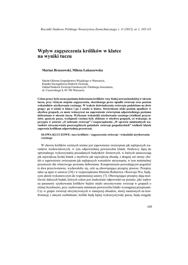 Roczniki Naukowe Polskiego Towarzystwa Zootechnicznego, t. 11 (2015), nr 1, 105-111 Wpływ zagęszczenia królików w klatce na wyniki tuczu Marian Brzozowski, Milena Łukaszewska Szkoła Główna Gospodarstwa Wiejskiego w Warszawie, Katedra Szczegółowej Hodowli Zwierząt, Zakład Hodowli Zwierząt Futerkowych i Drobnego Inwentarza, ul. Ciszewskiego 8, 02-786 Warszawa Celem pracy była ocena poziomu dobrostanu królików rasy białej nowozelandzkiej w okresie tuczu, przy różnym stopniu zagęszczenia, określonego przez upadki zwierząt oraz poziom wskaźników użytkowania rzeźnego. W trakcie doświadczenia zwierzęta podzielono na dwie grupy: po 4 sztuki w klatce i po 2 sztuki w klatce. Stwierdzono niski poziom upadków w obydwu grupach, co może wskazywać na zapewnienie zwierzętom odpowiedniego poziomu dobrostanu w okresie tuczu. Wyliczone wskaźniki użytkowania rzeźnego (wielkość przyrostów, spożycie paszy, wydajność rzeźna) były zbliżone w obydwu grupach, co wskazuje, że przyjęta w ustawie „O ochronie zwierząt” i rozporządzeniu „W sprawie minimalnych warunków utrzymywania poszczególnych gatunków zwierząt gospodarskich” wielkość klatek zapewnia królikom odpowiednią przestrzeń. SŁOWA KLUCZOWE: tucz królików / zagęszczenie zwierząt / wskaźniki użytkowania rzeźnego W chowie królików rzeźnych istotne jest zapewnienie zwierzętom jak najlepszych warunków środowiskowych, w tym odpowiedniej powierzchni klatek. Hodowcy dążą do optymalnego wykorzystania posiadanych budynków fermowych, w których umieszczają jak największą liczbę klatek z możliwie jak największą obsadą, z drugiej zaś strony chodzi o zapewnienie zwierzętom jak najlepszych warunków utrzymania, w tym minimalnej przestrzeni dla właściwego poziomu dobrostanu. Kompromisem pozwalającym pogodzić te dwa przeciwstawne, wydawałoby się, cele są obowiązujące przepisy prawne. Przepisy takie są ujęte w ustawie [10] i w rozporządzeniu Ministra Rolnictwa i Rozwoju Wsi, będącym aktem wykonawczym do wspomnianej ustawy [7]. Obowiązujące przepisy dają możliwość dalszych badań, których celem jest znalezienie odpowiedzi na pytanie: jaki wpływ na parametry użytkowania królików będzie miało utrzymywanie zwierząt w grupach o różnej liczebności, przy zachowaniu minimum powierzchni klatki wymaganej przepisami. Czy w grupie zwierząt utrzymywanych w mniejszej obsadzie, mniej narażonych na konfrontację z innymi osobnikami, króliki będą lepiej wykorzystywały paszę, będą osiągały 105 M. Brzozowski i M. Łukaszewska wyższą masę przyrostów, czy odwrotnie, w liczniejszej grupie, generującej więcej kontaktów socjalnych z innymi osobnikami w klatce może nastąpić obniżenie poziomu stresu przejawiające się poprawą uzyskiwanych parametrów ich użytkowania? Celem badań było określenie, czy zagęszczenie królików w klatce w okresie tuczu może mieć wpływ na najważniejsze parametry użytkowania rzeźnego. Materiał i metody Doświadczenie przeprowadzono na królikach rasy białej nowozelandzkiej utrzymywanych na fermie doświadczalnej Zakładu Hodowli i Użytkowania Zwierząt Futerkowych SGGW. Zwierzęta utrzymywano w klatkach w pomieszczeniu zamkniętym. Były to klatki dwupoziomowe w układzie półkaskady. Wymiary klatek (60 cm x 40 cm x 40 cm) były zgodnie z rozporządzeniem [7], odpowiednie dla 4 królików; w rozporządzeniu jest mowa o powierzchni 0,06 m2 na jednego królika o masie ciała do 2,5 kg w chowie grupowym. Każda klatka była wyposażona w poidło automatyczne kropelkowe oraz karmidło ze stałym dostępem do paszy. Zwierzęta były żywione mieszanką pełnoporcjową Rabbit Plus, o następującej zawartości składników odżywczych: białko ogólne 16,5%, włókno surowe 15,5%, tłuszcz surowy 2,4%, związki mineralne 7,5%. Doświadczenie trwało od czasu odsadzenia królików w wieku 35 dni do wieku 84 dni. Zwierzęta podzielono na grupy doświadczalne, według schematu podanego w tabeli 1. Tabela 1 – Table 1 Podział zwierząt na grupy doświadczalne Division of experimental animals into groups Grupa Group Liczba zwierząt w klatce (szt.) Number of animals per cage Liczba klatek Number of cages Liczba zwierząt w grupie (szt.) Number of animals per group 1 2 12 24 2 4 7 28 Liczba zwierząt w doświadczeniu (szt.) Number of animals in experiment 52 Obliczono następujące wskaźniki, za każdym razem porównując wyniki dla dwóch grup zwierząt (2 lub 4 osobniki w klatce): 1. Stan zdrowotny i upadki zwierząt w okresie tuczu (od 35. do 84. dnia). Parametr ten określano podczas cotygodniowych ważeń zwierząt, obserwując wszystkie zwierzęta i odnotowując zaobserwowane objawy biegunek. 2. Zmiana masy ciała zwierząt wyrażona w gramach (przyrost). Wartość tę wyliczono jako różnicę masy ciała na końcu i na początku doświadczenia. Przyrost masy ciała wyliczono dla każdego królika oddzielnie, a następnie wyliczono średnią dla grupy zwierząt (grupa 2 lub 4 zwierzęta w klatce). 106 Wpływ zagęszczenia królików w klatce na wyniki tuczu 3. Przyrosty królików w kolejnych tygodniach tuczu, wyrażone w g/dzień, w kolejnych tygodniach tuczu, liczone za cały okres tuczu (od 6. do 13. tygodnia), według wzoru: gdzie: P6 = M6−M5 7 P6 – średni dobowy przyrost (g) w 6. tygodniu (od 35. do 42. dnia), M6 – masa ciała (g) w wieku 6 tygodni (42 dni), M5 – masa ciała (g) w wieku 5 tygodni (35 dni). Wartości przyrostów wyliczono dla każdego królika oddzielnie, a następnie wyliczono średnią dla grupy zwierząt (grupa 2 lub 4 zwierzęta w klatce). W ten sam sposób wyliczano przyrosty w kolejnych tygodniach tuczu. 4. Spożycie paszy na 1 kg przyrostu za cały okres tuczu, wyrażone w kg paszy/kg przyrostu, wyliczone ze stosunku ilości pobranej paszy do wartości masy przyrostu. Spożycie paszy wyliczano dla całej klatki, po czym przeliczano je na pojedynczego królika w klatce, przez odnie