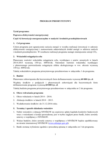 PROGRAM PRIORYTETOWY Tytuł programu: Poprawa efektywności energetycznej Część 4) Inwestycje energooszczędne w małych i średnich przedsiębiorstwach 1. Cel programu Celem programu jest ograniczenie zużycia energii w wyniku realizacji inwestycji w zakresie efektywności energetycznej i zastosowania odnawialnych źródeł energii w sektorze małych i średnich przedsiębiorstw. W rezultacie realizacji programu nastąpi zmniejszenie emisji CO2. 2. Wskaźniki osiągnięcia celu Planowane wartości wskaźnika osiągnięcia celu, wynikające z umów zawartych w latach 2014-2015 wynoszą 150 tys. MWh/rok. Natomiast wartości wskaźnika wynikające z planowanego potwierdzenia osiągnięcia efektu ekologicznego w ww. okresie wynoszą 150 tys. MWh/rok. Tabelę wskaźników programu priorytetowego przedstawiono w załączniku 1 do programu. 3. Budżet Planowane zobowiązania dla bezzwrotnych form dofinansowania wynoszą 60 000 tys. zł. Wypłaty środków z podjętych i planowanych zobowiązań dla bezzwrotnych form dofinansowania programu wynoszą 60 000 tys. zł. Tabelę budżetu programu priorytetowego przedstawiono w załączniku nr 2 do programu. 4. Okres wdrażania programu 1. Okres wdrażania w latach 2014 – 2016. 2. Alokacja środków w latach 2014 – 2015. 3. Wydatkowanie środków: do 31.12.2016 roku. 5. Terminy i sposób składania wniosków 1. Nabór wniosków o dotację NFOŚiGW na częściowe spłaty kapitału kredytów bankowych wraz z wnioskami o kredyt prowadzony jest w trybie ciągłym przez banki, które zawarły umowy o współpracy z NFOŚiGW. 2. Wykaz banków, które zawarły umowy o współpracy z NFOŚiGW będzie opublikowany na stronie internetowej NFOŚiGW (www.nfosigw.gov.pl). 3. Banki zostaną wyłonione zgodnie z procedurą opisaną w załączniku nr 3 do programu. 1 6. Podstawy prawne udzielenia dofinansowania 1. Ustawa z dnia 27 kwietnia 2001 r. – Prawo ochrony środowiska (t.j. Dz. U. z 2013 r. poz. 1232, z późn. zm.). 2. Pomoc publiczna udzielana będzie zgodnie z warunkami określonymi w rozporządzeniu Komisji (UE) nr 1407/2013 z dnia 18 grudnia 2013 r. w sprawie stosowania art. 107 i 108 Traktatu o funkcjonowaniu Unii Europejskiej do pomocy de minimis (Dz. Urz. UE L 352 z 24.12.2013, str. 1). 7. Szczegółowe zasady udzielania dofinansowania 7.1 Formy dofinansowania Dotacje na częściowe spłaty kapitału kredytów bankowych realizowane za pośrednictwem banku na podstawie umowy o współpracę zawartej z NFOŚiGW. 7.2 Intensywność dofinansowania 1) dotacja w wysokości: a) 10% kapitału kredytu bankowego wykorzystanego na sfinansowanie kosztów kwalifikowanych przedsięwzięć obejmujących realizację działań inwestycyjnych w zakresie poprawy efektywności energetycznej, b) 10% kapitału kredytu bankowego, wykorzystanego na sfinansowanie kosztów kwalifikowanych przedsięwzięć obejmujących realizację działań inwestycyjnych w zakresie termomodernizacji budynku/ów, c) 15% kapitału kredytu bankowego, wykorzystanego na sfinansowanie kosztów kwalifikowanych przedsięwzięć wymienionych w lit. a) lub b), w przypadku, gdy inwestycja została poprzedzona audytem energetycznym. Zakres rzeczowy zrealizowanego przedsięwzięcia musi wynikać z przeprowadzonego audytu energetycznego, d) dodatkowo do 15% kapitału kredytu bankowego na pokrycie poniesionych kosztów wdrożenia systemu zarządzania energią (SZE), jednak nie więcej niż 10 000 złotych, jeśli w ramach zrealizowanego przedsięwzięcia beneficjent wdroży SZE według zasad określonych przez NFOŚiGW; 2) przy ustalaniu wysokości dotacji uwzględnia się przepisy dotyczące dopuszczalności pomocy publicznej. 7.3 Warunki dofinansowania 1) warunki dla beneficjentów: a) wysokość kredytu z dotacją 1 wynosi do 100% kosztów kwalifikowanych przedsięwzięcia, b) kwota kredytu może przewyższać wysokość kosztów kwalifikowanych. Dotacją objęta jest wyłącznie część kredytu wykorzystana na koszty kwalifikowane przedsięwzięcia, c) wypłata dotacji następuje po zrealizowaniu przedsięwzięcia oraz zweryfikowaniu osiągnięcia efektu rzeczowego i ekologicznego, Kredyt z dotacją – kredyt, lub wyodrębniona część kredytu, udzielonego przez bank na koszty kwalifikowane przedsięwzięcia 1 2 d) dofinansowaniu nie podlegają przedsięwzięcia zakończone przed dniem zawarcia umowy o kredyt, objętej dotacją ze środków NFOŚiGW, e) dotacje na częściowe spłaty kapitału bankowego będą udzielane zgodnie z zasadami dopuszczalności pomocy publicznej, f) przy przeliczaniu kredytu z dotacją, stanowiącego równowartość w złotych polskich stosuje się średni kurs NBP z dnia podpisania umowy o kredyt, g) dla Inwestycji LEME oraz Inwestycji Wspomaganych budynek/ki zgłoszony/e do termomodernizacji winien/ny pozostawać w dysponowaniu beneficjenta, na podstawie jednej z następujących form władania nieruchomością: prawo własności, użytkowanie wieczyste, użytkowanie, najem lub dzierżawa, z tym, że umowa użytkowania, najmu oraz dzierżawy musi obowiązywać w okresie nie krótszym niż do końca planowanego okresu trwałości przedsięwzięcia; 2) warunki dla banków: a) dotacje na częściowe spłaty kapitału kredytów udzielane są w ramach limitu przyznanego bankowi przez NFOŚiGW, b) bank ustanawia zabezpieczenie udzielonego kredytu z dotacją. Bank gwarantuje zwrot środków z dotacji na rzecz NFOŚiGW w przypadkach określonych w umowie o współpracy zawartej między NFOŚiGW i bankiem, c) warunki współpracy, w tym tryb i terminy przekazywania bankom przez NFOŚiGW środków na dotacje na częściowe spłaty kapitału kredytów szczegółowo określają umowy o współpracy zawarte przez NFOŚiGW z bankami, d) monitorowanie i kontrolę prawidłowości realizacji przedsięwzięcia i wykorzystania środków z kredytu z dotacją przeprowadza bank, e) bank jako podmiot udzielający pomocy publicznej realizuje obowiązki związane z jej udzielaniem. 7.4 B