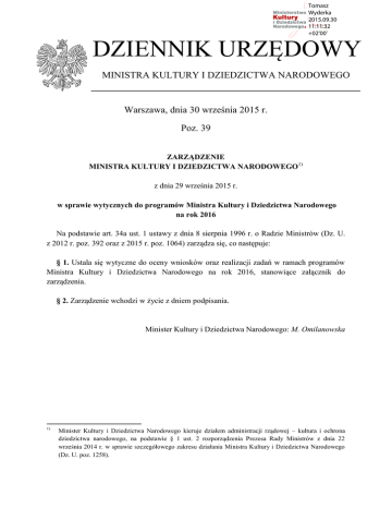 Tomasz Wyderka 2015.09.30 11:11:32 +02'00' DZIENNIK URZĘDOWY MINISTRA KULTURY I DZIEDZICTWA NARODOWEGO Warszawa, dnia 30 września 2015 r. Poz. 39 ZARZĄDZENIE MINISTRA KULTURY I DZIEDZICTWA NARODOWEGO1) z dnia 29 września 2015 r. w sprawie wytycznych do programów Ministra Kultury i Dziedzictwa Narodowego na rok 2016 Na podstawie art. 34a ust. 1 ustawy z dnia 8 sierpnia 1996 r. o Radzie Ministrów (Dz. U. z 2012 r. poz. 392 oraz z 2015 r. poz. 1064) zarządza się, co następuje: § 1. Ustala się wytyczne do oceny wniosków oraz realizacji zadań w ramach programów Ministra Kultury i Dziedzictwa Narodowego na rok 2016, stanowiące załącznik do zarządzenia. § 2. Zarządzenie wchodzi w życie z dniem podpisania. Minister Kultury i Dziedzictwa Narodowego: M. Omilanowska 1) Minister Kultury i Dziedzictwa Narodowego kieruje działem administracji rządowej – kultura i ochrona dziedzictwa narodowego, na podstawie § 1 ust. 2 rozporządzenia Prezesa Rady Ministrów z dnia 22 września 2014 r. w sprawie szczegółowego zakresu działania Ministra Kultury i Dziedzictwa Narodowego (Dz. U. poz. 1258). Dziennik Urzędowy Ministra Kultury i Dziedzictwa Narodowego -2- Poz. 39 Załącznik do zarządzenia Ministra Kultury i Dziedzictwa Narodowego z dnia 29 września 2015 r. (poz. 39) Wytyczne do oceny wniosków oraz realizacji zadań w ramach programów Ministra Kultury i Dziedzictwa Narodowego na rok 2016 Przepisy ogólne 1) 2) 3) 4) 5) § 1. Użyte w wytycznych określenia oznaczają: minister albo ministerstwo – Minister Kultury i Dziedzictwa Narodowego albo Ministerstwo Kultury i Dziedzictwa Narodowego; programy – programy, a także priorytety obejmujące część zadań organizacyjnie wydzieloną w ramach tych programów, z wyłączeniem programów objętych finansowaniem ze środków budżetu państwa realizowanych przez państwowe instytucje kultury jako zadanie własne, ogłaszane przez ministra, w związku z: a) art. 87 ust. 7 ustawy z dnia 19 listopada 2009 r. o grach hazardowych (Dz. U. z 2015 r. poz. 612, z późn. zm.), b) art. 9a w związku z art. 28 ust. 1a ustawy z dnia 25 października 1991 r. o organizowaniu i prowadzeniu działalności kulturalnej (Dz. U. z 2012 r. poz. 406, z późn. zm.), c) art. 43 ust. 2 ustawy z dnia 13 listopada 2003 r. o dochodach jednostek samorządu terytorialnego (Dz. U. z 2015 r. poz. 513, z późn. zm.), d) art. 80 ust. 1 ustawy z dnia 23 lipca 2003 r. o ochronie zabytków i opiece nad zabytkami (Dz. U. z 2014 r. poz. 1446, z późn. zm.); instytucja zarządzająca – komórka organizacyjna ministerstwa lub państwowa instytucja kultury, wyznaczona przez ministra do zarządzania danym programem; System Zarządzania Programami Ministra – system informatyczny funkcjonujący we wszystkich instytucjach zarządzających służący do obsługi procedur dotyczących programów, w tym rejestracji wniosków, rejestracji danych związanych z ich oceną, a także danych dotyczących realizacji i rozliczenia finansowanych zadań; Elektroniczne Biuro Obsługi Interesanta (EBOI) – system powiązany funkcjonalnie z Systemem Zarządzania Programami Ministra, zapewniający komunikację elektroniczną pomiędzy wnioskodawcami a instytucjami zarządzającymi, którego podstawową funkcją jest sporządzanie wniosków w postaci elektronicznej i przesyłanie ich do instytucji zarządzających; Dziennik Urzędowy Ministra Kultury i Dziedzictwa Narodowego -3- Poz. 39 6) wnioski – wnioski o dofinansowanie zadań realizowanych ze środków pozostających w dyspozycji ministra, wypełniane i wysyłane przez wnioskodawców za pośrednictwem systemu EBOI; 7) wnioskodawcy – podmioty składające wniosek do danego programu; 8) beneficjenci – wnioskodawcy, których wnioski zostały rozpatrzone pozytywnie i którym przyznano dofinansowanie; 9) zadania – działania będące przedmiotem wniosków, które mogą być dofinansowywane zgodnie z zakresem określonym szczegółowo w regulaminie danego programu; 10) uchybienia formalne – wady wniosku, które nie mają wpływu na możliwość udzielenia dofinansowania dla zadania w ramach danego programu i które wnioskodawca może poprawić po terminie zamknięcia naboru do programu; 11) błędy formalne – wady wniosku wynikające z niedostosowania zadania do wymagań związanych z zakresem danego programu, które uniemożliwiają udzielenie dofinansowania dla zadania w ramach danego programu i których wnioskodawca nie może poprawić po terminie zamknięcia naboru do programu; 12) zespół sterujący – powoływany przez ministra zespół doradczy, w ramach którego każdy z członków zespołu dokonuje samodzielnej oceny wniosków złożonych w danym programie; 13) rekomendacja – propozycja dyrektora instytucji zarządzającej przedstawiana ministrowi dotycząca dofinansowania dla danego zadania; 14) lista preferencji – lista, na której dyrektor instytucji zarządzającej przedstawia ministrowi do zatwierdzenia oceny końcowe wniosków wraz z rekomendacjami; 15) konflikt interesów – sytuacja w której interes prywatny pracownika instytucji zarządzającej lub innej osoby powołanej przez ministra do realizacji procedur w ramach programu wpływa na bezstronne i obiektywne wykonywanie powierzonych jej czynności; 16) interes prywatny – jakakolwiek korzyść dla pracownika instytucji zarządzającej lub innej osoby powołanej przez ministra do realizacji procedur w ramach programu, jego rodziny, osób spokrewnionych lub bliskich, a także osób albo organizacji z którymi ma albo miał on kontakty zawodowe. § 2. 1. Minister ogłasza w Biuletynie Informacji Publicznej informację o programach objętych finansowaniem ze środków budżetu państwa oraz z funduszy celowych wraz z regulaminami tych programów. 2. Regulamin programu zawiera w szczególności: 1) cele; 2) nazwę instytucji zarządzającej; 3) rodzaje kwalifikujących się zadań; 4) prognozowaną, w danym roku kalendarzowym, wielkość środk