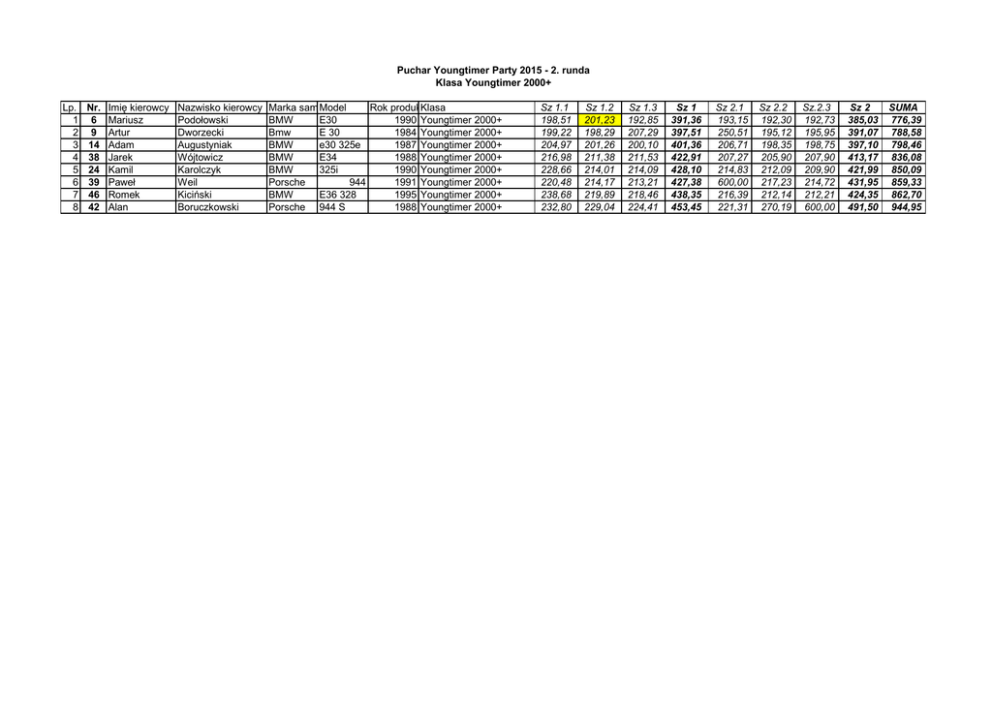 Puchar Youngtimer Party 2015 - 2. runda Klasa Youngtimer 2000+ Lp. 1 2 3 4 5 6 7 8 Nr. 6 9 14 38 24 39 46 42 Imię kierowcy Mariusz Artur Adam Jarek Kamil Paweł Romek Alan Nazwisko kierowcy Podołowski Dworzecki Augustyniak Wójtowicz Karolczyk Weil Kiciński Boruczkowski Marka samochodu Model Rok produkcji Klasa BMW E30 1990 Youngtimer 2000+ Bmw E 30 1984 Youngtimer 2000+ BMW e30 325e 1987 Youngtimer 2000+ BMW E34 1988 Youngtimer 2000+ BMW 325i 1990 Youngtimer 2000+ Porsche 944 1991 Youngtimer 2000+ BMW E36 328 1995 Youngtimer 2000+ Porsche 944 S 1988 Youngtimer 2000+ Sz 1.1 198,51 199,22 204,97 216,98 228,66 220,48 238,68 232,80 Sz 1.2 201,23 198,29 201,26 211,38 214,01 214,17 219,89 229,04 Sz 1.3 192,85 207,29 200,10 211,53 214,09 213,21 218,46 224,41 Sz 1 391,36 397,51 401,36 422,91 428,10 427,38 438,35 453,45 Sz 2.1 193,15 250,51 206,71 207,27 214,83 600,00 216,39 221,31 Sz 2.2 192,30 195,12 198,35 205,90 212,09 217,23 212,14 270,19 Sz.2.3 192,73 195,95 198,75 207,90 209,90 214,72 212,21 600,00 Sz 2 385,03 391,07 397,10 413,17 421,99 431,95 424,35 491,50 SUMA 776,39 788,58 798,46 836,08 850,09 859,33 862,70 944,95