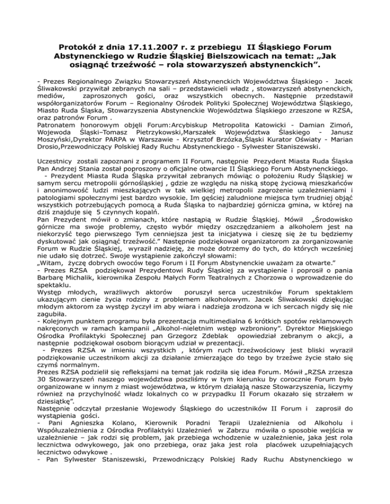 Protokół z dnia 17.11.2007 r. z przebiegu II Śląskiego Forum Abstynenckiego w Rudzie Śląskiej Bielszowicach na temat: „Jak osiągnąć trzeźwość – rola stowarzyszeń abstynenckich”. - Prezes Regionalnego Związku Stowarzyszeń Abstynenckich Województwa Śląskiego - Jacek Śliwakowski przywitał zebranych na sali – przedstawicieli władz , stowarzyszeń abstynenckich, mediów, zaproszonych gości, oraz wszystkich obecnych. Następnie przedstawił współorganizatorów Forum – Regionalny Ośrodek Polityki Społecznej Województwa Śląskiego, Miasto Ruda Śląska, Stowarzyszenia Abstynenckie Województwa Śląskiego zrzeszone w RZSA, oraz patronów Forum . Patronatem honorowym objęli Forum:Arcybiskup Metropolita Katowicki - Damian Zimoń, Wojewoda Śląski–Tomasz Pietrzykowski,Marszałek Województwa Ślaskiego - Janusz Moszyński,Dyrektor PARPA w Warszawie - Krzysztof Brzózka,Śląski Kurator Oświaty - Marian Drosio,Przewodniczący Polskiej Rady Ruchu Abstynenckiego - Sylwester Staniszewski. Uczestnicy zostali zapoznani z programem II Forum, następnie Prezydent Miasta Ruda Śląska Pan Andrzej Stania został poproszony o oficjalne otwarcie II Śląskiego Forum Abstynenckiego. - Prezydent Miasta Ruda Śląska przywitał zebranych mówiąc o położeniu Rudy Śląskiej w samym sercu metropolii górnośląskiej , gdzie ze względu na niską stopę życiową mieszkańców i anonimowość ludzi mieszkających w tak wielkiej metropolii zagrożenie uzależnieniami i patologiami społecznymi jest bardzo wysokie. Im gęściej zaludnione miejsca tym trudniej objąć wszystkich potrzebujących pomocą a Ruda Śląska to najbardziej górnicza gmina, w której na dziś znajduje się 5 czynnych kopalń. Pan Prezydent mówił o zmianach, które nastąpią w Rudzie Śląskiej. Mówił „Środowisko górnicze ma swoje problemy, często wybór między oszczędzaniem a alkoholem jest na niekorzyść tego pierwszego Tym cenniejsza jest ta inicjatywa i cieszę się że tu będziemy dyskutować jak osiągnąć trzeźwość.” Następnie podziękował organizatorom za zorganizowanie Forum w Rudzie Śląskiej, wyraził nadzieję, że może dotrzemy do tych, do których wcześniej nie udało się dotrzeć. Swoje wystąpienie zakończył słowami: „Witam, życzę dobrych owoców tego Forum i II Forum Abstynenckie uważam za otwarte.” - Prezes RZSA podziękował Prezydentowi Rudy Śląskiej za wystąpienie i poprosił o pania Barbarę Michalik, kierownika Zespołu Małych Form Teatralnych z Chorzowa o wprowadzenie do spektaklu. Występ młodych, wrażliwych aktorów poruszył serca uczestników Forum spektaklem ukazującym cienie życia rodziny z problemem alkoholowym. Jacek Śliwakowski dziękując młodym aktorom za występ życzył im aby wiara i nadzieja zrodzona w ich sercach nigdy się nie zagubiła. - Kolejnym punktem programu była prezentacja multimedialna 6 krótkich spotów reklamowych nakręconych w ramach kampanii „Alkohol-nieletnim wstęp wzbroniony”. Dyrektor Miejskiego Ośrodka Profilaktyki Społecznej pan Grzegorz Zdeblak opowiedział zebranym o akcji, a następnie podziękował osobom biorącym udział w prezentacji. - Prezes RZSA w imieniu wszystkich , którym ruch trzeźwościowy jest bliski wyraził podziękowanie uczestnikom akcji za działanie zmierzające do tego by trzeźwe życie stało się czymś normalnym. Prezes RZSA podzielił się refleksjami na temat jak rodziła się idea Forum. Mówił „RZSA zrzesza 30 Stowarzyszeń naszego województwa poszliśmy w tym kierunku by corocznie Forum było organizowane w innym z miast województwa, w którym działają nasze Stowarzyszenia, liczymy również na przychylność władz lokalnych co w przypadku II Forum okazało się strzałem w dziesiątkę”. Następnie odczytał przesłanie Wojewody Śląskiego do uczestników II Forum i zaprosił do wystąpienia gości. - Pani Agnieszka Kolano, Kierownik Poradni Terapii Uzależnienia od Alkoholu i Współuzależnienia z Ośrodka Profilaktyki Uzależnień w Zabrzu mówiła o sposobie wejścia w uzależnienie – jak rodzi się problem, jak przebiega wchodzenie w uzależnienie, jaka jest rola lecznictwa odwykowego, jak ono przebiega, oraz jaka jest rola placówek uzupełniających lecznictwo odwykowe . - Pan Sylwester Staniszewski, Przewodniczący Polskiej Rady Ruchu Abstynenckiego w Skierniewicach mówił o Roli Stowarzyszeń Abstynenckich, w których działania odbywają się głównie na 2 płaszczyznach: ruch samopomocowy nakierowany na pomoc indywidualną osobie z problemem, oraz ruch samopomocowy jako partner w działaniu samorządów lokalnych. Stowarzyszenia, a wcześniej kluby istnieją od 50 lat, są miejscem naturalnym o dużej skuteczności gdzie zwracają się o pomoc ludzie uzależnieni i ich rodziny. Mają do spełnienia 3 zadania: motywowanie osób do podjęcia leczenia odwykowego, rehabilitacja po chorobie – po leczeniu przez 2, 3, 4 lata osoby uzależnione pracują nad dalszą trzeźwością, oraz szeroko rozumiane działania profilaktyczne. -Wystąpienie dyrektora PARPA Krzysztofa Brzóski na temat „ Rola Komisji ds. Rozwiązywania Problemów Alkoholowych.”. Dyrektor przedstawił zebranym wyniki badań wykonanych na potrzeby PARPA. Badania wykonywane na terenie całego kraju pokazują obniżenie się progu inicjacji alkoholowej, malejące tendencje spożycia alkoholu wśród młodzieży, wzrasta spożycie alkoholu przez młode dziewczyny (ciąża z alkoholem). Zebrani obejrzeli spot PARPA „Ciąża bez alkoholu”. Dyrektor Brzóska omówił obowiązujący system- samorządy lokalne ( zadania gmin, co może i powinna robić, jakie ma kompetencje z zakresu problematyki alkoholowej) i ich działania na własnym terenie, samorządy wojewódzkie, ministerstwo zdrowia, PARPA. Następnie nakreślił zadania, które realizują Komisje Rozwiązywania Problemów Alkoholowych, projekt rozszerzenia ich kompetencji, sprawę przeszkolenia członków,