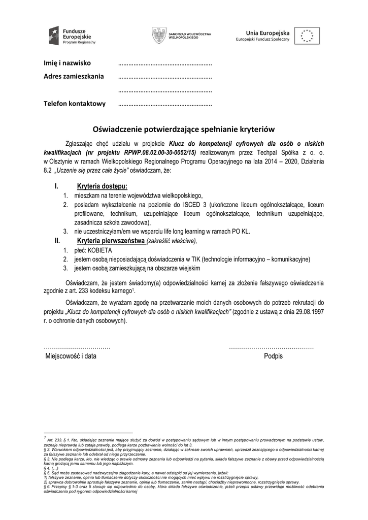 Imię i nazwisko ………………………………………………. Adres zamieszkania ………………………………………………. ………………………………………………. Telefon kontaktowy ………………………………………………. Oświadczenie potwierdzające spełnianie kryteriów Zgłaszając chęć udziału w projekcie Klucz do kompetencji cyfrowych dla osób o niskich kwalifikacjach (nr projektu RPWP.08.02.00-30-0052/15) realizowanym przez Techpal Spółka z o. o. w Olsztynie w ramach Wielkopolskiego Regionalnego Programu Operacyjnego na lata 2014 – 2020, Działania 8.2 „Uczenie się przez całe życie” oświadczam, że: I. Kryteria dostępu: 1. mieszkam na terenie województwa wielkopolskiego, 2. posiadam wykształcenie na poziomie do ISCED 3 (ukończone liceum ogólnokształcące, liceum profilowane, technikum, uzupełniające liceum ogólnokształcące, technikum uzupełniające, zasadnicza szkoła zawodowa), 3. nie uczestniczyłam/em we wsparciu life long learning w ramach PO KL. II. Kryteria pierwszeństwa (zakreślić właściwe), 1. płeć: KOBIETA 2. jestem osobą nieposiadającą doświadczenia w TIK (technologie informacyjno – komunikacyjne) 3. jestem osobą zamieszkującą na obszarze wiejskim Oświadczam, że jestem świadomy(a) odpowiedzialności karnej za złożenie fałszywego oświadczenia zgodnie z art. 233 kodeksu karnego1. Oświadczam, że wyrażam zgodę na przetwarzanie moich danych osobowych do potrzeb rekrutacji do projektu „Klucz do kompetencji cyfrowych dla osób o niskich kwalifikacjach” (zgodnie z ustawą z dnia 29.08.1997 r. o ochronie danych osobowych). …………………………… Miejscowość i data 1 …………………………………… Podpis Art. 233. § 1. Kto, składając zeznanie mające służyć za dowód w postępowaniu sądowym lub w innym postępowaniu prowadzonym na podstawie ustaw, zeznaje nieprawdę lub zataja prawdę, podlega karze pozbawienia wolności do lat 3. § 2. Warunkiem odpowiedzialności jest, aby przyjmujący zeznanie, działając w zakresie swoich uprawnień, uprzedził zeznającego o odpowiedzialności karnej za fałszywe zeznanie lub odebrał od niego przyrzeczenie. § 3. Nie podlega karze, kto, nie wiedząc o prawie odmowy zeznania lub odpowiedzi na pytania, składa fałszywe zeznanie z obawy przed odpowiedzialnością karną grożącą jemu samemu lub jego najbliższym. § 4. (…) § 5. Sąd może zastosować nadzwyczajne złagodzenie kary, a nawet odstąpić od jej wymierzenia, jeżeli: 1) fałszywe zeznanie, opinia lub tłumaczenie dotyczy okoliczności nie mogących mieć wpływu na rozstrzygnięcie sprawy, 2) sprawca dobrowolnie sprostuje fałszywe zeznanie, opinię lub tłumaczenie, zanim nastąpi, chociażby nieprawomocne, rozstrzygnięcie sprawy. § 6. Przepisy § 1-3 oraz 5 stosuje się odpowiednio do osoby, która składa fałszywe oświadczenie, jeżeli przepis ustawy przewiduje możliwość odebrania oświadczenia pod rygorem odpowiedzialności karnej