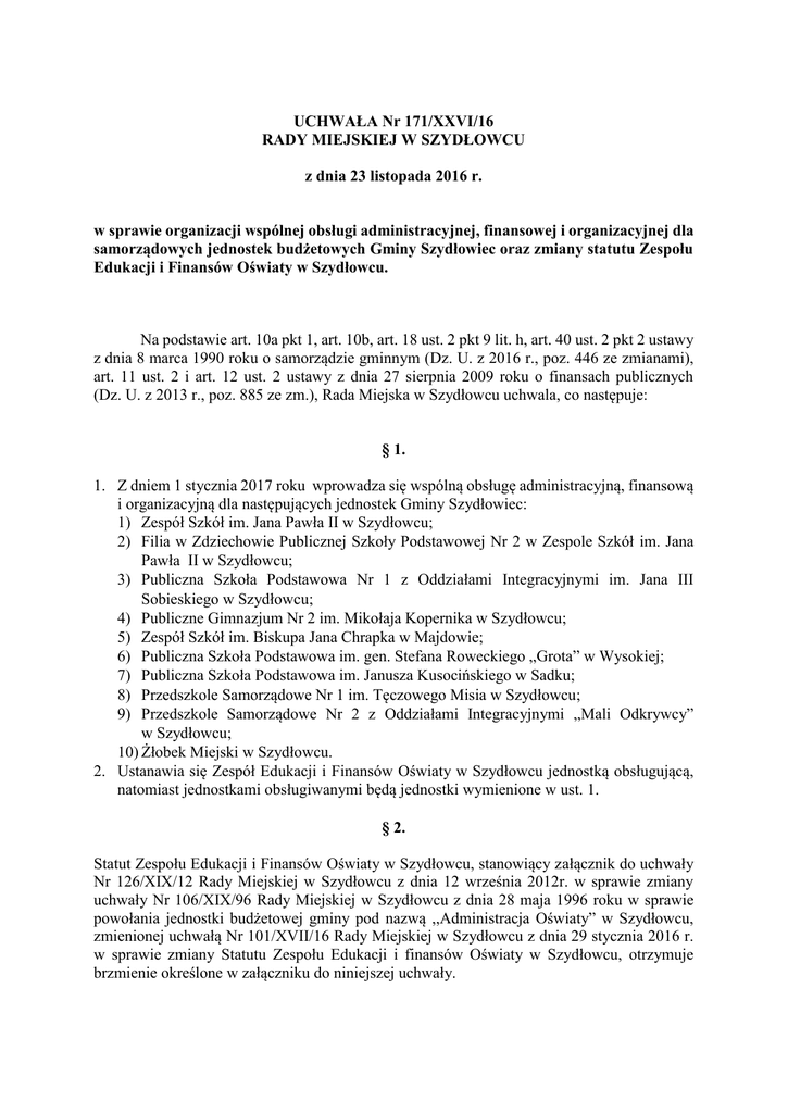UCHWAŁA Nr 171/XXVI/16 RADY MIEJSKIEJ W SZYDŁOWCU z dnia 23 listopada 2016 r. w sprawie organizacji wspólnej obsługi administracyjnej, finansowej i organizacyjnej dla samorządowych jednostek budżetowych Gminy Szydłowiec oraz zmiany statutu Zespołu Edukacji i Finansów Oświaty w Szydłowcu. Na podstawie art. 10a pkt 1, art. 10b, art. 18 ust. 2 pkt 9 lit. h, art. 40 ust. 2 pkt 2 ustawy z dnia 8 marca 1990 roku o samorządzie gminnym (Dz. U. z 2016 r., poz. 446 ze zmianami), art. 11 ust. 2 i art. 12 ust. 2 ustawy z dnia 27 sierpnia 2009 roku o finansach publicznych (Dz. U. z 2013 r., poz. 885 ze zm.), Rada Miejska w Szydłowcu uchwala, co następuje: § 1. 1. Z dniem 1 stycznia 2017 roku wprowadza się wspólną obsługę administracyjną, finansową i organizacyjną dla następujących jednostek Gminy Szydłowiec: 1) Zespół Szkół im. Jana Pawła II w Szydłowcu; 2) Filia w Zdziechowie Publicznej Szkoły Podstawowej Nr 2 w Zespole Szkół im. Jana Pawła II w Szydłowcu; 3) Publiczna Szkoła Podstawowa Nr 1 z Oddziałami Integracyjnymi im. Jana III Sobieskiego w Szydłowcu; 4) Publiczne Gimnazjum Nr 2 im. Mikołaja Kopernika w Szydłowcu; 5) Zespół Szkół im. Biskupa Jana Chrapka w Majdowie; 6) Publiczna Szkoła Podstawowa im. gen. Stefana Roweckiego „Grota” w Wysokiej; 7) Publiczna Szkoła Podstawowa im. Janusza Kusocińskiego w Sadku; 8) Przedszkole Samorządowe Nr 1 im. Tęczowego Misia w Szydłowcu; 9) Przedszkole Samorządowe Nr 2 z Oddziałami Integracyjnymi „Mali Odkrywcy” w Szydłowcu; 10) Żłobek Miejski w Szydłowcu. 2. Ustanawia się Zespół Edukacji i Finansów Oświaty w Szydłowcu jednostką obsługującą, natomiast jednostkami obsługiwanymi będą jednostki wymienione w ust. 1. § 2. Statut Zespołu Edukacji i Finansów Oświaty w Szydłowcu, stanowiący załącznik do uchwały Nr 126/XIX/12 Rady Miejskiej w Szydłowcu z dnia 12 września 2012r. w sprawie zmiany uchwały Nr 106/XIX/96 Rady Miejskiej w Szydłowcu z dnia 28 maja 1996 roku w sprawie powołania jednostki budżetowej gminy pod nazwą ,,Administracja Oświaty” w Szydłowcu, zmienionej uchwałą Nr 101/XVII/16 Rady Miejskiej w Szydłowcu z dnia 29 stycznia 2016 r. w sprawie zmiany Statutu Zespołu Edukacji i finansów Oświaty w Szydłowcu, otrzymuje brzmienie określone w załączniku do niniejszej uchwały. § 3. Wykonanie uchwały powierza się Burmistrzowi Szydłowca. § 4. Uchwała wchodzi w życie po upływie 14 dni od daty ogłoszenia w Dzienniku Urzędowym Województwa Mazowieckiego, z mocą obowiązującą od dnia 1 stycznia 2017 r. Przewodniczący Rady Miejskiej Marek Artur Koniarczyk Załącznik do Uchwały Nr 171/XXVI/16 Rady Miejskiej w Szydłowcu z dnia 23 listopada 2016 r. Statut Zespołu Edukacji i Finansów Oświaty w Szydłowcu. Postanowienia ogólne § 1. Zespół Edukacji i Finansów Oświaty w Szydłowcu, zwany dalej Zespołem, jest jednostką budżetową Gminy Szydłowiec, nie posiadającą osobowości prawnej, realizującą zadania oświatowe oraz realizującą, jako jednostka obsługująca, zadania w zakresie obsługi administracyjnej, finansowej i organizacyjnej publicznych szkół i przedszkoli, dla których organem prowadzącym jest Gmina Szydłowiec oraz Żłobka Miejskiego w Szydłowcu, zwanych dalej jednostkami obsługiwanymi. § 2. Zespół działa na podstawie niniejszego Statutu. § 3. 1. Zespół ma swoją siedzibę w Szydłowcu. 2. Zespół działa w granicach administracyjnych Gminy Szydłowiec. 3. Zespół Edukacji i Finansów Oświaty w Szydłowcu używa nazwy skróconej ZEiFO. Przedmiot działania § 4. Do zadań Zespołu należy: 1) obsługa administracyjna, finansowa i organizacyjna jednostek obsługiwanych, w szczególności: a) prowadzenie rachunkowości i sprawozdawczości w całości, b) prowadzenie obsługi kasowej i bankowej, c) przygotowanie list płatniczych, organizowanie wypłat wynagrodzeń i wystawianie zaświadczeń dla pracowników, d) sporządzanie wymaganych sprawozdań z zakresu realizowanych zadań finansowych i budżetowych, funduszu płac i zatrudnienia oraz przedkładanie ich odpowiednim organom, e) obsługa finansowo-księgowa zakładowego funduszu świadczeń socjalnych, f) dokonywanie analiz finansowych, g) gromadzenie i przechowywanie dokumentacji finansowo-księgowej, h) przeprowadzanie postępowań o udzielenie zamówień publicznych w zakresie prowadzonej działalności oraz w imieniu i na rzecz jednostek obsługiwanych; 2) wykonywanie zadań wynikających z przepisów ustawy o systemie oświaty, w szczególności: 3) 4) 5) 6) a) prowadzenie spraw związanych z zakładaniem i prowadzeniem przedszkoli i szkół publicznych, b) prowadzenie spraw związanych z ustalaniem sieci publicznych przedszkoli, c) prowadzenie spraw dotyczących ustalenia planu sieci publicznych szkół podstawowych i gimnazjów oraz granic ich obwodów, d) prowadzenie spraw dotyczących powierzenia stanowiska dyrektora szkoły lub placówki oświatowej, e) prowadzenie spraw dotyczących likwidacji lub przekształcenia szkoły, f) prowadzenie spraw dotyczących przekazania szkół osobom fizycznym lub prawnym nie będących jednostkami samorządu terytorialnego, g) prowadzenie spraw dotyczących łączenia szkół różnych typów lub placówek w zespoły, h) prowadzenie ewidencji szkół i placówek niepublicznych, i) prowadzenie spraw dotyczących nadawania i cofania szkołom niepublicznym uprawnień szkoły publicznej, j) prowadzenie spraw dotyczących udzielania i rozliczania dotacji dla szkół niepublicznych posiadających uprawnienia szkoły publicznej, przedszkoli niepublicznych oraz innych form wychowania przedszkolnego oraz kontrola w tym zakresie, k) analizowanie projektów organizacyjnych obsługiwanych jednostek pod kątem zgodności z obowiązującymi przepisami prawa i zabezpieczenia środków finansowych, l) koordynowanie spraw w zakresie nauczania indywidualnego oraz tworzenia klas integracyjnych w szkołach podstawowych i oddział