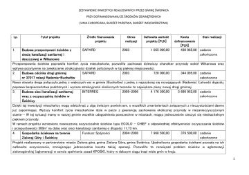 ZESTAWIENIE INWESTYCJI REALIZOWNYCH PRZEZ GMINĘ ŚWIDNICA PRZY DOFINANSOWANIU ZE ŚRODKÓW ZEWNĘTRZNYCH (UNIA EUROPEJSKA, BUDŻET PAŃSTWA, BUDŻET WOJEWÓDZTWA) Lp. Tytuł projektu Źródło finansowania projektu Okres realizacji Całkowita wartość projektu [PLN] Kwota dofinansowania [PLN] Stan realizacji 1. Budowa przepompowni ścieków z SAPARD 2003 1 055 000,00 430 965,00 zadanie siecią kanalizacji sanitarnej i zakończone deszczowej w Wilkanowie Przepompownia ścieków poprawiła komfort życia mieszkańców, pozwoliła zachować dziewiczy charakter przyrody wokół Wilkanowa oraz wpływa pozytywnie na zwiększenie atrakcyjności działek położonych w tej pięknej miejscowości. 2. Budowa odcinka drogi gminnej SAPARD 2003 720 000,00 344 095,00 zadanie nr 37017 relacji Radomia-Buchałów zakończone Nowo otwarta droga połączyła jedną z większych wsi w gminie (Buchałów) z jedną z najszybciej się rozwijających (Radomia). Łatwość dojazdu, poprawa bezpieczeństwa podróżnych i wyższa atrakcyjność okolicznych terenów to największe plusy nowej drogi gminnej. 3. Budowa sieci kanalizacji sanitarnej INTERREG 2005-2006 4 176 300,00 3 690 952,00 zadanie wraz z oczyszczalnią ścieków w zakończone Świdnicy Dzięki tej inwestycji mieszkańcy mogą odetchnąć z ulgą świeżym powietrzem, o wszelkich zmartwieniach związanych z nieczystościami dawno już zapominając. Wyższy komfort życia mieszkańców idzie w parze z gwarancją zachowania okolicznej przyrody w niezanieczyszczonym stanie… W tej sytuacji mamy w naszej gminie wszelkie udogodnienia powszechne w miastach, mogąc jednocześnie cieszyć się nieskazitelnym pięknem przyrody. W ramach projektu wzniesiono nowoczesną oczyszczalnie ścieków typu ECOLO – CHIEF o odpowiedniej efektywności oczyszczania ścieków i przepustowości 300m³ na dobę oraz sieci kanalizacji sanitarnej o długości 11,73 km. 4. Gospodarka ściekowa na terenie Fundusz Spójności 2004-2008 7 968 500,00 379 500,00 zadanie Zielonej Góry i Świdnicy zakończone Projekt realizowany w partnerstwie: miasto Zielona góra, gmina Zielona Góra, gmina Świdnica. Ujednolicona gospodarka ściekami pozwala na ich całkowite oczyszczenie, zmniejszając jednocześnie koszta takiej operacji. Pozwoliło to rozwiązać problem ścieków w aglomeracji zielonogórskiej (aglomeracji w sensie spełnienia zasad KPOŚK), który w dalszym ciągu trapi wiele gmin w kraju. 1 5. Rozbudowa szkoły w Świdnicy pod potrzeby gimnazjum ZPORR 2004-2006, 2005 948 403,92 632 627,91 zadanie Priorytet V. Rozwój zakończone lokalny Edukacja dzieci to najlepsza inwestycja… w ramach projektu dobudowano do istniejącej infrastruktury budynek, w którym dzisiaj mieści się Gimnazjum Świdnickie. Dzisiejszy Zespół Szkół w Świdnicy może pochwalić się jedną z najlepszych baz dydaktycznych w kraju. Wyremontowane i bogato wyposażone sale przedmiotowe, szerokopasmowy Internet, liczne kluby i kółka zainteresowań, a także niezwykle zaangażowana kadra nauczycielska, mówią same za siebie. Szkoła razem z Urzędem Gminy planuje już kolejne inwestycje: budowę wielofunkcyjnego boiska, czy unikatowej astro bazy – to tylko wierzchołek góry pomysłów. Najciekawsze są jednak efekty – nasi uczniowie wg oficjalnych statystyk egzaminacyjnych MEN, plasują się w ścisłej krajowej czołówce! Aż chce się uczyć! Rozbudowa szkoły w ramach projektu obejmowała dobudowanie dwukondygnacyjnego segmentu o powierzchni użytkowej 577,7m². W wyniku rozbudowy powstało 5 nowych sal lekcyjnych, nowoczesne sanitariaty, przestrzeń na szafki uczniowskie, gabinet pielęgniarski i dentystyczny. Budżet projektu wynosił 6.850.314,26 PLN, w tym dofinansowanie z funduszu ZPORR w kwocie 3.328.920,93 PLN. 6. Budowa wielofunkcyjnego boiska Ministerstwo Sportu i 2009 481 203,56 200 000,00 zadanie sportowego w miejscowości Słone w Turystyki – Fundusz zakończone Gminie Świdnica Rozwoju Kultury Fizycznej Wielofunkcyjne boisko w Słonym pozwoliło wszystkim spragnionym wysiłku fizycznego zakosztować magii sportu. Na pięknie położonym obiekcie, można zagrać w piłkę nożną, siatkówkę, koszykówkę, czy rozegrać wielkiego tenisowego szlema – można po prostu realizować pasję, relaksując się ze znajomymi na świeżym powietrzu – kto wie, może na którymś z naszych boisk, wyrosną nam następcy Agnieszki Radwańskiej, albo Roberta Lewandowskiego? W ramach projektu wzniesiono boisko 1188m². W jego skład wchodzą boiska do piłki nożnej, ręcznej i siatkówki. Korty do tenisa ziemnego oraz 2 boiska do koszykówki. Teren boiska został ogrodzony 4m siatką, pełniącą jednocześnie funkcję piłko chwytów. Wartość inwestycji 481.203,56 PLN. Pozyskano dofinansowanie z Ministerstwa Sportu i Turystyki w wysokości 200.000,00 PLN. 7. Budowa drogi o szerokości 5m z Narodowy Program 2009 1 275 186,66 637 596,58 zadanie jednostronnym chodnikiem o Przebudowy Dróg zakończone szerokości 1,5m, odcinka kanalizacji Lokalnych 2008-2011 deszczowej oraz odcinka („schetynówka”) energetycznej linii kablowej nn. 0,4kV oświetlenia ulicznego w Wilkanowie Droga ta pozwoliła okolicznym mieszkańcom na bezproblemowy dojazd do swoich posesji, wpłynęła również znacząco na poprawę bezpieczeństwa – dzięki chodnikowi i oświetleniu ulicznemu, wszyscy korzystający z tego odcinka mogą czuć się bezpieczniej. Warto również 2 podkreślić, że dzięki oświetleniu ulicy, Wilkanowo wzbogaciło się o kolejny urokliwy i spokojny zakątek, rozświetlany nocą ciepłym światłem latarni oświetlających drogę do domu. W ramach projektu zbudowano drogę o szerokości 5m (nawierzchnia asfaltowa 6011m²) z jednostronnym chodnikiem o szerokości 1,5m (1323m²), odcinka kanalizacji deszczowej (1098mb) oraz odcinka energetycznej linii kablowej nn. 0,4kV oświetlenia ulicznego w Wilkanowie. Wartość projektu 1.275.186,66 PLN w tym dofinansowanie 637.596,58 PLN z Nar
