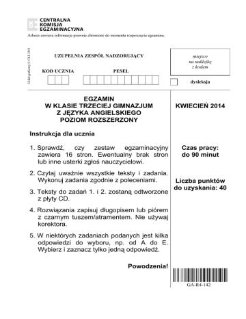 Układ graficzny © CKE 2013 Arkusz zawiera informacje prawnie chronione do momentu rozpoczęcia egzaminu. UZUPEŁNIA ZESPÓŁ NADZORUJĄCY KOD UCZNIA PESEL miejsce na naklejkę z kodem dysleksja EGZAMIN W KLASIE TRZECIEJ GIMNAZJUM Z JĘZYKA ANGIELSKIEGO POZIOM ROZSZERZONY KWIECIEŃ 2014 Instrukcja dla ucznia 1. Sprawdź, czy zestaw egzaminacyjny zawiera 16 stron. Ewentualny brak stron lub inne usterki zgłoś nauczycielowi. 2. Czytaj uważnie wszystkie teksty i zadania. Wykonuj zadania zgodnie z poleceniami. 3. Teksty do zadań 1. i 2. zostaną odtworzone z płyty CD. Czas pracy: do 90 minut Liczba punktów do uzyskania: 40 4. Rozwiązania zapisuj długopisem lub piórem z czarnym tuszem/atramentem. Nie używaj korektora. 5. W niektórych zadaniach podanych jest kilka odpowiedzi do wyboru, np. od A do E. Wybierz i zaznacz tylko jedną odpowiedź. Powodzenia! GA-R4-142 Zadanie 1. (0–6) Usłyszysz dwukrotnie dwa teksty. Na podstawie informacji zawartych w nagraniu w zadaniach 1.1.–1.6. z podanych odpowiedzi wybierz właściwą. Zakreśl literę A, B albo C. Zadania 1.1.–1.3. odnoszą się do pierwszego tekstu, a zadania 1.4.–1.6. do drugiego. Tekst 1. Usłyszysz rozmowę brata i siostry. 1.1. Where are the CDs which Sheila bought? А. on the desk В. in the drawer С. on the shelf 1.2. There is no food at home because А. the family will eat in a restaurant. В. Tony has forgotten to buy any. С. it will be delivered later. 1.3. Sheila and Tony are talking while А. looking for something to eat. В. getting ready for a birthday party. С. cleaning the house before their parents come back. 2 Tekst 2. Usłyszysz wypowiedź nauczyciela geografii dotyczącą konkursu. 1.4. In the Flag Contest students have to work A. in pairs. B. in groups. C. on their own. 1.5. The first prize in this year’s contest is A. money. B. books. C. a tablet. 1.6. The teacher A. thanks his students for joining in the contest. B. encourages his students to take part in the contest. C. offers his help in preparing the flags for the contest. 3 Zadanie 2. (0–4) Usłyszysz dwukrotnie cztery wypowiedzi na temat nawiązywania nowych znajomości. Na podstawie informacji zawartych w nagraniu dopasuj do każdej wypowiedzi (2.1.–2.4.) odpowiadające jej zdanie (A–E). Wpisz rozwiązania do tabeli. Uwaga! Jedno zdanie zostało podane dodatkowo i nie pasuje do żadnej wypowiedzi. A. I like to make new friends quickly. B. I wait till my friends ask me to join them. C. I need time to decide if I can trust someone. D. I feel angry when I can’t spend some time alone. E. I have got a few friends and don’t look for more. 2.1. 2.2. 2.3. 2.4. 4 pusta strona 5 Zadanie 3. (0–3) Przeczytaj tekst. Do każdego akapitu (3.1.–3.3.) dopasuj właściwy nagłówek (A–E). Wpisz odpowiednią literę obok numeru każdego akapitu. Uwaga! Dwa nagłówki zostały podane dodatkowo i nie pasują do żadnego akapitu. A. Film adaptations of Fleming’s novels B. Books by Fleming C. Bond’s royal mission D. People who inspired Fleming E. Other characters in the books The most famous spy 3.1. ____ James Bond, the secret agent invented by Ian Fleming, has become such an important symbol of the United Kingdom that he appeared at the opening ceremony of the 2012 London Olympics. It was in a film produced for this occasion. It was unusual that Queen Elizabeth II, who hadn’t acted in films before, agreed to do so in this film. Bond escorted her to the stadium. 3.2. ____ The career of the most famous spy in the world, James Bond, began in 1953 when Ian Fleming published his first novel, "Casino Royale". He wrote twelve novels and two story collections with Bond as the main character between 1952 and 1964. 6 3.3. ____ Bond’s character was based mainly on Fleming’s brother who was a secret agent. Fleming took Bond’s good looks from a jazz singer Hoagy Carmichael and Bond’s name from the American ornithologist James Bond. This simple name sounded perfect for the character living a life full of extraordinary adventures. 7 Zadanie 4. (0–4) Przeczytaj tekst, z którego usunięto cztery zdania. Wpisz w luki 4.1.–4.4. litery, którymi oznaczono brakujące zdania (A–E), tak aby otrzymać logiczny i spójny tekst. Uwaga! Jedno zdanie zostało podane dodatkowo i nie pasuje do żadnej luki. Lost property office It’s amazing what people leave on trains. At London Transport’s Lost Property Office in Baker Street there is a plastic snake, a giant alarm clock, and you will also see a few musical instruments. 4.1. ____ They have their own section because people lose them so often. The office was opened in 1933. 4.2. ____ The office receives up to 1,500 items per day. All items are sorted and catalogued. Generally, one in four items which are found on public transport is returned to its owner. 4.3. ____ The reason is simple. People who lose valuable things are more likely to come to the office. The office shows the changing fashions in London. 4.4. ____ Now this section is full of casual caps. Can you guess what object is most often lost in London nowadays? It’s the mobile phone. A. If the object is more expensive, the results are better. B. You should keep your belongings with you at all times. C. There are also a lot of ordinary objects, such as umbrellas, of course. D. For example, when it was first opened, there were a lot of stylish hats. E. Over 15 million objects have been found on trains and buses since then. 8 pusta strona 9 Zadanie 5. (0–3) Przeczytaj informacje o trzech osobach (5.1.–5.3.) i oferty czterech wycieczek po Londynie (A–D). Do każdej osoby dopasuj wycieczkę, która najbardziej by jej odpowiadała. Wpisz odpowiednią literę obok numeru każdej osoby. Uwaga! Jedna oferta została podana dodatkowo i nie pasuje do żadnej osoby. 5.1. ____ Anna is interested in history. She doesn’t like walking tours or boat cruises. She expects to see the city and its famous historical buildings. She doesn’t mind group 