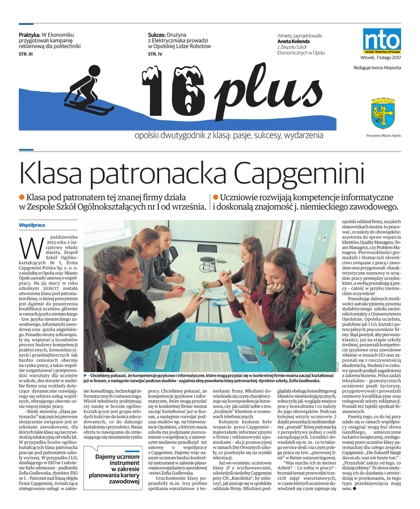 Praktyka: W Ekonomiku przygotowali kampanię reklamową dla politechniki Sukces: Drużyna z Elektryczniaka prowadzi w Opolskiej Lidze Robotów STR. III STR. IV Winietę zaprojektowała: Aneta Kolenda z Zespołu Szkół Ekonomicznych w Opolu Wtorek, 7 lutego 2017 Redaguje Iwona Kłopocka opolski dwutygodnik z klasą: pasje, sukcesy, wydarzenia Klasa patronacka Capgemini A Klasa pod patronatem tej znanej firmy działa A Uczniowie rozwijają kompetencje informatyczne w Zespole Szkół Ogólnokształących nr I od września. i doskonalą znajomość j. niemieckiego zawodowego. Współpraca październiku 2015 roku z inicjatywy władz miasta, Zespół Szkół Ogólnokształcących Nr I, firma Capgemini Polska Sp. z. o. o. z siedzibą w Opolu oraz Miasto Opole zawarły umowę o współpracy. Na jej mocy w roku szkolnym 2016/17 została utworzona klasa pod patronatem firmy, w której priorytetem jest dążenie do poszerzenia kwalifikacji uczniów, głównie w ramach języka niemieckiego - tzw. języka niemieckiego zawodowego, informatyki zawodowej oraz języka angielskiego. Ponadto strony zobowiązały się wspierać u licealistów procesy budowy kompetencji praktycznych, komunikacyjnych i przedsiębiorczych tak bardzo cenionych obecnie na rynku pracy, a także wspólnie zorganizować i przeprowadzić warsztaty dla uczniów w szkole, dni otwarte w siedzibie firmy oraz wykłady dotyczące dynamicznie rozwijającego się sektora usług wspólnych, oferującego obecnie coraz więcej miejsc pracy. - Kiedy mówimy „klasa patronacka” najczęściej pierwsze skojarzenie związane jest ze szkołami zawodowymi, dla których takie klasy są rzeczywistością edukacyjną od wielu lat. W przypadku liceów ogólnokształcących klasa patronacka pracuje pod patronatem szkoły wyższej. W przypadku I LO, działającego w ZSO nr I założenie było odmienne - podkreśla Zofia Godlewska, dyrektor ZSO nr I. - Patronat nad klasą objęła firma Capgemini, świadcząca zintegrowane usługi w zakre- FOT. I LO W b - Chcieliśmy pokazać, że kompetencje językowe i informatyczne, które mogą przydać się w konkretnej firmie można zacząć kształtować już w liceum, a następnie rozwijać podczas studiów - wyjaśnia ideę powołania klasy patronackiej dyrektor szkoły, Zofia Godlewska. sie: konsultingu, technologii informatycznych i outsourcingu. Wśród młodzieży podejmującej naukę w liceum ogólnokształcącym jest grupa młodych ludzi nie do końca zdecydowanych, co do dalszego kształcenia i przyszłości. Nasza oferta to nawiązanie do zmieniającego się nieustannie rynku Dajemy uczniom instrument w zakresie planowania kariery zawodowej pracy. Chcieliśmy pokazać, że kompetencje językowe i informatyczne, które mogą przydać się w konkretnej firmie można zacząć kształtować już w liceum, a następnie rozwijać podczas studiów np. na Uniwersytecie Opolskim, z którym nasza szkoła ma podpisane porozumienie o współpracy, a uniwersytet niedawno przedłużył też umowę o współpracy z Capgemini. Dajemy więc naszym uczniom bardzo konkretny instrument w zakresie planowania swojej kariery zawodowej -mówi Zofia Godlewska. Uruchomienie klasy poprzedziły m.in. trzy próbne spotkania warsztatowe z tre- nerkami firmy. Młodzież dowiedziała się czym charakteryzuje się korespondencja biznesowa, czy jak radzić sobie z tzw. „trudnym” klientem w rozmowach telefonicznych. Kolejnym krokiem było wsparcie przez Capgemini materiałami informacyjnymi o firmie i reklamowymi upominkami - akcji promocyjnej w ramach Dni Otwartych szkoły, co przełożyło się na wyniki rekrutacji. Już we wrześniu uczniowie klasy 1f z wychowawcami, odwiedzili siedzibę Capgemini przy CH „Karolinka”, by zobaczyć, jak pracuje się w opolskim oddziale firmy. Młodzież pod- glądała obsługę konsultingowąj klientów niemieckojęzycznych, zobaczyła jak wygląda miejsce pracy konsultanta i co należy do jego obowiązków. Podczas kolejnej wizyty uczniowie ,l dzięki prezentacji multimedialnej „poznali” firmę patronacką z perspektywy jednej z osób zarządzających. Licealiści dowiedzieli się m. in. co to takiego service desk i na czym polega praca na tzw. „pierwszej linii” w firmie outsourcingowej. “Was mache ich in meiner Arbeit? - Co robię w pracy? brzmiał temat przewodni trzecich zajęć warsztatowych, w czasie których uczniowie dowiedzieli się czym zajmuje się opolski oddział firmy, na jakich stanowiskach można tu pracować, co należy do obowiązków: asystenta do spraw wsparcia klientów, Quality Managera, Team Managera, czy Problem Managera. Pierwszoklasiści gromadzili i tłumaczyli słownictwo związane z pracą i zawodem oraz przygotowali charakterystyczne rozmowy w urzędzie pracy pomiędzy urzędnikiem, a osobą poszukującą pracy – całość w języku niemieckim oczywiście! Poszukując dalszych możliwości uatrakcyjnienia procesu dydaktycznego szkoła zacieśniła kontakty z Uniwersytetem Opolskim. Opolska uczelnia, podobnie jak I LO, kształci potencjalnych pracowników firmy. Stąd pomysł, aby pierwszoklasiści, już na etapie szkoły średniej, poszerzali kompetencje językowe oraz zawodowe właśnie w murach UO oraz zapoznali się z rzeczywistością akademicką. Studenci w ciekawy sposób podjęli zagadnienia z zakresu biznesu. Prócz zadań leksykalno – gramatycznych uczniowie pisali życiorysy, przygotowywali i prowadzili rozmowy kwalifikacyjne oraz redagowali teksty reklamacji. Poznali też tajniki spotkań biznesowych. Puentą tego, co do tej pory udało się w ramach współpracy osiągnąć mogą być słowa Gandhiego, umieszczone na kartce świątecznej, zredagowanej przez uczniów klasy patronackiej dla całego zespołu Capgemini: „Die Zukunft hängt davon ab, was wir heute tun.” – „Przyszłość zależy od tego, co dzisiaj robimy.” Te słowa motywują ich do działania i utwierdzają w przekonaniu, że tego typu przedsięwzięcia mają sens. a