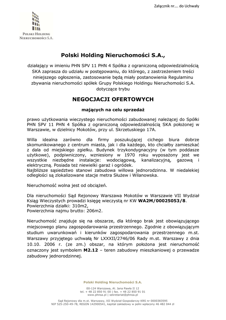 Załącznik nr…. do Uchwały Polski Holding Nieruchomości S.A., działający w imieniu PHN SPV 11 PHN 4 Spółka z ograniczoną odpowiedzialnością SKA zaprasza do udziału w postępowaniu, do którego, z zastrzeżeniem treści niniejszego ogłoszenia, zastosowanie będą miały postanowienia Regulaminu zbywania nieruchomości spółek Grupy Polskiego Holdingu Nieruchomości S.A. dotyczące trybu NEGOCJACJI OFERTOWYCH mających na celu sprzedaż prawo użytkowania wieczystego nieruchomości zabudowanej należącej do Spółki PHN SPV 11 PHN 4 Spółka z ograniczoną odpowiedzialnością SKA położonej w Warszawie, w dzielnicy Mokotów, przy ul. Skrzetuskiego 17A. Willa idealna zarówno dla firmy poszukującej cichego biura dobrze skomunikowanego z centrum miasta, jak i dla każdego, kto chciałby zamieszkać z dala od miejskiego zgiełku. Budynek trzykondygnacyjny (w tym poddasze użytkowe), podpiwniczony, wzniesiony w 1970 roku wyposażony jest we wszystkie niezbędne instalacje: wodociągową, kanalizacyjną, gazową i elektryczną. Posiada też niewielki garaż i ogródek. Najbliższe sąsiedztwo stanowi zabudowa willowa jednorodzinna. W niedalekiej odległości są zlokalizowane stacje metra Służew i Wilanowska. Nieruchomość wolna jest od obciążeń. Dla nieruchomości Sąd Rejonowy Warszawa Mokotów w Warszawie VII Wydział Ksiąg Wieczystych prowadzi księgę wieczystą nr KW WA2M/00025053/8. Powierzchnia działki: 310m2, Powierzchnia najmu brutto: 206m2. Nieruchomość znajduje się na obszarze, dla którego brak jest obowiązującego miejscowego planu zagospodarowania przestrzennego. Zgodnie z obowiązującym studium uwarunkowań i kierunków zagospodarowania przestrzennego m.st. Warszawy przyjętego uchwałą Nr LXXXII/2746/06 Rady m.st. Warszawy z dnia 10.10. 2006 r. (ze zm.) obszar, na którym położona jest nieruchomość oznaczony jest symbolem M2.12 – teren zabudowy mieszkaniowej o przewadze zabudowy jednorodzinnej. Polski Holding Nieruchomości S.A. 00-124 Warszawa, Al. Jana Pawła II 12 tel. + 48 22 850 91 00 | fax. + 48 22 850 91 01 www.phnsa.pl | [email protected] Sąd Rejonowy dla m.st. Warszawy, XII Wydział Gospodarczy KRS nr 0000383595 NIP 525-250-49-78, REGON 142900541, kapitał zakładowy w pełni wpłacony 46 482 044 zł Osoby zainteresowane nabyciem nieruchomości mogą składać oferty w kancelarii Spółki: Polski Holding Nieruchomości S. A. budynek Kaskada Al. Jana Pawła II 12 V piętro 00-124 WARSZAWA z dopiskiem: Oferta na zakup nieruchomości Warszawa, Skrzetuskiego 17a Ofertę należy złożyć w nieprzejrzystej, trwale zamkniętej kopercie w kancelarii Spółki. Oferta winna być sporządzona w formie pisemnej w języku polskim, i zawierać informacje o proponowanej cenie netto oraz termin związania ofertą. Podmioty przystępujące do udziału w negocjacjach ofertowych zobowiązane są dołączyć do składanej oferty następujące dokumenty, które w przypadku kopii, powinny być potwierdzone za zgodność z oryginałem przez oferenta, jego pełnomocnika lub notariusza: 1. Pisemne oświadczenie o obowiązku zachowania tajemnicy handlowej, co do informacji dotyczących Spółki uzyskanych w trakcie negocjacji; 2. Oświadczenie o zapoznaniu się ze stanem fizycznym nieruchomości będącej przedmiotem postępowania; i prawnym 3. Osoby fizyczne – dokument potwierdzający tożsamość (kserokopia dowodu osobistego lub paszportu) oraz oświadczenie o przetwarzaniu danych zawierające następującą klauzulę: [Imię i Nazwisko osoby biorącej udział w postępowaniu/reprezentującej Spółkę (firmę)] Wyrażam zgodę na przetwarzanie moich danych zawartych w ofercie w celach związanych z postępowaniem na sprzedaż nieruchomości Warszawa, Skrzetuskiego 17a, zgodnie z ustawą z dnia 29.08.1997 o Ochronie Danych Osobowych 4. Przedsiębiorcy wpisani do Centralnej Ewidencji i Informacji o Działalności Gospodarczej – dokument potwierdzający tożsamość oraz wydruk z Centralnej Ewidencji i Informacji o Działalności Gospodarczej; 5. Reprezentanci spółki prawa handlowego – aktualny odpis z Krajowego Rejestru Sądowego (wystawiony nie wcześniej niż 1 miesiąc przed upływem terminu składania ofert) lub wydruk z Centralnej Informacji Krajowego Rejestru Sądowego wykazujący umocowanie do reprezentowania danej spółki; 6. Pełnomocnicy – dokument potwierdzający tożsamość wraz z oświadczeniem pełnomocnika o przetwarzaniu danych osobowych, zgodnie Polski Holding Nieruchomości S.A. 00-124 Warszawa, Al. Jana Pawła II 12 tel. + 48 22 850 91 00 | fax. + 48 22 850 91 01 www.phnsa.pl | [email protected] Sąd Rejonowy dla m.st. Warszawy, XII Wydział Gospodarczy KRS nr 0000383595 NIP 525-250-49-78, REGON 142900541, kapitał zakładowy w pełni wpłacony 46 482 044 zł z treścią podaną w pkt 3 powyżej i pełnomocnictwo w formie notarialnej oraz: − w przypadku osoby prawnej – oryginał aktualnego odpisu z Krajowego Rejestru Sądowego (wystawiony nie wcześniej niż 1 miesiąc przed upływem terminu składania ofert) lub wydruk z Centralnej Informacji Krajowego Rejestru Sądowego, − w przypadku przedsiębiorcy wpisanego do Centralnej Ewidencji i Informacji o Działalności Gospodarczej – wydruk z Centralnej Ewidencji i Informacji o Działalności Gospodarczej aktualny w dacie wystawienia pełnomocnictwa, Cudzoziemcy mogą nabyć nieruchomość na zasadach określonych w ustawie z dnia 24 marca 1920 r. o nabywaniu nieruchomości przez cudzoziemców (Dz. U. z 2004 r. Nr 167 poz. 1758 z późn. zm.). Przed złożeniem oferty prosimy o zapoznanie się ze stanem fizycznym i prawnym nieruchomości. Informujemy, że granice nabywanej nieruchomości nie będą wznawiane na koszt Sprzedającego. Koszt aktu notarialnego ponosi Kupujący. Po zakończeniu postępowania zostanie uzgodniony termin i miejsce podpisania umowy sprzedaży z oferentem, którego oferta została wybrana. Informujemy, że warunkiem podpisania umowy sprzedaży 