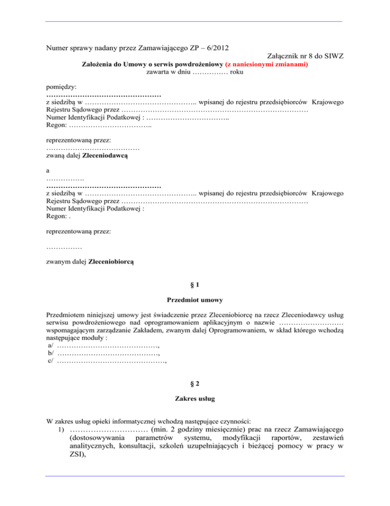 Numer sprawy nadany przez Zamawiającego ZP – 6/2012 Załącznik nr 8 do SIWZ Założenia do Umowy o serwis powdrożeniowy (z naniesionymi zmianami) zawarta w dniu …………… roku pomiędzy: ………………………………………… z siedzibą w ……………………………………….. wpisanej do rejestru przedsiębiorców Krajowego Rejestru Sądowego przez …………………………………………………………………… Numer Identyfikacji Podatkowej : …………………………….. Regon: …………………………….. reprezentowaną przez: ………………………………… zwaną dalej Zleceniodawcą a ……………. ………………………………………… z siedzibą w ……………………………………….. wpisanej do rejestru przedsiębiorców Krajowego Rejestru Sądowego przez …………………………………………………………………… Numer Identyfikacji Podatkowej : Regon: . reprezentowaną przez: …………… zwanym dalej Zleceniobiorcą §1 Przedmiot umowy Przedmiotem niniejszej umowy jest świadczenie przez Zleceniobiorcę na rzecz Zleceniodawcy usług serwisu powdrożeniowego nad oprogramowaniem aplikacyjnym o nazwie ……………………… wspomagającym zarządzanie Zakładem, zwanym dalej Oprogramowaniem, w skład którego wchodzą następujące moduły : a/ ……………………………………, b/ ……………………………………, c/ ………………………………………, §2 Zakres usług W zakres usług opieki informatycznej wchodzą następujące czynności: 1) ………………………… (min. 2 godziny miesięcznie) prac na rzecz Zamawiającego (dostosowywania parametrów systemu, modyfikacji raportów, zestawień analitycznych, konsultacji, szkoleń uzupełniających i bieżącej pomocy w pracy w ZSI), 2) prawo do nowych wersji oprogramowania, 3) aktualizację oprogramowania w przypadku zmiany przepisów prawnych. Zleceniobiorca deklaruje dostarczenie niezbędnej poprawki systemu w terminie nie późniejszym niż 2 dni robocze przed wejściem w życie zmiany prawnej, 4) konsultacji telefonicznych, 5) konserwacji dostarczonych elementów systemu informatycznego, 6) korektę wykrytych usterek w systemie, stabilizacja systemu, 7) usługi opieki mogą być świadczone zdalnie. §3 Charakterystyka usług 1. W ramach usługi usuwania nieprawidłowości w pracy Oprogramowania, Zleceniobiorca zobowiązany jest do usuwania nieprawidłowości w funkcjonowaniu Oprogramowania na podstawie pisemnych zgłoszeń serwisowych Zleceniodawcy. Do podpisywania zgłoszeń uprawniony jest wyłącznie przedstawiciel Zleceniodawcy, w osobie: …………………..………... 2. Zgłoszenie serwisowe Zleceniodawca zobowiązany jest zgłaszać: - Faxem pod numerem -……………………………………………… - Drogą elektroniczną - ……………………………………………… - Telefonicznie pod numerem telefonu ………………………. pod warunkiem, że w ciągu 1 godziny zostanie potwierdzone w sposób wskazany w powyższych punktach. - inny – zatwierdzony przez strony umowy …………………………………………………… 3. Zgłoszenia serwisowe będą odbierane w dni robocze w godzinach od 9:00 do 15:00. W przypadku, gdy formularz zgłoszenia serwisowego wpłynie do Zleceniobiorcy po godzinie 15:00 będzie uznawany za otrzymany przez Zleceniobiorcę o godzinie 9:00 najbliższego dnia roboczego. 4. Zleceniodawca jest zobowiązany do przekazania w zgłoszeniu serwisowym: a) rodzaju ujawnionego problemu, b) szczegółowych warunków powstania problemu, c) oznaczenia problemu zgodnie z klasyfikacją opisaną w ust. 5. 5. Zleceniobiorca będzie obowiązany do przystąpienia do usuwania problemu w tzw. czasie reakcji i doprowadzenia do jego usunięcia lub zastosowania rozwiązania tymczasowego w terminie odpowiednim do rodzaju problemu. przy zapewnieniu przez Zleceniodawcę zdalnego dostępu do serwera: Rodzaj problemu Awaria Systemu Błąd Systemu Usterka Systemu Średni czas reakcji Do 6 godzin Do 16 godzin Do 32 godzin Średni czas rozwiązania problemu Do 2 dni roboczych Do 7 dni roboczych Do 30 dni roboczych Strony dopuszczają nie zachowanie terminów wskazanych powyżej w przypadku braku możliwości technicznych i organizacyjnych wykonania zgłoszenia serwisowego, nie powstałych z przyczyn leżących po stronie Zleceniobiorcy. Przy braku zdalnego dostępu Zleceniobiorca w terminie rozwiązania problemu jest zobowiązany do przesłania drogą elektroniczną lub na płycie CD (lub innym nośniku) wersji korygującej Oprogramowanie, naprawiającej zgłoszony problem. W tym przypadku termin rozwiązania problemu biegnie od następnego dnia od godzinny 8.00. Strona 2 z 6 Awaria Oprogramowania – spowodowane błędem oprogramowania zakłócenie Oprogramowania uniemożliwiające czasowe lub trwałe wykonywanie wszystkich funkcji. pracy Błąd Oprogramowania – nieprawidłowe działanie Oprogramowania, nie powodujące przerwy w pracy użytkownika, uniemożliwiające jednak wykonywanie niektórych funkcji Oprogramowania. Usterka Oprogramowania – niepoprawne działanie Oprogramowania, nie zakłócające rutynowych czynności pracy użytkownika. 6. Udzielanie telefonicznych konsultacji dotyczących zagadnień związanych z bieżącym użytkowaniem oprogramowania, odbywać się będzie w godzinach pracy Zleceniobiorcy w dni robocze od 9.00 do 15.00. §4 Udostępnienie bazy Zleceniodawca zobowiązany jest udostępnić Zleceniobiorcy bazę danych Oprogramowania, w przypadku niemożności naprawy zgłoszonego problemu w miejscu instalacji Oprogramowania. §5 Poufność danych 1. Jeżeli w toku realizacji przedmiotu umowy Strony uzyskały dostęp do informacji, które są poufne, zobowiązują się zachować pełną tajemnicę w tym zakresie i nie udostępniać tych informacji osobom trzecim ani wykorzystywać ich w sposób mog