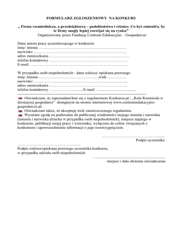 FORMULARZ ZGŁOSZENIOWY NA KONKURS ,, Firma rzemieślnicza, a przedsiębiorca – podobieństwa i różnice. Co byś zmienił/a, by te firmy mogły lepiej rozwijać się na rynku” Organizowany przez Fundację Centrum Edukacyjno – Gospodarcze Dane autora pracy uczestniczącego w konkursie imię/ imiona ………………………………………………………… nazwisko ……………………………………………………………. adres zamieszkania …………………………………………………… telefon kontaktowy ………………………………………………….. E-mail: ………………………………………………………………. W przypadku osób niepełnoletnich - dana rodzica/ opiekuna prawnego imię/ imiona ………………………………………wiek ….……….. nazwisko …………………………………………………………….. adres zamieszkania ………………………………………………….. telefon kontaktowy ………………..........E-mail: ….................................... ------------------------------------------------------------------------------------------------Oświadczam, że zapoznałam/łem się z regulaminem Konkursu pt.: ,,Rola Rzemiosla w dzisiejszej gospodarce” dostępnym na stronie internetowej www.centrumedukacyjnogospodarcze.pl. Oświadczam także, że akceptuję treść zamieszczonego regulaminu. Wyrażam zgodę na podawanie do publicznej wiadomości mojego imienia i nazwiska (imienia i nazwiska dziecka w przypadku osób niepełnoletnich), miejsca zajętego w konkursie, publikacji mojej pracy i wizerunku, wyłącznie do celów związanych z konkursem i upowszechnienie informacji o jego rozstrzygnięciem. ……………………………………....... Podpis uczestnika ……………………………………....... Podpis rodzica/opiekuna prawnego uczestnika konkursu, w przypadku udziału osób niepełnoletnich. …..................................................................... miejsce i data złożenia oświadczenia