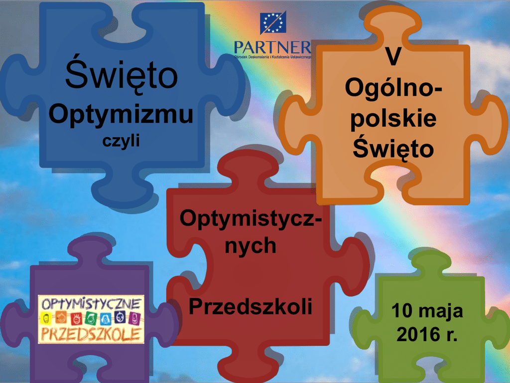 Święto Optymizmu czyli V Ogólnopolskie Święto Optymistycznych Przedszkoli 10 maja 2016 r. „Podziel się kawałkiem tęczy” - jak? • Namaluj radość i optymizm na jednym kawałku puzzla w grupie dzieci lub w przedszkolu. • Sfotografuj swój optymizm, wyślij zdjęcie puzzla mailem do Przedszkola Niepublicznego „Stokrotka” – [email protected] do 8 maja 2016 r. do godziny 12:00 (łańcuch powstanie ze zdjęć nadesłanych). • Zrób to ! Połącz się we wspólnym łańcuchu optymistycznych puzzli z całej Polski. • 9 maja otrzymasz mailem zwrotnym prezentację Power Point ze zdjęciami puzzli nadesłanymi z przedszkoli z okazji V OGÓLNOPOLSKIEGO ŚWIĘTA OPTYMIZMU. • • 10 maja 2016 podzielisz się ogólnopolskim optymizmem ze swoją społecznością optymistycznych dzieci, rodziców i nauczycieli. 10 maja 2016 rozdawaj puzzle optymizmu Partnerom Twojego Optymistycznego Przedszkola. Optymistyczne Przedszkola w Polsce – łączcie się w łańcuchu optymizmu, jedności, radosnej zabawy, dziecięcej kreatywności. Ile optymizmu zmieści się na jednym kawałku puzzla? Życzymy wszystkim kreatywnej zabawy i świetnych efektów Pozdrawiamy!