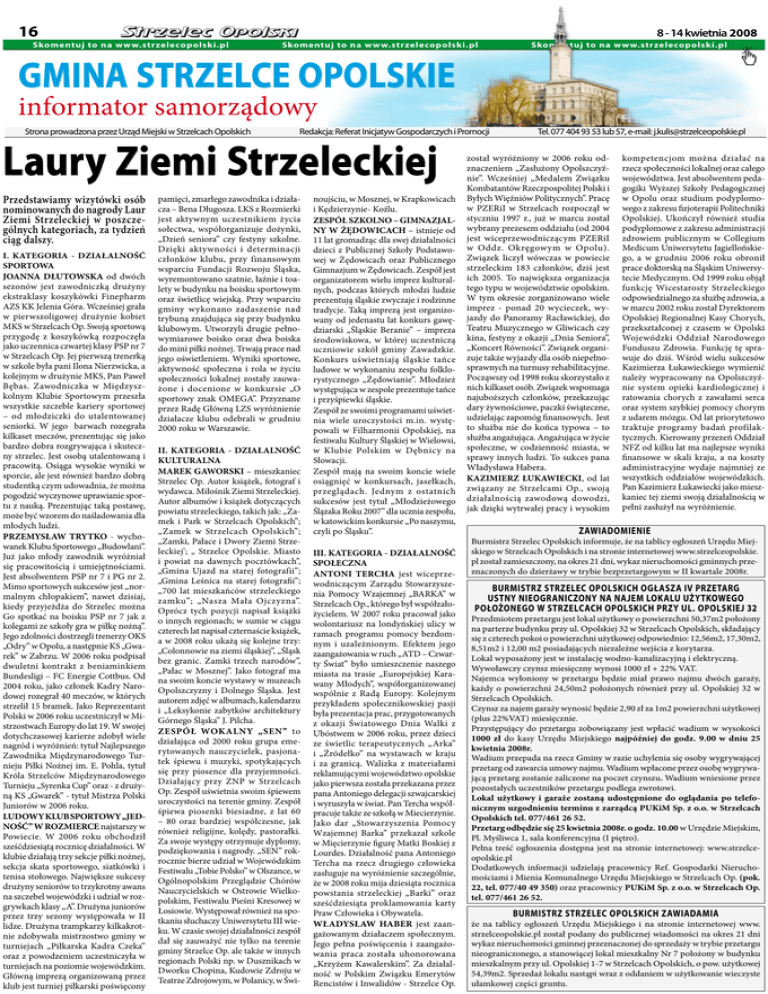 16 8 - 14 kwietnia 2008 Skomentuj to na w w w.strzelecopolski.pl Skomentuj to na w w w.strzelecopolski.pl Skomentuj to na w w w.strzelecopolski.pl GMINA STRZELCE OPOLSKIE informator samorządowy Strona prowadzona przez Urząd Miejski w Strzelcach Opolskich Redakcja: Referat Inicjatyw Gospodarczych i Promocji Laury Ziemi Strzeleckiej Przedstawiamy wizytówki osób nominowanych do nagrody Laur Ziemi Strzeleckiej w poszczególnych kategoriach, za tydzień ciąg dalszy. I. KATEGORIA - DZIAŁALNOŚĆ SPORTOWA JOANNA DŁUTOWSKA od dwóch sezonów jest zawodniczką drużyny ekstraklasy koszykówki Finepharm AZS KK Jelenia Góra. Wcześniej grała w pierwszoligowej drużynie kobiet MKS w Strzelcach Op. Swoją sportową przygodę z koszykówką rozpoczęła jako uczennica czwartej klasy PSP nr 7 w Strzelcach Op. Jej pierwszą trenerką w szkole była pani Ilona Nierzwicka, a kolejnym w drużynie MKS, Pan Paweł Bębas. Zawodniczka w Międzyszkolnym Klubie Sportowym przeszła wszystkie szczeble kariery sportowej – od młodziczki do utalentowanej seniorki. W jego barwach rozegrała kilkaset meczów, prezentując się jako bardzo dobra rozgrywająca i skuteczny strzelec. Jest osobą utalentowaną i pracowitą. Osiąga wysokie wyniki w sporcie, ale jest również bardzo dobrą studentką czym udowadnia, że można pogodzić wyczynowe uprawianie sportu z nauką. Prezentując taką postawę, może być wzorem do naśladowania dla młodych ludzi. PRZEMYSŁAW TRYTKO - wychowanek Klubu Sportowego „Budowlani”. Już jako młody zawodnik wyróżniał się pracowitością i umiejętnościami. Jest absolwentem PSP nr 7 i PG nr 2. Mimo sportowych sukcesów jest „normalnym chłopakiem”, nawet dzisiaj, kiedy przyjeżdża do Strzelec można Go spotkać na boisku PSP nr 7 jak z kolegami ze szkoły gra w piłkę nożną”. Jego zdolności dostrzegli trenerzy OKS „Odry” w Opolu, a następnie KS „Gwarek” w Zabrzu. W 2006 roku podpisał dwuletni kontrakt z beniaminkiem Bundesligi – FC Energie Cottbus. Od 2004 roku, jako członek Kadry Narodowej rozegrał 40 meczów, w których strzelił 15 bramek. Jako Reprezentant Polski w 2006 roku uczestniczył w Mistrzostwach Europy do lat 19. W swojej dotychczasowej karierze zdobył wiele nagród i wyróżnień: tytuł Najlepszego Zawodnika Międzynarodowego Turnieju Piłki Nożnej im. E. Pohla, tytuł Króla Strzelców Międzynarodowego Turnieju „Syrenka Cup” oraz - z drużyną KS „Gwarek” - tytuł Mistrza Polski Juniorów w 2006 roku. LUDOWY KLUB SPORTOWY „JEDNOŚĆ” W ROZMIERCE najstarszy w Powiecie. W 2006 roku obchodził sześćdziesiątą rocznicę działalności. W klubie działają trzy sekcje piłki nożnej, sekcja skata sportowego, siatkówki i tenisa stołowego. Największe sukcesy drużyny seniorów to trzykrotny awans na szczebel wojewódzki i udział w rozgrywkach klasy „A”. Drużyna juniorów przez trzy sezony występowała w II lidze. Drużyna trampkarzy kilkakrotnie zdobywała mistrzostwo gminy w turniejach „Piłkarska Kadra Czeka” oraz z powodzeniem uczestniczyła w turniejach na poziomie wojewódzkim. Główną imprezą organizowaną przez klub jest turniej piłkarski poświęcony pamięci, zmarłego zawodnika i działacza – Bena Długosza. LKS z Rozmierki jest aktywnym uczestnikiem życia sołectwa, współorganizuje dożynki, „Dzień seniora” czy festyny szkolne. Dzięki aktywności i determinacji członków klubu, przy finansowym wsparciu Fundacji Rozwoju Śląska, wyremontowano szatnie, łaźnie i toalety w budynku na boisku sportowym oraz świetlicę wiejską. Przy wsparciu gminy wykonano zadaszenie nad trybuną znajdująca się przy budynku klubowym. Utworzyli drugie pełnowymiarowe boisko oraz dwa boiska do mini piłki nożnej. Trwają prace nad jego oświetleniem. Wyniki sportowe, aktywność społeczna i rola w życiu społeczności lokalnej zostały zauważone i docenione w konkursie „O sportowy znak OMEGA”. Przyznane przez Radę Główną LZS wyróżnienie działacze klubu odebrali w grudniu 2000 roku w Warszawie. II. KATEGORIA - DZIAŁALNOŚĆ KULTURALNA MAREK GAWORSKI – mieszkaniec Strzelec Op. Autor książek, fotograf i wydawca. Miłośnik Ziemi Strzeleckiej. Autor albumów i książek dotyczących powiatu strzeleckiego, takich jak: „Zamek i Park w Strzelcach Opolskich”; „Zamek w Strzelcach Opolskich”; „Zamki, Pałace i Dwory Ziemi Strzeleckiej’; „ Strzelce Opolskie. Miasto i powiat na dawnych pocztówkach”, „Gmina Ujazd na starej fotografii”; „Gmina Leśnica na starej fotografii”; „700 lat mieszkańców strzeleckiego zamku”; „Nasza Mała Ojczyzna”. Oprócz tych pozycji napisał książki o innych regionach; w sumie w ciągu czterech lat napisał czternaście książek, a w 2008 roku ukażą się kolejne trzy: „Colonnowie na ziemi śląskiej”, „Śląsk bez granic. Zamki trzech narodów”, „Pałac w Mosznej”. Jako fotograf ma na swoim koncie wystawy w muzeach Opolszczyzny i Dolnego Śląska. Jest autorem zdjęć w albumach, kalendarzu i „Leksykonie zabytków architektury Górnego Śląska” J. Pilcha. ZESPÓŁ WOKALNY „SEN” to działająca od 2000 roku grupa emerytowanych nauczycielek, pasjonatek śpiewu i muzyki, spotykających się przy piosence dla przyjemności. Działający przy ZNP w Strzelcach Op. Zespół uświetnia swoim śpiewem uroczystości na terenie gminy. Zespół śpiewa piosenki biesiadne, z lat 60 – 80 oraz bardziej współczesne, jak również religijne, kolędy, pastorałki. Za swoje występy otrzymuje dyplomy, podziękowania i nagrody. „SEN” rokrocznie bierze udział w Wojewódzkim Festiwalu „Tobie Polsko” w Olszance, w Ogólnopolskim Przeglądzie Chórów Nauczycielskich w Ostrowie Wielkopolskim, Festiwalu Pieśni Kresowej w Łosiowie. Występował również na spotkaniu słuchaczy Uniwersytetu III wieku. W czasie swojej działalności zespół dał się zauważyć nie tylko na terenie gminy Strzelce Op. ale także 