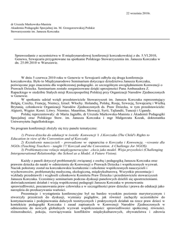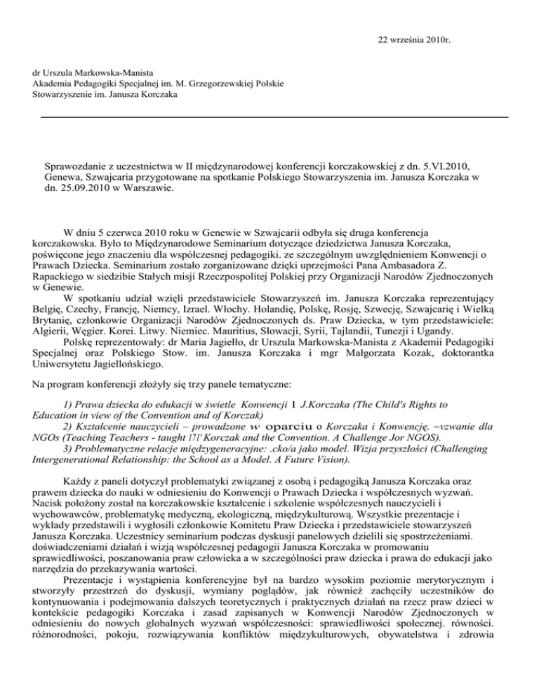 22 września 2010r. dr Urszula Markowska-Manista Akademia Pedagogiki Specjalnej im. M. Grzegorzewskiej Polskie Stowarzyszenie im. Janusza Korczaka Sprawozdanie z uczestnictwa w II międzynarodowej konferencji korczakowskiej z dn. 5.VI.2010, Genewa, Szwajcaria przygotowane na spotkanie Polskiego Stowarzyszenia im. Janusza Korczaka w dn. 25.09.2010 w Warszawie. W dniu 5 czerwca 2010 roku w Genewie w Szwajcarii odbyła się druga konferencja korczakowska. Było to Międzynarodowe Seminarium dotyczące dziedzictwa Janusza Korczaka, poświęcone jego znaczeniu dla współczesnej pedagogiki. ze szczególnym uwzględnieniem Konwencji o Prawach Dziecka. Seminarium zostało zorganizowane dzięki uprzejmości Pana Ambasadora Z. Rapackiego w siedzibie Stałych misji Rzeczpospolitej Polskiej przy Organizacji Narodów Zjednoczonych w Genewie. W spotkaniu udział wzięli przedstawiciele Stowarzyszeń im. Janusza Korczaka reprezentujący Belgię, Czechy, Francję, Niemcy, Izrael. Włochy. Holandię, Polskę, Rosję, Szwecję, Szwajcarię i Wielką Brytanię, członkowie Organizacji Narodów Zjednoczonych ds. Praw Dziecka, w tym przedstawiciele: Algierii, Węgier. Korei. Litwy. Niemiec. Mauritius, Słowacji, Syrii, Tajlandii, Tunezji i Ugandy. Polskę reprezentowały: dr Maria Jagiełło, dr Urszula Markowska-Manista z Akademii Pedagogiki Specjalnej oraz Polskiego Stow. im. Janusza Korczaka i mgr Małgorzata Kozak, doktorantka Uniwersytetu Jagiellońskiego. Na program konferencji złoŜyły się trzy panele tematyczne: 1) Prawa dziecka do edukacji w świetle Konwencji 1 J.Korczaka (The Child's Rights to Education in view of the Convention and of Korczak) 2) Kształcenie nauczycieli – prowadzone w oparciu o Korczaka i Konwencję. ~vzwanie dla NGOs (Teaching Teachers - taught 171' Korczak and the Convention. A Challenge Jor NGOS). 3) Problematyczne relacje międzygeneracyjne: .cko/a jako model. Wizja przyszłości (Challenging Intergenerational Relationship: the School as a Model. A Future Vision). KaŜdy z paneli dotyczył problematyki związanej z osobą i pedagogiką Janusza Korczaka oraz prawem dziecka do nauki w odniesieniu do Konwencji o Prawach Dziecka i współczesnych wyzwań. Nacisk połoŜony został na korczakowskie kształcenie i szkolenie współczesnych nauczycieli i wychowawców, problematykę medyczną, ekologiczną, międzykulturową. Wszystkie prezentacje i wykłady przedstawili i wygłosili członkowie Komitetu Praw Dziecka i przedstawiciele stowarzyszeń Janusza Korczaka. Uczestnicy seminarium podczas dyskusji panelowych dzielili się spostrzeŜeniami. doświadczeniami działań i wizją współczesnej pedagogii Janusza Korczaka w promowaniu sprawiedliwości, poszanowania praw człowieka a w szczególności praw dziecka i prawa do edukacji jako narzędzia do przekazywania wartości. Prezentacje i wystąpienia konferencyjne był na bardzo wysokim poziomie merytorycznym i stworzyły przestrzeń do dyskusji, wymiany poglądów, jak równieŜ zachęciły uczestników do kontynuowania i podejmowania dalszych teoretycznych i praktycznych działań na rzecz praw dzieci w kontekście pedagogiki Korczaka i zasad zapisanych w Konwencji Narodów Zjednoczonych w odniesieniu do nowych globalnych wyzwań współczesności: sprawiedliwości społecznej. równości. róŜnorodności, pokoju, rozwiązywania konfliktów międzykulturowych, obywatelstwa i zdrowia fizycznego i psychicznego. Pomiędzy Panelem l i Panelem 2 wyświetlony został film pt.: Korczak i dzieci (Korczak and the Chi/dren), przedstawiający wypowiedzi absolwentów i nauczycieli Domu Sierot przy ul. Krochmalnej w Warszawie. Oprócz rozmów z absolwentami i nauczycielami w materiale dokumentalnym zaprezentowano wspomnienia i refleksje dotyczące dzieci i wychowawców, odgrywane przez aktorów. Dr Maria Jagiełło i dr Urszula Markowska-Manista przygotowały i przesłały organizatorom pokonferencyjny tekst wystąpienia w języku angielskim. pt.: Janusz Korczak teacher of teachers. Examples oj good praxis in Poland. który ukaŜe się w materiałach pokonferencyjnych. Kolejne, trzecie seminarium przewidziane jest \\ czerwcu 2011 roku w Genewie. Organizatorzy oczekują na moŜliwości nawiązania i podjęcia dialogu z innymi organizacjami realizującymi działania w obszarze edukacji i praw człowieka. Przygotowała: dr Urszula Markowska-Manista