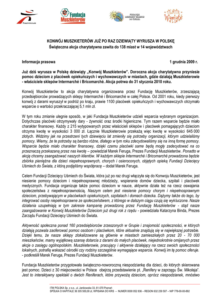 KONWÓJ MUSZKIETERÓW JUŻ PO RAZ DZIEWIĄTY WYRUSZA W POLSKĘ Świąteczna akcja charytatywna zawita do 138 miast w 14 województwach Informacja prasowa 1 grudnia 2009 r. Już dziś wyrusza w Polskę dziewiąty „Konwój Muszkieterów”. Doroczna akcja charytatywna przyniesie pomoc dzieciom z placówek opiekuńczych i wychowawczych w miastach, gdzie działają Muszkieterowie - właściciele sklepów Intermarché i Bricomarché. Akcja potrwa do 31 stycznia 2010 roku. Konwój Muszkieterów to akcja charytatywna organizowana przez Fundację Muszkieterów, zrzeszającą przedsiębiorców prowadzących sklepy Intermarché i Bricomarché w całej Polsce. Od 2001 roku, kiedy pierwszy konwój z darami wyruszył w podróż po kraju, prawie 1100 placówek opiekuńczych i wychowawczych otrzymało wsparcie o wartości przekraczającej 5,1 mln zł. W tym roku zmianie ulegnie sposób, w jaki Fundacja Muszkieterów udzieli wsparcia wybranym organizacjom. Dotychczas placówki otrzymywały dary - żywność oraz środki higieniczne. Tym razem wsparcie będzie miało charakter finansowy. Każdy z 215 wytypowanych przez właścicieli sklepów i placówek pomagających dzieciom otrzyma kwotę w wysokości 3 000 zł. Łącznie Muszkieterowie przekażą więc kwotę w wysokości 645 000 złotych. Widzimy jak na przestrzeni tych dziewięciu lat zmieniły się potrzeby organizacji, którym udzielaliśmy pomocy. Wiemy, że te potrzeby są bardzo różne, dlatego w tym roku zdecydowaliśmy się na inną formę pomocy. Wsparcie będzie miało charakter finansowy, dzięki czemu placówki same będą mogły zadecydować na co przeznaczą przekazaną przez nas kwotę – powiedział Marek Feruga, Prezes Fundacji Muszkieterów. Ponadto w akcję chcemy zaangażować naszych klientów. W każdym sklepie Intermarché i Bricomarché prowadzona będzie zbiórka pieniężna dla dzieci niepełnosprawnych, chorych i osieroconych, objętych opieką Fundacji Dziecięcy Uśmiech do Świata, z którą podjęliśmy współpracę – dodał Marek Feruga. Celem Fundacji Dziecięcy Uśmiech do Świata, która już po raz drugi włączyła się do Konwoju Muszkieterów, jest niesienie pomocy dzieciom i niepełnosprawnej młodzieży, wspieranie domów dziecka, szpitali i placówek medycznych. Fundacja organizuje także pomoc dzieciom w nauce, aktywnie działa też na rzecz oswajania społeczeństwa z niepełnosprawnością. Naszym celem jest niesienie pomocy chorym i niepełnosprawnym dzieciom, przebywającym w placówkach opiekuńczych, szpitalach i domach dziecka. Dążymy także do tego, by integrować osoby niepełnosprawne ze społeczeństwem, z którego w dalszym ciągu czują się wykluczone. Nasze działania uzupełniają w tym zakresie kampanię prowadzoną przez Fundację Muszkieterów - stąd nasze zaangażowanie w Konwój Muszkieterów Dzieciom już drugi rok z rzędu - powiedziała Katarzyna Binda, Prezes Zarządu Fundacji Dziecięcy Uśmiech do Świata. Aktywność społeczna ponad 160 przedsiębiorców zrzeszonych w Grupie i znajomość społeczności, w których działają pozwala zaoferować pomoc osobom i placówkom, które aktualnie znajdują się w największej potrzebie. Dzięki temu, że nasze sklepy zlokalizowane są głównie w miastach zamieszkałych przez 20 - 70 000 mieszkańców, mamy wyjątkową szansę dotarcia z darami do małych placówek, niejednokrotnie omijanych przez akcje o zasięgu ogólnopolskim. Muszkieterowie, pracujący i aktywnie działający na rzecz swoich społeczności lokalnych, potrafią wskazać ośrodki czy rodziny szczególnie wymagające wsparcia. Konwój im tę pomoc oferuje. - podkreślił Marek Feruga, Prezes Fundacji Muszkieterów. Fundacja Muszkieterów przygotowała świąteczno-noworoczną niespodziankę dla dzieci, do których skierowana jest pomoc. Dzieci z 30 miejscowości w Polsce obejrzą przedstawienie pt. „Renifery w zaprzęgu Św. Mikołaja”. Jest to interaktywny spektakl o dwóch Reniferach, które przywożą dzieciom, oprócz niespodzianek, mnóstwo ITM POLSKA Sp. z o.o., ul. Janikowska 33, 61-070 Poznań SPÓŁKA O KAPITALE 36 305 500,00 zł, WPISANA DO KRS – NUMER 0000 052 836 – REGON 632 239 507 – NIP 778-00-00-892 dobrej zabawy – powiedziała Sylwia Cyris, aktorka Teatru Wariate’. Mam nadzieję, że dzięki zaangażowaniu teatru i spektaklom, które będą wystawiane, dzieci choć na chwilę zapomną o swoich problemach, a na ich twarzach zagości uśmiech – powiedział Prezes Fundacji Muszkieterów. Patronat nad akcją objęły Wirtualna Polska, Polska The Times oraz portal Miasto Dzieci. Informacje o Fundacji Muszkieterów Fundacja Muszkieterów została powołana w 2002 roku. Działalność Fundacji opiera się na wartościach wspólnych dla wszystkich przedsiębiorców zrzeszonych w Grupie - dzieleniu wypracowanymi zyskami z potrzebującymi. Motto Grupy: Nie ma większej wartości niż człowiek znajduje odzwierciedlenie nie tylko w przedświątecznej akcji charytatywnej, ale przede wszystkim w codziennej aktywności każdego z Muszkieterów. Informacja o Teatrze Wariate’ Teatr Wariate’ tworzy para zawodowych aktorów z wieloletnim doświadczeniem teatralnym. Inspiracją do nazwy stały się zwariowane spektakle, bo najważniejsza dla Teatru Wariate’ jest radość dzieci i dobra zabawa. Informacje o Grupie Muszkieterów w Polsce Grupa Muszkieterów jest zrzeszeniem ponad 160 niezależnych polskich przedsiębiorców, zarządzających supermarketami spożywczymi Intermarché oraz supermarketami typu „dom i ogród” Bricomarché. Sieć handlowa Grupy Muszkieterów licząca obecnie 143 supermarkety Intermarché oraz 68 sklepów Bricomarché jest pod względem obrotów największą grupą franczyzową w Polsce. W 2008 r. jej obroty przekroczyły 2,8 mld zł. Rozwojem obu sieci kieruje spółka ITM Polska. Plany strategiczne Grupy zakładają ekspansję sieci głownie w małych i średnich miejscowościach, o wielkości do 70 000 mieszka