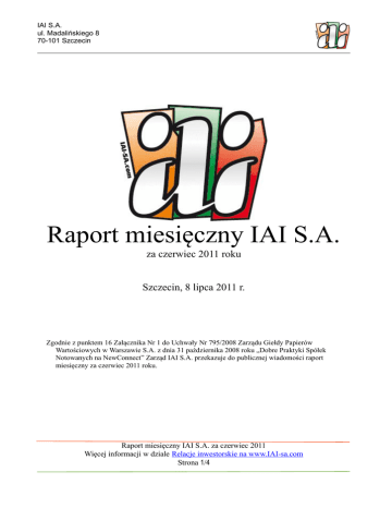 IAI S.A. ul. Madalińskiego 8 70-101 Szczecin Raport miesięczny IAI S.A. za czerwiec 2011 roku Szczecin, 8 lipca 2011 r. Zgodnie z punktem 16 Załącznika Nr 1 do Uchwały Nr 795/2008 Zarządu Giełdy Papierów Wartościowych w Warszawie S.A. z dnia 31 października 2008 roku „Dobre Praktyki Spółek Notowanych na NewConnect” Zarząd IAI S.A. przekazuje do publicznej wiadomości raport miesięczny za czerwiec 2011 roku. Raport miesięczny IAI S.A. za czerwiec 2011 Więcej informacji w dziale Relacje inwestorskie na www.IAI-sa.com Strona 1/4 IAI S.A. ul. Madalińskiego 8 70-101 Szczecin I. Informacje na temat wystąpienia tendencji i zdarzeń w otoczeniu rynkowym Spółki, które w ocenie Spółki mogą mieć w przyszłości istotne skutki dla kondycji finansowej oraz wyników finansowych IAI S.A. Według wstępnych szacunków w czerwcu 2011 Spółka osiągnęła przychody na poziomie 358 tysięcy złotych netto. Dzięki temu przychody w drugim kwartale 2011 roku powinny przekroczyć milion złotych netto. Będzie to najlepszy wynik w dotychczasowej historii Spółki. Spółka utrzymuje wysoką dynamikę wzrostu przychodów i obsługiwanych sklepów. W czerwcu 2011 roku przychody wzrosły o 46% wobec czerwca 2010 i o 113% wobec czerwca 2009. Szybko rośnie także ilość obsługiwanych sklepów. W czerwcu 2011 roku było to 1380 sklepów, czyli o 96% więcej niż rok temu i aż o 275% więcej niż w 2009 roku. W czerwcu Spółka wprowadziła do IAI-Shop.com szereg nowych usług. Do najistotniejszych zmian należy zaliczyć rozpoczęcie świadczenia obsługi bazy danych opisów produktów organizowanej razem z BDK sp. z o.o., polskim liderem w dostarczaniu opisów dla sklepów internetowych. Spółka rozwiązała istotny problem sklepów internetowych, jakim jest aktualność oraz jakość opisów i zdjęć towarów. Jest to również pierwsza usługa sprzedawana w nowym modelu External Services, czyli płatność za usługę firmy trzeciej odbywa się przez saldo rozliczeń z IAI S.A. Oprócz przewagi technologicznej zachęcającej do zamawiania IAI-Shop.com, oznacza to zwiększone przychody i dochody dla Spółki Spółka wprowadziła na rynek nowe aplikacje pomocnicze. Są to Fiskalizator 1.0 (służący do drukowania paragonów fiskalnych) oraz POS 1.0 (służący do obsługi sprzedaży kasowej). Fiskalizator zastąpił dotychczasowe dwa osobne sposoby obsługi wydruku paragonów na drukarkach fiskalnych. Nowy POS 1.0 zastępuje poprzednią generację nazwaną IAI-Shop.com POS BETA, który był oferowany bez opłat, ale bez wsparcia dla integracji z IAI Fiskalizator. Wersja 1.0 w pełni współpracuje z IAI Fiskalizator, drukując przez niego paragony fiskalne. Pierwsze przychody ze sprzedaży obu programów pojawiły się jeszcze w czerwcu 2011 roku. Istotną zmianą dla sklepów internetowych jest również wprowadzenie czwartej generacji maski matrycowej, z której produkowane są wszystkie indywidualne maski sklepów internetowych. Jest to tzw. maska STANDARD UNIWERSALNY, która może służyć jako normalna maska, lub można z niej szybciej stworzyć nowocześnie i bogato wyposażone maski klientów. Mogą oni, również poprzez wprowadzone wcześniej narzędzie samodzielnej edycji, uzyskać z niej samodzielnie niemal dowolnie wyglądającą maskę. Klienci bardzo entuzjastycznie odebrali wygląd, rozkład i funkcjonalność tej maski, co z pewnością przełoży się na większe zainteresowanie usługą tzw. redesignów i spowoduje dalszy wzrost sprzedaży IAI-Shop.com. Spółka wprowadziła również do IAI-Shop.com tzw. zestawy towarów. Jest to funkcja bardzo pożądana przez klientów. Funkcja ta wymagała wielu miesięcy przygotowań technicznych, gdyż zestawy musiały w pełni współpracować z pełną funkcjonalnością IAI-Shop.com. Jest to funkcja, którą oferuje niewiele systemów konkurencyjnych. Naszym klientom daje to szanse lepszego konkurowania o klientów, również w zintegrowanych serwisach aukcyjnych. Klienci uzyskują w standardowym rozwiązaniu funkcję dostępną w dużych, drogich, dedykowanych systemach. Jednocześnie wprowadzenie funkcji wymaga zmian w masce graficznej, dzięki czemu Spółka czerpie korzyści z serwisowych prac graficznych. Raport miesięczny IAI S.A. za czerwiec 2011 Więcej informacji w dziale Relacje inwestorskie na www.IAI-sa.com Strona 2/4 IAI S.A. ul. Madalińskiego 8 70-101 Szczecin Ważną zmianą i zwieńczeniem wielu miesięcy pracy jest zaoferowanie zupełnie nowego sposobu realizacji zamówień sklepowych opartych o tzw. rezerwacje. System ten wymagał ulepszeń w obszarze niezmienianym od kilku lat. Wprowadzone zmiany umożliwią jednak zaoferowanie zupełnie nowej generacji narzędzi integracyjnych, które bez zmiany modelu nie były by możliwe do wykonania. Zmiana ta udowadnia, że Spółka nadal chce rozwijać się dynamicznie pod względem oferowanych rozwiązań i nie poprzestaje na prostych i efektownych zmianach. Spółka podjęła współpracę z LUKAS Bank i wprowadziła możliwość uruchomienia w sklepach internetowych systemu ratalnego LUKAS Raty. Dzięki temu rozwiązaniu sklepy korzystające z IAI-Shop.com mogą oferować swoim klientom sprzedaż ratalną. Cały proces zamawiania oraz wypełniania wniosku kredytowego został możliwie najbardziej zautomatyzowany. Duża innowacyjność i inwestycje w poprawę wydajności i jakości obsługi klientów silnie wspierane działaniami promocyjnymi, szczególnie PR, podjęte od początku 2010 roku przynoszą pozytywny efekt w postaci nowych zamówień i rosnącego zainteresowania mediów oraz klientów Spółką. II. Wykaz wszystkich informacji opublikowanych przez Emitenta w trybie raportu bieżącego w okresie objętym raportem. W czerwcu 2011 roku Spółka przekazała do publicznej wiadomości za pośrednictwem systemu EBI raporty: 1. 8 czerwca 2011 roku raport miesięczny za maj 2011 r. 2. 30 czerwca 2011 roku informacja o akcjonariuszach posiadających p