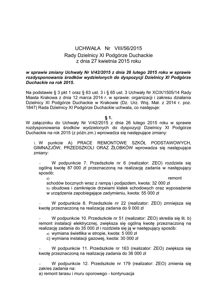 UCHWAŁA Nr VIII/56/2015 Rady Dzielnicy XI Podgórze Duchackie z dnia 27 kwietnia 2015 roku w sprawie zmiany Uchwały Nr V/42/2015 z dnia 26 lutego 2015 roku w sprawie rozdysponowania środków wydzielonych do dyspozycji Dzielnicy XI Podgórze Duchackie na rok 2015. Na podstawie § 3 pkt 1 oraz § 63 ust. 3 i § 65 ust. 3 Uchwały Nr XCIX/1505/14 Rady Miasta Krakowa z dnia 12 marca 2014 r. w sprawie: organizacji i zakresu działania Dzielnicy XI Podgórze Duchackie w Krakowie (Dz. Urz. Woj. Mał. z 2014 r. poz. 1847) Rada Dzielnicy XI Podgórze Duchackie uchwala, co następuje: § 1. W załączniku do Uchwały Nr V/42/2015 z dnia 26 lutego 2015 roku w sprawie rozdysponowania środków wydzielonych do dyspozycji Dzielnicy XI Podgórze Duchackie na rok 2015 (z późn.zm.) wprowadza się następujące zmiany: W punkcie A) PRACE REMONTOWE SZKÓŁ PODSTAWOWYCH, GIMNAZJÓW, PRZEDSZKOLI ORAZ ŻŁOBKÓW wprowadza się następujące zmiany: 1. W podpunkcie 7. Przedszkole nr 6 (realizator: ZEO) rozdziela się ogólną kwotę 87 000 zł przeznaczoną na realizację zadania w następujący sposób: a) remont schodów bocznych wraz z rampą i podjazdem, kwota: 32 000 zł b) obudowa i zamknięcie drzwiami klatek schodowych oraz wyposażenie w urządzenia zapobiegające zadymieniu, kwota: 55 000 zł − W podpunkcie 8. Przedszkole nr 22 (realizator: ZEO) zmniejsza się kwotę przeznaczoną na realizację zadania do 9 000 zł − W podpunkcie 10. Przedszkole nr 51 (realizator: ZEO) skreśla się lit. b) remont instalacji elektrycznej, zwiększa się ogólną kwotę przeznaczoną na realizację zadania do 35 000 zł i rozdziela się ją w następujący sposób: a) wymiana świetlika w stropie, kwota: 5 000 zł c) wymiana instalacji gazowej, kwota: 30 000 zł − W podpunkcie 11. Przedszkole nr 163 (realizator: ZEO) zwiększa się kwotę przeznaczoną na realizację zadania do 36 000 zł − W podpunkcie 12. Przedszkole nr 179 (realizator: ZEO) zmienia się zakres zadania na: a) remont tarasu i muru oporowego - kontynuacja − − Dodaje się podpunkt 14 w brzmieniu: Żłobek nr 31: a) Malowanie pomieszczeń bawialni i sypialni gr II, III i IV, realizator: Żłobek nr 31, kwota: 20 000 zł − Zmienia się ogólną kwotę na zadaniach w punkcie A na 656 360 zł W punkcie B) BUDOWA, MODERNIZACJA, PRACE REMONTOWE: OGRÓDKÓW JORDANOWSKICH, ZIELEŃCÓW, SKWERÓW wprowadza się następujące zmiany: 2. Skreśla się podpunkt 1. Bieżące utrzymanie ogródków jordanowskich oraz zieleńców i skwerów (realizator: ZIKiT) − − Zmienia się ogólną kwotę na zadaniach w punkcie B na 171 000 zł W punkcie D) BUDOWA, MODERNIZACJA, PRACE REMONTOWE OSIEDLOWEJ INFRASTRUKTURY SPORTOWEJ I REKREACYJNEJ wprowadza się następujące zmiany: 3. W podpunkcie 1. KS Armatura (boisko przy ul. Chmielnej) (realizator: ZIS) zmienia się zakres zadania na: a) budowa oświetlenia i monitoringu − W punkcie H) DZIELNICOWE PROGRAMY WPIERANIA DZIAŁALNOŚCI MIEJSKICH PLACÓWEK: OŚWIATY, KULTURY, SPORTU, POMOCY SPOLECZNEJ I ZDROWIA wprowadza się następujące zmiany: 4. Dopisuje się podpunkt 33: Organizacja imprezy sportowej dla dzieci i młodzieży (SP 162), realizator: ZEO, kwota: 3 000 zł − − Dopisuje się podpunkt 34: Organizacja wystawy z okazji 100-lecia połączenia Podgórza z Krakowem, realizator: MDK im. K.I. Gałczyńskiego, kwota: 1 000 zł − Dopisuje się podpunkt 35: Dofinansowanie organizacji jubileuszu 30lecia Międzyszkolnego Ludowego Zespołu Pieśni i Tańca „Krakowiak”, realizator: MLZPiT „Krakowiak”, kwota: 1 900 zł − Zmienia się ogólną kwotę na zadaniach w punkcie H na 224 800 zł W punkcie L) OBSŁUGA ADMINISTRACYJNO BIUROWA RADY I ZARZĄDU wprowadza się następujące zmiany: 5. W podpunkcie 1. Zakup laptopa (realizator: IT) zwiększa się kwotę przeznaczoną na realizację zadania do 3 300 zł − − Dopisuje się podpunkt 2. Sprzątanie pomieszczeń biura dzielnicy, realizator: OU, kwota: 1 800 zł − Zmienia się ogólną kwotę na zadaniach w punkcie L na 5 100 zł 6. W punkcie J) KOMUNIKACJA Z MIESZKAŃCAMI DZIELNICY wprowadza się następujące zmiany: − Dopisuje się podpunkt 4. Wymiana tablic informacyjnych, realizator: ZIKiT, kwota: 9 000 zł − Zmienia się ogólną kwotę na zadaniach w punkcie J na 45 000 zł § 2. Uchwała wchodzi w życie z dniem podjęcia. Przewodniczący Rady i Zarządu Dzielnicy XI Podgórze Duchackie Krzysztof Sułowski