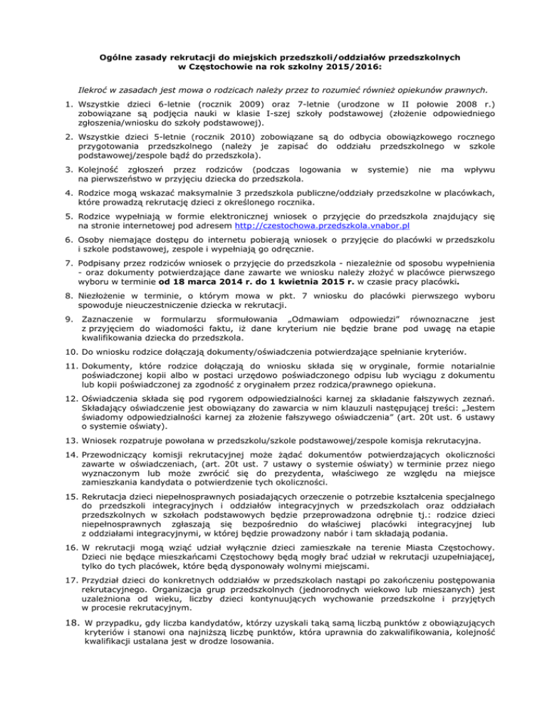 Ogólne zasady rekrutacji do miejskich przedszkoli/oddziałów przedszkolnych w Częstochowie na rok szkolny 2015/2016: Ilekroć w zasadach jest mowa o rodzicach należy przez to rozumieć również opiekunów prawnych. 1. Wszystkie dzieci 6-letnie (rocznik 2009) oraz 7-letnie (urodzone w II połowie 2008 r.) zobowiązane są podjęcia nauki w klasie I-szej szkoły podstawowej (złożenie odpowiedniego zgłoszenia/wniosku do szkoły podstawowej). 2. Wszystkie dzieci 5-letnie (rocznik 2010) zobowiązane są do odbycia obowiązkowego rocznego przygotowania przedszkolnego (należy je zapisać do oddziału przedszkolnego w szkole podstawowej/zespole bądź do przedszkola). 3. Kolejność zgłoszeń przez rodziców (podczas logowania na pierwszeństwo w przyjęciu dziecka do przedszkola. w systemie) nie ma wpływu 4. Rodzice mogą wskazać maksymalnie 3 przedszkola publiczne/oddziały przedszkolne w placówkach, które prowadzą rekrutację dzieci z określonego rocznika. 5. Rodzice wypełniają w formie elektronicznej wniosek o przyjęcie do przedszkola znajdujący się na stronie internetowej pod adresem http://czestochowa.przedszkola.vnabor.pl 6. Osoby niemające dostępu do internetu pobierają wniosek o przyjęcie do placówki w przedszkolu i szkole podstawowej, zespole i wypełniają go odręcznie. 7. Podpisany przez rodziców wniosek o przyjęcie do przedszkola - niezależnie od sposobu wypełnienia - oraz dokumenty potwierdzające dane zawarte we wniosku należy złożyć w placówce pierwszego wyboru w terminie od 18 marca 2014 r. do 1 kwietnia 2015 r. w czasie pracy placówki. 8. Niezłożenie w terminie, o którym mowa w pkt. 7 wniosku do placówki pierwszego wyboru spowoduje nieuczestniczenie dziecka w rekrutacji. 9. Zaznaczenie w formularzu sformułowania „Odmawiam odpowiedzi” równoznaczne jest z przyjęciem do wiadomości faktu, iż dane kryterium nie będzie brane pod uwagę na etapie kwalifikowania dziecka do przedszkola. 10. Do wniosku rodzice dołączają dokumenty/oświadczenia potwierdzające spełnianie kryteriów. 11. Dokumenty, które rodzice dołączają do wniosku składa się w oryginale, formie notarialnie poświadczonej kopii albo w postaci urzędowo poświadczonego odpisu lub wyciągu z dokumentu lub kopii poświadczonej za zgodność z oryginałem przez rodzica/prawnego opiekuna. 12. Oświadczenia składa się pod rygorem odpowiedzialności karnej za składanie fałszywych zeznań. Składający oświadczenie jest obowiązany do zawarcia w nim klauzuli następującej treści: „Jestem świadomy odpowiedzialności karnej za złożenie fałszywego oświadczenia” (art. 20t ust. 6 ustawy o systemie oświaty). 13. Wniosek rozpatruje powołana w przedszkolu/szkole podstawowej/zespole komisja rekrutacyjna. 14. Przewodniczący komisji rekrutacyjnej może żądać dokumentów potwierdzających okoliczności zawarte w oświadczeniach, (art. 20t ust. 7 ustawy o systemie oświaty) w terminie przez niego wyznaczonym lub może zwrócić się do prezydenta, właściwego ze względu na miejsce zamieszkania kandydata o potwierdzenie tych okoliczności. 15. Rekrutacja dzieci niepełnosprawnych posiadających orzeczenie o potrzebie kształcenia specjalnego do przedszkoli integracyjnych i oddziałów integracyjnych w przedszkolach oraz oddziałach przedszkolnych w szkołach podstawowych będzie przeprowadzona odrębnie tj.: rodzice dzieci niepełnosprawnych zgłaszają się bezpośrednio do właściwej placówki integracyjnej lub z oddziałami integracyjnymi, w której będzie prowadzony nabór i tam składają podania. 16. W rekrutacji mogą wziąć udział wyłącznie dzieci zamieszkałe na terenie Miasta Częstochowy. Dzieci nie będące mieszkańcami Częstochowy będą mogły brać udział w rekrutacji uzupełniającej, tylko do tych placówek, które będą dysponowały wolnymi miejscami. 17. Przydział dzieci do konkretnych oddziałów w przedszkolach nastąpi po zakończeniu postępowania rekrutacyjnego. Organizacja grup przedszkolnych (jednorodnych wiekowo lub mieszanych) jest uzależniona od wieku, liczby dzieci kontynuujących wychowanie przedszkolne i przyjętych w procesie rekrutacyjnym. 18. W przypadku, gdy liczba kandydatów, którzy uzyskali taką samą liczbą punktów z obowiązujących kryteriów i stanowi ona najniższą liczbę punktów, która uprawnia do zakwalifikowania, kolejność kwalifikacji ustalana jest w drodze losowania. 19. Jeżeli w wyniku postępowania rekrutacyjnego dziecko zamieszkałe w Częstochowie, zobowiązane do odbycia rocznego przygotowania przedszkolnego, nie zostało przyjęte do przedszkola/oddziału przedszkolnego dyrektor tej placówki informuje Prezydenta Miasta Częstochowy o nieprzyjęciu dziecka. 20. W przypadku, o którym mowa w pkt. 19 Prezydent Miasta Częstochowy pisemnie wskazuje rodzicom inne przedszkole/oddział przedszkolny, które może przyjąć dziecko. 21. Jeśli po zakończeniu postępowania rekrutacyjnego przedszkole lub oddział przedszkolny w szkole podstawowej będą dysponowały wolnymi miejscami dyrektor danej jednostki do końca sierpnia przeprowadzi rekrutację uzupełniającą.