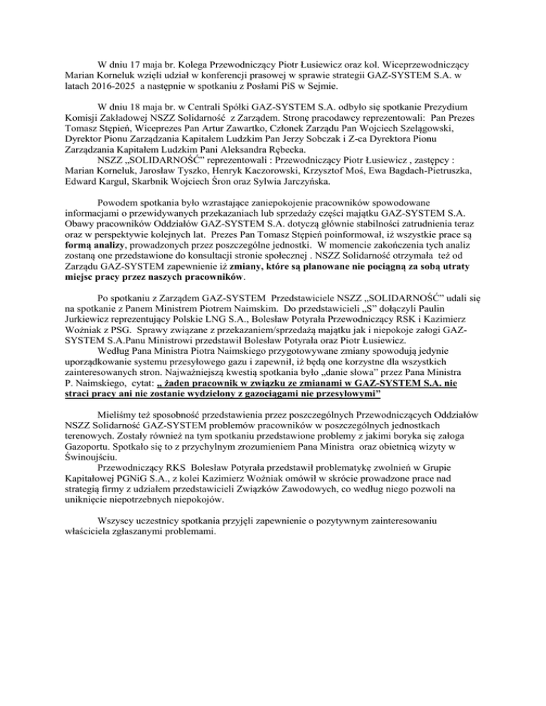 W dniu 17 maja br. Kolega Przewodniczący Piotr Łusiewicz oraz kol. Wiceprzewodniczący Marian Korneluk wzięli udział w konferencji prasowej w sprawie strategii GAZ-SYSTEM S.A. w latach 2016-2025 a następnie w spotkaniu z Posłami PiS w Sejmie. W dniu 18 maja br. w Centrali Spółki GAZ-SYSTEM S.A. odbyło się spotkanie Prezydium Komisji Zakładowej NSZZ Solidarność z Zarządem. Stronę pracodawcy reprezentowali: Pan Prezes Tomasz Stępień, Wiceprezes Pan Artur Zawartko, Członek Zarządu Pan Wojciech Szelągowski, Dyrektor Pionu Zarządzania Kapitałem Ludzkim Pan Jerzy Sobczak i Z-ca Dyrektora Pionu Zarządzania Kapitałem Ludzkim Pani Aleksandra Rębecka. NSZZ „SOLIDARNOŚĆ” reprezentowali : Przewodniczący Piotr Łusiewicz , zastępcy : Marian Korneluk, Jarosław Tyszko, Henryk Kaczorowski, Krzysztof Moś, Ewa Bagdach-Pietruszka, Edward Kargul, Skarbnik Wojciech Śron oraz Sylwia Jarczyńska. Powodem spotkania było wzrastające zaniepokojenie pracowników spowodowane informacjami o przewidywanych przekazaniach lub sprzedaży części majątku GAZ-SYSTEM S.A. Obawy pracowników Oddziałów GAZ-SYSTEM S.A. dotyczą głównie stabilności zatrudnienia teraz oraz w perspektywie kolejnych lat. Prezes Pan Tomasz Stępień poinformował, iż wszystkie prace są formą analizy, prowadzonych przez poszczególne jednostki. W momencie zakończenia tych analiz zostaną one przedstawione do konsultacji stronie społecznej . NSZZ Solidarność otrzymała też od Zarządu GAZ-SYSTEM zapewnienie iż zmiany, które są planowane nie pociągną za sobą utraty miejsc pracy przez naszych pracowników. Po spotkaniu z Zarządem GAZ-SYSTEM Przedstawiciele NSZZ „SOLIDARNOŚĆ” udali się na spotkanie z Panem Ministrem Piotrem Naimskim. Do przedstawicieli „S” dołączyli Paulin Jurkiewicz reprezentujący Polskie LNG S.A., Bolesław Potyrała Przewodniczący RSK i Kazimierz Wożniak z PSG. Sprawy związane z przekazaniem/sprzedażą majątku jak i niepokoje załogi GAZSYSTEM S.A.Panu Ministrowi przedstawił Bolesław Potyrała oraz Piotr Łusiewicz. Według Pana Ministra Piotra Naimskiego przygotowywane zmiany spowodują jedynie uporządkowanie systemu przesyłowego gazu i zapewnił, iż będą one korzystne dla wszystkich zainteresowanych stron. Najważniejszą kwestią spotkania było „danie słowa” przez Pana Ministra P. Naimskiego, cytat: „ żaden pracownik w związku ze zmianami w GAZ-SYSTEM S.A. nie straci pracy ani nie zostanie wydzielony z gazociągami nie przesyłowymi” Mieliśmy też sposobność przedstawienia przez poszczególnych Przewodniczących Oddziałów NSZZ Solidarność GAZ-SYSTEM problemów pracowników w poszczególnych jednostkach terenowych. Zostały również na tym spotkaniu przedstawione problemy z jakimi boryka się załoga Gazoportu. Spotkało się to z przychylnym zrozumieniem Pana Ministra oraz obietnicą wizyty w Świnoujściu. Przewodniczący RKS Bolesław Potyrała przedstawił problematykę zwolnień w Grupie Kapitałowej PGNiG S.A., z kolei Kazimierz Wożniak omówił w skrócie prowadzone prace nad strategią firmy z udziałem przedstawicieli Związków Zawodowych, co według niego pozwoli na uniknięcie niepotrzebnych niepokojów. Wszyscy uczestnicy spotkania przyjęli zapewnienie o pozytywnym zainteresowaniu właściciela zgłaszanymi problemami.