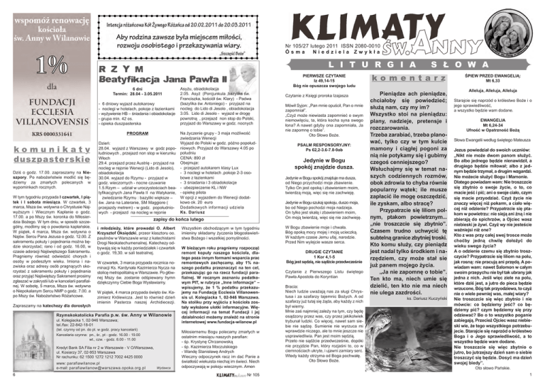 Nr 105/27 lutego 2011 ISSN 2080-0010 Ósma Niedziela Zwykła L I T U R G I A 6 dni Termin: 28.04 - 3.05.2011 - 6 dniowy wyjazd autokarowy - noclegi w hotelach, pokoje z łazienkami - wyżywienie HB – śniadania i obiadokolacje - grupa min. 42 os. - opieka duszpasterska Asyżu, obiadokolacja 2.05. Asyż (Porcjunkula ,bazylika św. Franciszka, kościół św. Klary) - Padwa (bazylika św. Antoniego) - przyjazd na nocleg do Lido di Jesolo , obiadokolacja 3.05. Lido di Jesolo - wyjazd w drogę powrotną , przejazd non stop do Polski, przyjazd do Warszawy w godz. nocnych Na życzenie grupy - 3 maja możliwość zwiedzania Wenecji Wyjazd do Polski w godz. późno popołudDzień: 28.04. wyjazd z Warszawy w godz popo- niowych. Przyjazd do Warszawy 4.05 po łudniowych , przejazd non stop w kierunku południu CENA: 890 zł Włoch 29.4. przejazd przez Austrię - przyjazd na Obejmuje: nocleg w rejonie Wenecji (Lido di Jesolo), - przejazd autokarem klasy Lux - 3 noclegi w hotelach ,pokoje 2-3 osoobiadokolacja bowe z łazienkami 30.04. wyjazd do Rzymu - przyjazd w - 3 śniadania i 3 obiadokolacje godz. wieczornych - nocne czuwanie 1.5.Rzym – udział w uroczystościach bea- - ubezpieczenie KL i NW tyfikacyjnych Jana Pawła II na Watykanie, - opiekę pilota W opcji z wyjazdem do Wenecji dodatzwiedzanie Rzymu : bazyliki większe – kowo ok. 20 euro św. Jana na Lateranie, SM Maggiore ( przejazdy metrem) - w godz. popołudnio- Dodatkowych informacji udziela Ks. Dariusz wych - przejazd na nocleg w rejonie PROGRAM Dziś o godz. 17.00. zapraszamy na Nieszpory. Po nabożeństwie modlić się będziemy za zmarłych polecanych w wypominkach rocznych. W tym tygodniu przypada I czwartek, I piątek i I sobota miesiąca. W czwartek, 3 marca, Msza św. wotywna o Chrystusie Najwyższym i Wiecznym Kapłanie o godz. 17.00. a po Mszy św. koronka do Miłosierdzia Bożego. W tym dniu, w sposób szczególny, modlimy się o powołania kapłańskie. W piątek, 4 marca, Msza św. wotywna o Najśw. Sercu Pana Jezusa o godz. 12.00. Z sakramentu pokuty i pojednania można będzie skorzystać; rano i od godz. 16.00, w czasie adoracji Najświętszego Sakramentu. Pragniemy również odwiedzić chorych i osoby w podeszłym wieku. Imiona i nazwiska oraz adresy osób pragnących skorzystać z sakramentu pokuty i pojednania oraz przyjąć Najświętszy Sakrament prosimy zgłaszać w zakrystii lub w kancelarii parafialnej. W sobotę, 5 marca, Msza św. wotywna o Niepokalanym Sercu NMP o godz. 7.00. a po Mszy św. Nabożeństwo Różańcowe. Zapraszamy na katechezy dla dorosłych zapisy do końca lutego i młodzieży, które prowadzi O. Albert Krzysztof Oksiędzki, przeor klasztoru oo. paulinów w Warszawie wraz z katechistami Drogi Neokatechumenalnej. Katechezy odbywają się w każdy poniedziałek i czwartek o godz. 19,30. w sali teatralnej. W czwartek, 3 marca przypada rocznica nominacji Ks. Kardynała Kazimierza Nycza na stolicę metropolitalną w Warszawie. Po głównej Mszy św. zostanie odśpiewany hymn dziękczynny Ciebie Boga Wysławiamy. W piątek, 4 marca przypada święto św. Kazimierz Królewicza. Jest to również dzień imienin Pasterza naszej Archidiecezji. Rzymskokatolicka Parafia p.w. św. Anny w Wilanowie ul. Kolegiacka 1, 02-946 Warszawa; tel./fax: 22-842-18-01 (tel. czynny od pn. do pt. w godz. pracy kancelarii) Kancelaria czynna: pn., śr., pt - godz. 16.00 - 19.00 wt., czw. - godz. 8.00 - 11.00 Kredyt Bank SA Filia nr 2 w Warszawie - V O/Warszawa, ul. Kosiarzy 37, 02-953 Warszawa Nr rachunku: 62 1500 1272 1212 7002 4425 0000 www: parafiawilanow.pl e-mail: [email protected] 6 Wydawca Wszystkim obchodzącym w tym tygodniu imieniny składamy życzenia błogosławieństwa Bożego i wszelkiej pomyślności. W bieżącym roku pragniemy rozpocząć remont kopuły naszego kościoła, dlatego poza innym formami wsparcia prac remontowych zachęcamy, aby 1% naszego podatku przeznaczyć na ten cel, przekazując go na rzecz fundacji parafialnej. W rocznym zeznaniu podatkowym PIT, w rubryce „Inne informacje” – wpisujemy, że 1 % podatku przekazujemy na Fundację Ecclesia Villanowensis ul. Kolegiacka 1, 02-946 Warszawa. Na stoliku przy wyjściu z kościoła zostały wyłożone ulotki informacyjne. Więcej informacji na temat Fundacji i jej działalności możemy znaleźć na stronie internetowej www.fundacja-wilanow.pl Miłosiernemu Bogu polecamy zmarłych w ostatnim miesiącu naszych parafian: - śp. Krystynę Chrzanowską - śp. Kazimierza Moczulskiego - Wandę Stanisławę Andrych Wieczny odpoczynek racz im dać Panie a światłość wiekuista niechaj im świeci. Niech odpoczywają w pokoju wiecznym. Amen Nr 105 S Ł O W A ŚPIEW PRZED EWANGELIĄ: Mt 6,33 PIERWSZE CZYTANIE Iz 49,14-15 Bóg nie opuszcza swojego ludu Czytanie z Księgi proroka Izajasza Mówił Syjon: „Pan mnie opuścił, Pan o mnie zapomniał”. „Czyż może niewiasta zapomnieć o swym niemowlęciu, ta, która kocha syna swego łona? A nawet gdyby ona zapomniała, Ja nie zapomnę o tobie”. Oto Słowo Boże. PSALM RESPONSORYJNY: Ps 62,2-3.6-7.8-9ab Jedynie w Bogu spokój znajdzie dusza. Jedynie w Bogu spokój znajduje ma dusza, od Niego przychodzi moje zbawienie. Tylko On jest opoką i zbawieniem moim, twierdzą moją, więc się nie zachwieję. Jedynie w Bogu szukaj spokoju, duszo moja, bo od Niego pochodzi moja nadzieja. On tylko jest skałą i zbawieniem moim, On moją twierdzą, więc się nie zachwieję. W Bogu zbawienie moje i chwała. Bóg opoką mocy mojej i moją ucieczką. W każdym czasie Jemu ufaj, narodzie. Przed Nim wylejcie wasze serca. DRUGIE CZYTANIE 1 Kor 4,1-5 Bóg jest sędzią, nie sądźcie przedwcześnie Czytanie z Pierwszego Listu świętego Pawła Apostoła do Koryntian Bracia: Niech ludzie uważają nas za sługi Chrystusa i za szafarzy tajemnic Bożych. A od szafarzy już tutaj się żąda, aby każdy z nich był wierny. Mnie zaś najmniej zależy na tym, czy będę osądzony przez was, czy przez jakikolwiek trybuna