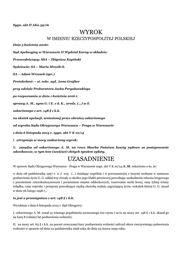 Sygn. akt II AKa 39/16 WYROK W IMIENIU RZECZYPOSPOLITEJ POLSKIEJ Dnia 5 kwietnia 2016r. Sąd Apelacyjny w Warszawie II Wydział Karny w składzie: Przewodniczący: SSA – Zbigniew Kapiński Sędziowie: SA – Maria Mrozik-S. SA – Adam Wrzosek (spr.) Protokolant: – st. sekr. sąd. Anna Grajber przy udziale Prokuratora Jacka Pergałowskiego po rozpoznaniu w dniu 1 kwietnia 2016 r. sprawy A. M., syna G. i E. z d. K., urodz. (...) w E. oskarżonego z art. 148 § 1 k.k. na skutek apelacji, wniesionej przez obrońcę oskarżonego od wyroku Sądu Okręgowego Warszawa – Praga w Warszawie z dnia 6 listopada 2015 r. sygn. akt V K 10/14 I. utrzymuje w mocy zaskarżony wyrok; II. zasądza od oskarżonego A. M. na rzecz Skarbu Państwa koszty sądowe za postępowanie odwoławcze, w tym 600 (sześćset) złotych tytułem opłaty. UZASADNIENIE W sprawie Sądu Okręgowego Warszawa - Praga w Warszawie sygn. akt V K 10/14 A. M. oskarżono o to, że: w dniu 08 października 1997 r. w J. woj. (...) działając wspólnie i w porozumieniu z innymi osobami w zamiarze pozbawienia życia G. G. oddał trzy strzały w okolice jego klatki piersiowej powodując uszkodzenie rdzenia kręgowego z porażeniem czterokończynowym i porażeniem mięśni oddechowych, rozerwanie nerki lewej, rany tylnej ściany żołądka, ranę wątroby i przepony powodujące ciężką chorobę realnie zagrażającą życiu, wskutek której G. G. zmarł w dniu 06 lutego 1998 r., to jest o przestępstwo z art. 148 § 1 k.k. Wyrokiem z dnia 6 listopada 2015 r. Sąd Okręgowy: I. oskarżonego A. M. uznał za winnego popełnienia zarzucanego mu czynu i za to na mocy art. 148 § 1 k.k. skazał go na karę 8 (ośmiu) lat pozbawienia wolności; II. na mocy art. 63 § 1 k.k. na poczet orzeczonej kary pozbawienia wolności zaliczył okres rzeczywistego pobawienia wolności w sprawie od dnia 22 października 1998 roku do dnia 23 marca 1999 roku; III. na mocy art. 44 § 2 k.k. orzekł przepadek dowodów rzeczowych, opisanych w wykazie dowodów rzeczowych pod pozycjami 1, 2, 3 i 13 na karcie 73 akt sprawy; IV. na mocy art. 230 § 2 k.p.k. nakazał zwrócić R. S. dowody rzeczowe opisane w wykazie dowodów rzeczowych pod pozycjami 4 - 10 na karcie 73 akt sprawy; V. zasądził od oskarżonego A. M. na rzecz Skarbu Państwa kwotę 600 złotych tytułem opłaty oraz pozostałe koszty sądowe. Od powyższego wyroku apelację złożył obrońca oskarżonego. Zaskarżył on wyrok w całości, zarzucając błąd w ustaleniach faktycznych przyjętych za jego podstawę, który miał wpływ na treść wyroku, a polegał na bezkrytycznym uznaniu części zeznań świadka M. M. jako wiarygodnych, o ile tylko można było z nich wyinterpretować winę oskarżonego, przy jednoczesnym niedostrzeganiu środków dowodowych o wyjątkowej doniosłości w tej sprawie, gdyż jedynych - w postaci: a) oświadczenia pokrzywdzonej R. S., b) badań DNA ( str. 13 motywów wyroku), c) oświadczenia M. M., po raz pierwszy „postawionego do oczu”, który zaprzeczył udziałowi oskarżonego w zdarzeniu, jednocześnie wskazując, że okazane mu zdjęcie w postępowaniu przygotowawczym było podobne do sprawcy zabójstwa. W konkluzji apelacji obrońca wniósł o zmianę zaskarżonego wyroku i uniewinnienie oskarżonego od zarzucanego mu czynu. Sąd Apelacyjny zważył, co następuje: Apelacja nie zasługuje na uwzględnienie. Sąd Okręgowy dokonał wszechstronnej i wnikliwej analizy całokształtu zebranego w sprawie materiału dowodowego i poczynił trafne ustalenia faktyczne. Sąd rozpoznający sprawę dostrzegł różnicę pomiędzy poszczególnymi relacjami złożonymi przez M. M. i ma w pełni rację, że pierwsze zeznania tego świadka złożone w dniu 9 października 1997 r. (k. 46 - 47v) nie mogły być miarodajne w części dotyczącej przebiegu przedmiotowego zdarzenia. Świadek ten podczas kolejnego przesłuchania w dniu 9 października 1997 r. stwierdził, że w powyższym zakresie jego wcześniejsze zeznania nie są zgodne z prawdą, a złożył je z obawy o własne bezpieczeństwo (k. 48 - 49v). Nadto należy zauważyć, że zdarzenie nie mogło przebiegać w sposób opisany przez M. M. podczas pierwszego przesłuchania także z tego względu, że - zdaniem świadka - samochód pokrzywdzonego miał być widoczny z szosy, którą świadek jechał w kierunku W. i przed tym samochodem leżał pokrzywdzony, gdy tymczasem miejsce gdzie postrzelono G. G. i gdzie znajdowały się łuski z nabojów wystrzelonych z broni palnej, znajdowało się kilkaset metrów od szosy. Podstawą ustaleń faktycznych były zeznania złożone przez M. M. podczas drugiego przesłuchania w postępowaniu przygotowawczym, w którym wskazał, że z A. T. był bezpośrednim świadkiem oddania strzałów do pokrzywdzonego i opisał przebieg zdarzenia. Sąd Okręgowy w uzasadnieniu zaskarżonego wyroku zasadnie podniósł, że z powyższymi zeznaniami M. M. korespondują wyniki oględzin miejsca zdarzenia, znalezione tam 3 łuski od nabojów pistoletowych (...)odstrzelone były z jednego egzemplarza broni, pociski wydobyte z ciała pokrzywdzonego są (...), a z ekspertyzy z zakresu badań fizykochemicznych wynika, że na odzieży pokrzywdzonego G. G. tj. podkoszulce, koszulce z krótkim rękawem, męskiej koszuli oraz kamizelce, stwierdzono obecność uszkodzeń o charakterze przestrzelin pochodzących od przelotu dwóch pocisków, przy czym uszkodzenia te umiejscowione były w tylnej części odzieży w miejscach przedstawionych w dokumentacji fotograficznej (str. 11 uzasadnienia zaskarżonego wyroku). Sąd Okręgowy dostrzegł też, że powyższe zeznania M. M. korelują w dużej mierze z zeznaniami A. T., a różnice dotyczą momentu dostrzeżenia samochodu pokrzywdzonego, miejsca w którym ten samochód się znajdował, ilości samochodów na miejscu zdarzenia, sposobu i ilości strzałów oddanych do G. G. oraz charakterystycznych cech oskarżonego i jego ubioru (str. 6 uzasadnienia zaska