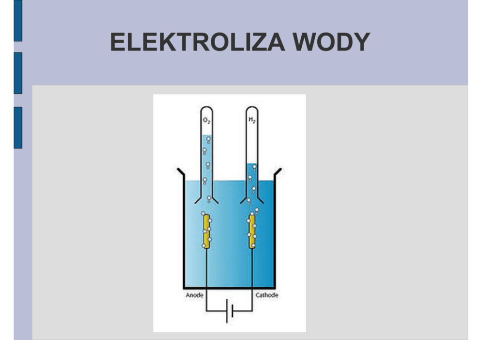 ELEKTROLIZA WODY Elektroliza Całokształt procesów niesamorzutnych, przebiegających na elektrodach, wymuszonych przez przepływa prądu elektrycznego. Praktyczne zastosowanie procesu elektrolizy. Otrzymywanie metali o dużym stopniu czystości, Powlekanie metali warstwą innego metalu (galwanizacja), Oczyszczanie metali z zanieczyszczeń, Otrzymywanie gazów, Akumulatory. Zestaw do elektrolizy Elektrolizer Dwie elektrody (ujemna katoda i dodatnia anoda) Źródło prądu elektrycznego Równania elektrodowe Na przykładzie CuCl2: CuCl2 → Cu2+ + 2ClK(-) Cu2+ + 2 e- → Cu A(+) 2Cl- - 2e- → Cl2 Doświadczenie Do doświadczenia potrzebne nam będą: krystalizator z wodą pipeta Pasteura kapilarna bateria 9V dwa przewody krokodylkowe zapałki dwie szpilki Banieczkę pipety Pasteura wypełnić w ¾ objętości zalkalizowaną wodą. Poprzez banieczkę przebić na wylot dwie szpilki, tak aby się nie dotykały i były zanurzone w cieczy. Pipetę należy trzymać w pionowej pozycji. Wylot pipety wygiąć i zanurzyć w wodzie z płynem do mycia naczyń, znajdującej się w krystalizatorze. Do szpilek podłączyć przewody krokodylkowe i baterię 9V. UWAGA należy zbierać tylko małe ilości gazów. Równania elektrolizy wody 2H2O → 2H2↑ + O2↑ Równania elektrolizy wody Elektroliza wody – proces rozkładu wody na wodór (powstający na katodzie) i tlen (powstający na anodzie), odbywający się w wyniku przepływu prądu elektrycznego (na przykład w elektrolizerze Hofmanna). elektrolizer Hofmanna Rysunek aparatu z książki Hofmanna z 1866 roku