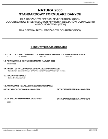 FORMULARZ DANYCH 1 NATURA 2000 STANDARDOWY FORMULARZ DANYCH DLA OBSZARÓW SPECJALNEJ OCHRONY (OSO) DLA OBSZARÓW SPEŁNIAJĄCYCH KRYTERIA OBSZARÓW O ZNACZENIU WSPÓLNOTOWYM (OZW) I DLA SPECJALNYCH OBSZARÓW OCHRONY (SOO) 1. IDENTYFIKACJA OBSZARU 1.1. TYP 1.2. KOD OBSZARU 1.3. DATA OPRACOWANIA 1.4. DATA AKTUALIZACJI J PLB300002 2002-05 2011-09 1.5 POWIĄZANIA Z INNYMI OBSZARAMI NATURA 2000 PLH300009 1.6. INSTYTUCJA LUB OSOBA ZBIERAJĄCA INFORMACJE: Departament Obszarów Natura 2000, Generalna Dyrekcja Ochrony Środowiska 1.7. NAZWA OBSZARU: Dolina Środkowej Warty 1.8. WSKAZANIE I ZAKLASYFIKOWANIE OBSZARU: DATA ZAPROPONOWANIA JAKO OZW DATA ZATWIERDZENIA JAKO OZW DATA ZAKLASYFIKOWANIA JAKO OSO DATA ZATWIERDZENIA JAKO SOO 2004-11 wydrukowano przy uŜyciu programu Ostoje wersja 3.0 2011-11-16 OBSZAR: PLB300002 Dolina Środkowej Warty NATURA 2000 FORMULARZ DANYCH 2. POŁOśENIE OBSZARU 2.1. POŁOśENIE CENTRALNEGO PUNKTU OBSZARU DŁUGOŚĆ GEOGRAFICZNA E 18 5 SZEROKOŚĆ GEOGRAFICZNA 49 2.2. POWIERZCHNIA (ha): N 52 12 33 2.3. DŁUGOŚĆ OBSZARU (km): 57 104.4 2.4. WYSOKOŚĆ (m n.p.m.): MINIMALNA 20 MAKSYMALNA ŚREDNIA 60 40 2.5. REGION ADMINISTRACYJNY (NUTS) Kod PL116 PL414 PL416 PL418 Nazwa regionu Sieradzki Koniński Kaliski Poznański % 7 86 3 4 2.6. REGION BIOGEOGRAFICZNY Nazwa regionu biogeograficznego Kontynentalny 2/ 1 2 OBSZAR: PLB300002 Dolina Środkowej Warty NATURA 2000 FORMULARZ DANYCH 3. INFORMACJA PRZYRODNICZA 3.1. Typy SIEDLISK znajdujące się na terenie obszaru Natura 2000 oraz ocena znaczenia obszaru dla tych siedlisk 3.1.a. Typy SIEDLISK wymienione w Załączniku I Dyrektywy Rady 92/43/EWG Kod 1340 2330 3140 3150 3160 4030 6210 6230 6410 6430 6440 6510 7210 9170 9190 91E0 91F0 Nazwa siedliska Śródlądowe słone łąki, pastwiska i szuwary (Glauco-Puccinietalia część - zbiorowiska śródlądowe) Wydmy śródlądowe z murawami napiaskowymi Twardowodne oligo- i mezotroficzne zbiorniki wodne z podwodnymi łąkami ramienic Charetea Starorzecza i naturalne eutroficzne zbiorniki wodne ze zbiorowiskami z Nympheion, Potamion Naturalne, dystroficzne zbiorniki wodne Suche wrzosowiska (Calluno-Genistion, Pohlio-Callunion, Calluno-Arctostaphylion) Murawy kserotermiczne (Festuco-Brometea) - priorytetowe są tylko murawy z istotnymi stanowiskami storczyków Górskie i niŜowe murawy bliźniczkowe (Nardion - płaty bogate florystycznie) Zmiennowilgotne łąki trzęślicowe (Molinion) Ziołorośla górskie (Adenostylion alliariae) i ziołorośla nadrzeczne (Convolvuletalia sepium) Łąki selemicowe (Cnidion dubii) NiŜowe i górskie świeŜe łąki uŜytkowane ekstensywnie (Arrhenatherion elatioris) Torfowiska nakredowe (Cladietum marisci, Caricetum buxbaumii, Schoenetum nigricantis) Grąd środkowoeuropejski i subkontynentalny (Galio-Carpinetum, Tilio-Carpinetum) Pomorski kwaśny las brzozowo-dębowy (Betulo-Quercetum) Łęgi wierzbowe, topolowe, olszowe i jesionowe (Salicetum albo-fragilis, Populetum albae, Alnenion Łęgowe lasy dębowo-wiązowo-jesionowe (Ficario-Ulmetum) Stopień Względna Stan % pokrycia Reprezen. powierzch zachow. 1.00 2.00 1.00 3.00 1.00 1.00 2.00 5.00 3.00 1.00 1.00 1.00 1.00 1.00 1.00 3.00 1.00 Ocena ogólna D D D D D D D D D D D D D D D D D 3.1 / 1 3 OBSZAR: PLB300002 Dolina Środkowej Warty NATURA 2000 FORMULARZ DANYCH 3.2. GATUNKI, których dotyczy Artykuł 4 Dyrektywy Rady 79/409/EWG i gatunki wymienione w Załączniku II Dyrektywy Rady 92/43/EWG oraz ocena znaczenia obszaru dla tych gatunków 3.2.a. PTAKI wymienione w Załączniku I Dyrektywy Rady 79/409/EWG KOD NAZWA POPULACJA OSIADŁA Rozrodcza A021 A022 A023 A027 A030 A031 A037 A038 A068 A072 A073 A074 A075 A081 A082 A084 A089 A119 A120 A122 A127 A140 A151 A154 A193 A195 A196 A197 A222 A224 A229 A234 A236 A238 A246 A255 A272 A307 A320 A321 A338 A379 Botaurus stellaris Ixobrychus minutus Nycticorax nycticorax Egretta alba (Ardea alba) Ciconia nigra Ciconia ciconia Cygnus bewickii (Cygnus Cygnus cygnus Mergus albellus (Mergellus albellus) Pernis apivorus Milvus migrans Milvus milvus Haliaeetus albicilla Circus aeruginosus Circus cyaneus Circus pygargus Aquila pomarina Porzana porzana Porzana parva Crex crex Grus grus Pluvialis apricaria Philomachus pugnax Gallinago media Sterna hirundo Sternula albifrons Chlidonias hybrida Chlidonias niger Asio flammeus Caprimulgus europaeus Alcedo atthis Picus canus Dryocopus martius Dendrocopos medius Lullula arborea Anthus campestris Luscinia svecica Sylvia nisoria Ficedula parva Ficedula albicollis Lanius collurio Emberiza hortulana OCENA ZNACZENIA OBSZARU MIGRUJĄCA Zimująca Populacja Stan zach. Izolacja 30-40 5-10 0-3 23 5-11 210-220 12 20 9 4-7 0-3 1-3 1-2 40-60 P? 10 0-1 25-50 12 130-150 60-75 0-2 0-2 2-25 10 200 120-250 1 10 25-35 3-4 70-85 185-220 200 40 12-25 140-160 1-3 0-1 300 120-180 Ogólnie Przelotna 250 400 1200 C C D D D C D D D D D D D C D C D C D C C D D D D B B B D D C D D C D D C D D D D D B B C C C C B C C B C C B C C B C C C C C B C C C C C B B B B C C B C C B C C 3.2 / 1 3 OBSZAR: PLB300002 Dolina Środkowej Warty NATURA 2000 FORMULARZ DANYCH 3.2.b. Regularnie występujące Ptaki Migrujące nie wymienione w Załączniku I Dyrektywy Rady 79/409/EWG KOD NAZWA POPULACJA OSIADŁA Rozrodcza A008 A028 A043 A050 A051 A052 A054 A055 A056 A137 A142 A153 A156 A160 A162 A168 A198 A232 Podiceps nigricollis Ardea cinerea Anser anser Anas penelope Anas strepera Anas crecca Anas acuta Anas querquedula Anas clypeata Charadrius hiaticula Vanellus vanellus Gallinago gallinago Limosa limosa Numenius arquata Tringa totanus Actitis hypoleucos Chlidonias leucopterus Upupa epops OCENA ZNACZENIA OBSZARU MIGRUJĄCA Populacja Stan zach. Izolacja Zimująca 10-60 210-300 165-210 Ogólnie Przelotna D C B D C C D B B C D C B C B D D C 480 1500 70-75 14-23 0-2 50-90 55-80 0-10 350-500 120-200 75-125 10-14 100-170 10-15 130 150-180 C B C C C B B B C C C C B B B C C C B B C B B B B C C C C C B C B C C C 3.2.c. SSAKI wymienione w Załączniku II Dyrektywy Rady 92/43/EWG KOD N