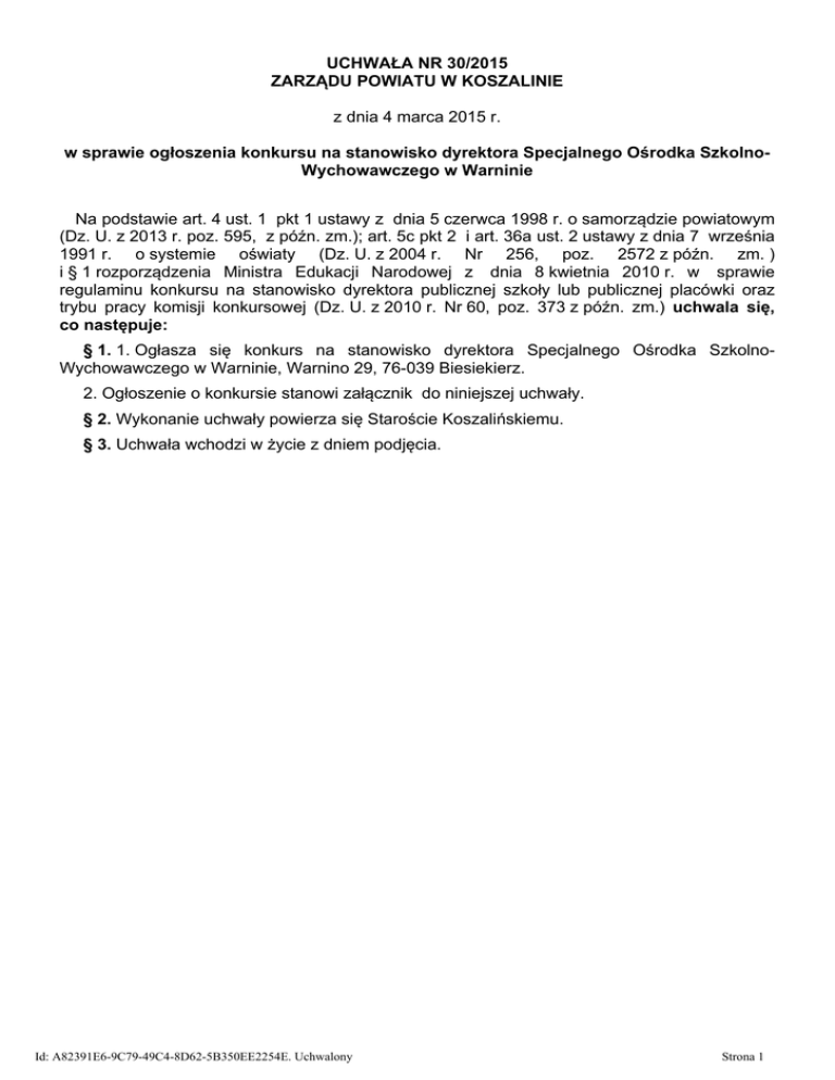 UCHWAŁA NR 30/2015 ZARZĄDU POWIATU W KOSZALINIE z dnia 4 marca 2015 r. w sprawie ogłoszenia konkursu na stanowisko dyrektora Specjalnego Ośrodka SzkolnoWychowawczego w Warninie Na podstawie art. 4 ust. 1 pkt 1 ustawy z dnia 5 czerwca 1998 r. o samorządzie powiatowym (Dz. U. z 2013 r. poz. 595, z późn. zm.); art. 5c pkt 2 i art. 36a ust. 2 ustawy z dnia 7 września 1991 r. o systemie oświaty (Dz. U. z 2004 r. Nr 256, poz. 2572 z późn. zm. ) i § 1 rozporządzenia Ministra Edukacji Narodowej z dnia 8 kwietnia 2010 r. w sprawie regulaminu konkursu na stanowisko dyrektora publicznej szkoły lub publicznej placówki oraz trybu pracy komisji konkursowej (Dz. U. z 2010 r. Nr 60, poz. 373 z późn. zm.) uchwala się, co następuje: § 1. 1. Ogłasza się konkurs na stanowisko dyrektora Specjalnego Ośrodka SzkolnoWychowawczego w Warninie, Warnino 29, 76-039 Biesiekierz. 2. Ogłoszenie o konkursie stanowi załącznik do niniejszej uchwały. § 2. Wykonanie uchwały powierza się Staroście Koszalińskiemu. § 3. Uchwała wchodzi w życie z dniem podjęcia. Id: A82391E6-9C79-49C4-8D62-5B350EE2254E. Uchwalony Strona 1 Załącznik do Uchwały Nr 30/2015 Zarządu Powiatu w Koszalinie z dnia 4 marca 2015 r. Zarząd Powiatu w Koszalinie ogłasza konkurs na stanowisko dyrektora Specjalnego Ośrodka SzkolnoWychowawczego w Warninie, Warnino 29, 76-039 Biesiekierz 1. Do konkursu może przystąpić osoba, która spełnia wymagania określone w § 1, § 2 ust. 1, § 5 ust. 1 oraz § 10 rozporządzenia Ministra Edukacji Narodowej z dnia 27 października 2009 r. w sprawie wymagań, jakim powinna odpowiadać osoba zajmująca stanowisko dyrektora oraz inne stanowisko kierownicze, w poszczególnych typach publicznych szkół i rodzajach publicznych placówek (Dz. U. z 2009 Nr 184, poz. 1436; z 2011 r. Nr 254, poz. 1526). 2. Zgodnie z § 1 ust. 2 pkt 4 rozporządzenia Ministra Edukacji Narodowej z dnia 8 kwietnia 2010 r. w sprawie regulaminu konkursu na stanowisko dyrektora publicznej szkoły lub publicznej placówki oraz trybu pracy komisji konkursowej (Dz. U. z 2010 r. Nr 60, poz. 373; z 2011r. Nr 254, poz. 1525) oferty kandydatów przystępujących do konkursu powinny zawierać: a) uzasadnienie przystąpienia do konkursu oraz koncepcję funkcjonowania i rozwoju placówki publicznej, b) poświadczoną przez kandydata za zgodność z oryginałem kopię dowodu osobistego lub innego dokumentu potwierdzającego tożsamość oraz poświadczającego obywatelstwo kandydata, c) życiorys z opisem informację o: przebiegu pracy zawodowej, zawierający w szczególności - stażu pracy pedagogicznej – w przypadku nauczyciela albo - stażu pracy dydaktycznej – w przypadku nauczyciela akademickiego, albo - stażu pracy, w tym stażu pracy na stanowisku kierowniczym – w przypadku osoby niebędącej nauczycielem, d) oryginały lub poświadczone przez kandydata za zgodność z oryginałem kopie dokumentów potwierdzających posiadanie wymaganego stażu pracy, o którym mowa w lit. c, e) oryginały lub poświadczone przez kandydata za zgodność z oryginałem kopie dokumentów potwierdzających posiadanie wymaganego wykształcenia, w tym dyplomu ukończenia studiów wyższych lub świadectwa ukończenia studiów podyplomowych z zakresu zarządzania albo świadectwa ukończenia kursu kwalifikacyjnego z zakresu zarządzania oświatą, f) zaświadczenie lekarskie o braku przeciwwskazań zdrowotnych do wykonywania pracy na stanowisku kierowniczym, g) oświadczenie, że przeciwko kandydatowi nie toczy się postępowanie o przestępstwo ścigane z oskarżenia publicznego lub postępowanie dyscyplinarne, Id: A82391E6-9C79-49C4-8D62-5B350EE2254E. Uchwalony Strona 1 h) oświadczenie, że kandydat nie był skazany prawomocnym wyrokiem za umyślne przestępstwo lub umyślne przestępstwo skarbowe, i) oświadczenie, że kandydat nie był karany zakazem pełnienia funkcji związanych z dysponowaniem środkami publicznymi, o których mowa w art. 31 ust. 1 pkt. 4 ustawy z dnia 17 grudnia 2004 r. o odpowiedzialności za naruszenie dyscypliny finansów publicznych (Dz. U. z 2013 r. poz. 168 j.t.), j) oryginał lub poświadczoną przez kandydata za zgodność z oryginałem kopię aktu nadania stopnia nauczyciela mianowanego lub dyplomowanego – w przypadku nauczyciela, k) oryginał lub poświadczona przez kandydata za zgodność z oryginałem kopię karty oceny pracy lub oceny dorobku zawodowego - w przypadku nauczyciela i nauczyciela akademickiego, l) oświadczenie, że kandydat nie był karany karą dyscyplinarną, o której mowa w art. 76 ust. 1 ustawy z dnia 26 stycznia 1982 r. – Karta Nauczyciela (Dz. U z 2014 r. poz. 191 j.t.) lub w art. 140 ust. 1 ustawy z dnia 27 lipca 2005 r. Prawo o szkolnictwie wyższym (Dz. U. z 2012 r. poz. 572, z późn. zm.) – w przypadku nauczyciela i nauczyciela akademickiego, ł) oświadczenie, że kandydat ma pełną zdolność do czynności prawnych i korzysta z pełni praw publicznych – w przypadku osoby niebędącej nauczycielem, m) oświadczenie, że kandydat wyraża zgodę na przetwarzanie danych osobowych zgodnie z ustawą z dnia 29 sierpnia 1997 r. o ochronie danych osobowych (Dz. U. z 2014 r. poz. 1182 z późn. zm.) w celach przeprowadzenia konkursu na stanowisko dyrektora. 3. Wszelkie sporządzone osobiście przez kandydata dokumenty winny być własnoręcznie podpisane. 4. Oferty należy składać w Kancelarii Ogólnej Starostwa Powiatowego w Koszalinie, ul. Racławicka 13, 75-620 Koszalin (parter) w zamkniętych kopertach z podanym adresem zwrotnym, kontaktem telefonicznym i dopiskiem „Konkurs na stanowisko dyrektora Specjalnego Ośrodka Szkolno-Wychowawczego w Warninie” w terminie 21 dni od dnia ukazania się ogłoszenia: a) na tablicy ogłoszeń Starostwa Powiatowego w Koszalinie, ul. Racławicka 13, 75-620 Koszalin - IV piętro, tablica przy pokoju 408, b) w Biuletynie Informacji bip.powiat.koszalin.pl Publicznej Starostwa Powiatowego w Koszalinie - c) na stronie intern