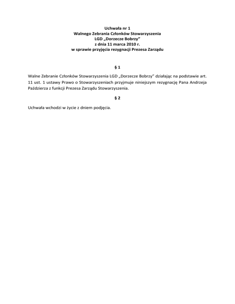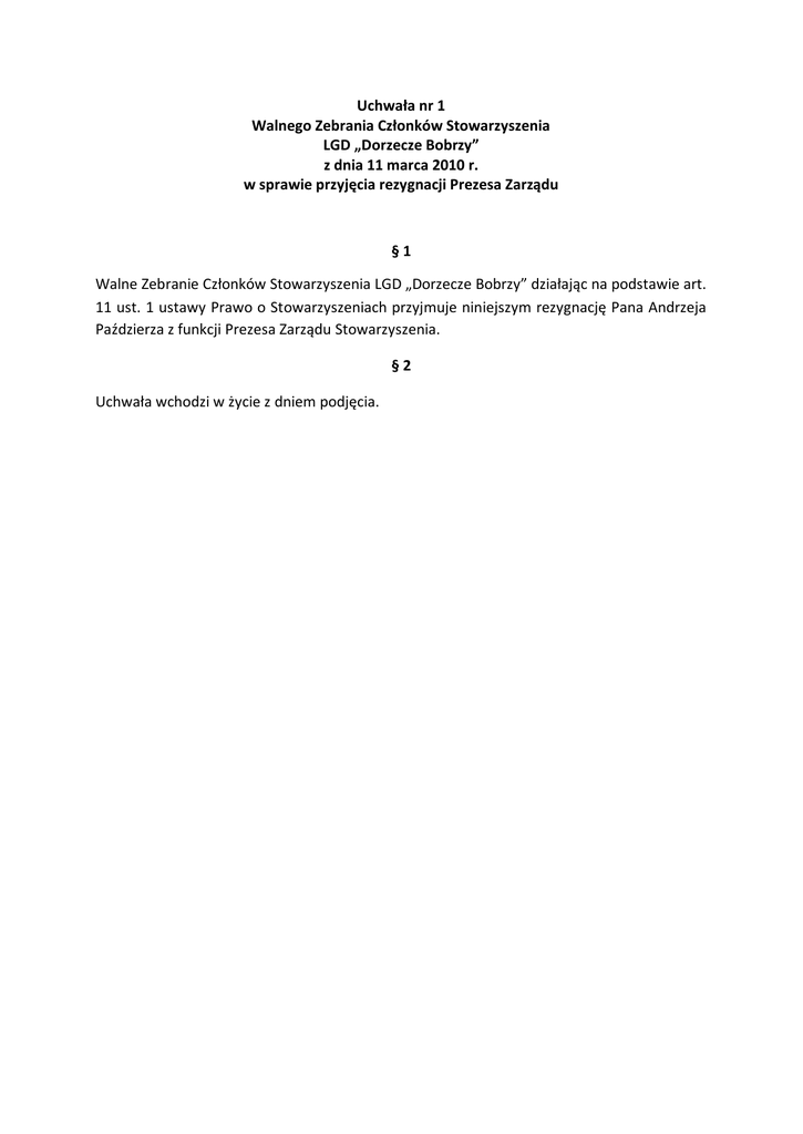 Uchwała nr 1 Walnego Zebrania Członków Stowarzyszenia LGD „Dorzecze Bobrzy” z dnia 11 marca 2010 r. w sprawie przyjęcia rezygnacji Prezesa Zarządu §1 Walne Zebranie Członków Stowarzyszenia LGD „Dorzecze Bobrzy” działając na podstawie art. 11 ust. 1 ustawy Prawo o Stowarzyszeniach przyjmuje niniejszym rezygnację Pana Andrzeja Paździerza z funkcji Prezesa Zarządu Stowarzyszenia. §2 Uchwała wchodzi w życie z dniem podjęcia. Uchwała nr 2 Walnego Zebrania Członków Stowarzyszenia LGD „Dorzecze Bobrzy” z dnia 11 marca 2010 r. w sprawie rezygnacji z funkcji Wiceprezesa Zarządu §1 Walne Zebranie Członków Stowarzyszenia LGD „Dorzecze Bobrzy” działając na podstawie art. 11 ust. 1 ustawy Prawo o Stowarzyszeniach przyjmuje niniejszym rezygnację z funkcji Wiceprezesa Zarządu Stowarzyszenia: - Pani Anny Gad - Pani Justyny Ślewy §2 Uchwała wchodzi w życie z dniem podjęcia. Uchwała nr 3 Walnego Zebrania Członków Stowarzyszenia LGD „Dorzecze Bobrzy” z dnia 11 marca 2010 r. w sprawie odwołania i rezygnacji z funkcji Członka Rady. §1 Walne Zebranie Członków Stowarzyszenia LGD „Dorzecze Bobrzy” działając na podstawie art. 11 ust. 1 ustawy Prawo o Stowarzyszeniach przyjmuje niniejszym rezygnację Pana Tomasza Zbróga, Zbigniewa Zagdaoskiego z funkcji Członka Rady Stowarzyszenia oraz wniosek o odwołanie Pani Justyny Dziubeły z funkcji Członka Rady Stowarzyszenia. §2 Uchwała wchodzi w życie z dniem podjęcia. Uchwała nr 4 Walnego Zebrania Członków Stowarzyszenia LGD „Dorzecze Bobrzy” z dnia 11 marca 2010 r. w sprawie zatwierdzenia sprawozdania finansowego za 2008 rok §1 Walne Zebranie Członków Stowarzyszenia LGD „Dorzecze Bobrzy” zatwierdza sprawozdanie finansowe za rok 2008. §2 Wykonanie uchwały powierza się Zarządowi Stowarzyszenia. §3 Uchwała wchodzi w życie z dniem podjęcia. Uchwała nr 5 Walnego Zebrania Członków Stowarzyszenia LGD „Dorzecze Bobrzy” z dnia 11 marca 2010 r. w sprawie wyboru na stanowisko Wiceprezesa Zarządu Stowarzyszenia LGD „Dorzecze Bobrzy”. §1 Walne Zebranie Członków Stowarzyszenia LGD „Dorzecze Bobrzy” działając na podstawie §15 ust. 3 pkt. 3 Statutu Stowarzyszenia wybiera na stanowisko Wiceprezesa Zarządu Stowarzyszenia Pana/Panią: 1. Andrzeja Pażdzierza 2. Kamilę Grela - Oleś 3. Lidię Putowską §2 Uchwała wchodzi w życie z dniem podjęcia. Uchwała nr 6 Walnego Zebrania Członków Stowarzyszenia LGD „Dorzecze Bobrzy” z dnia 11 marca 2010 r. w sprawie wyboru na Członka Rady LGD „Dorzecze Bobrzy”. §1 Walne Zebranie Członków Stowarzyszenia LGD „Dorzecze Bobrzy” działając na podstawie §15 ust. 3 pkt. 3 Statutu Stowarzyszenia wybiera na Członka Rady Pana/Panią: 1. Łukasza Królika 2. Jana Łakomca 3. Ewę Kitę §2 Uchwała wchodzi w życie z dniem podjęcia. Uchwała nr 7 Walnego Zebrania Członków Stowarzyszenia LGD „Dorzecze Bobrzy” z dnia 11 marca 2010 r. w sprawie upoważnienia Zarządu LGD „Dorzecze Bobrzy” do dokonywania zmian w załącznikach do LSR. §1 Działając zgodnie z § 15 ust. 3 pkt. 1 Statutu Stowarzyszenia oraz ustawą Prawo o Stowarzyszeniach – Walne Zebranie Członków uchwala: 1) Upoważnia się Zarząd Stowarzyszenia do dokonywania zmian w załącznikach LSR §2 Traci moc uchwała nr 4 Walnego Zebrania Członków Stowarzyszenia LGD „Dorzecze Bobrzy” z dnia 9 października 2009 r. w sprawie upoważnienia Zarządu LGD „Dorzecze Bobrzy” do aktualizacji Lokalnej Strategii Rozwoju oraz dokonywania zmian w Procedurach oceny zgodności operacje z LSR i oceny wg lokalnych kryteriów wyboru. §3 Wykonanie niniejszej uchwały powierza się Zarządowi Stowarzyszenia. §4 Uchwała wchodzi w życie z dniem podjęcia. Uchwała nr 8 Walnego Zebrania Członków Stowarzyszenia LGD „Dorzecze Bobrzy” z dnia 11 marca 2010 r. w sprawie ustalenia wysokości rocznych składek członków. §1 Walne Zebranie Członków Stowarzyszenia LGD „Dorzecze Bobrzy” na podstawie § 15, ust. 6 pkt. 8 Statutu uchwala wysokośd rocznych składek członkowskich: 1) Podmioty gospodarcze – 30 zł/r. 2) Członkowie zwyczajni – 12 zł/r. §2 Wykonanie niniejszej uchwały powierza się Zarządowi Stowarzyszenia. §3 Uchwała wchodzi w życie z dniem podjęcia. Uchwała nr 9 Walnego Zebrania Członków Stowarzyszenia LGD „Dorzecze Bobrzy” z dnia 11 marca 2010 r. w sprawie dokonania zmian w Statucie Stowarzyszenia. §1 Walne Zebranie Członków Stowarzyszenia LGD „Dorzecze Bobrzy” działając na podstawie § 15. ust. 3 pkt. 6 dokonuje zmian w Statucie Stowarzyszenia, zgodnie z projektem zmian stanowiącym załącznik nr 1 do niniejszej uchwały. §2 Wykonanie uchwały wraz z czynnościami niezbędnymi w celu aktualizacji danych w stosownych rejestrach i organach powierza się Zarządowi Stowarzyszenia. §3 Uchwała wchodzi w życie z dniem podjęcia. Uchwała nr 10 Walnego Zebrania Członków Stowarzyszenia LGD „Dorzecze Bobrzy” z dnia 11 marca 2010 r. w sprawie zmian w Lokalnej Strategii Rozwoju. §1 Działając zgodnie z ustawą Prawo o Stowarzyszeniach – Walne Zebranie Członków zmienia dotychczasową treśd LSR LGD „Dorzecze Bobrzy” w sposób następujący: 1) Dokonuje się zmian w LSR wg projektu, stanowiącego załącznik nr 1 do niniejszej uchwały. §2 Traci moc Uchwała 3 Walnego Zebrania Członków Stowarzyszenia Lokalna Grupa Działania „Dorzecze Bobrzy” z dnia 9 października 2009r. w sprawie zatwierdzenia zmian Lokalnej Strategii Rozwoju LGD „Dorzecze Bobrzy” §3 Wykonanie niniejszej uchwały powierza się Zarządowi Stowarzyszenia. §4 Uchwała wchodzi w życie z dniem podjęcia.
