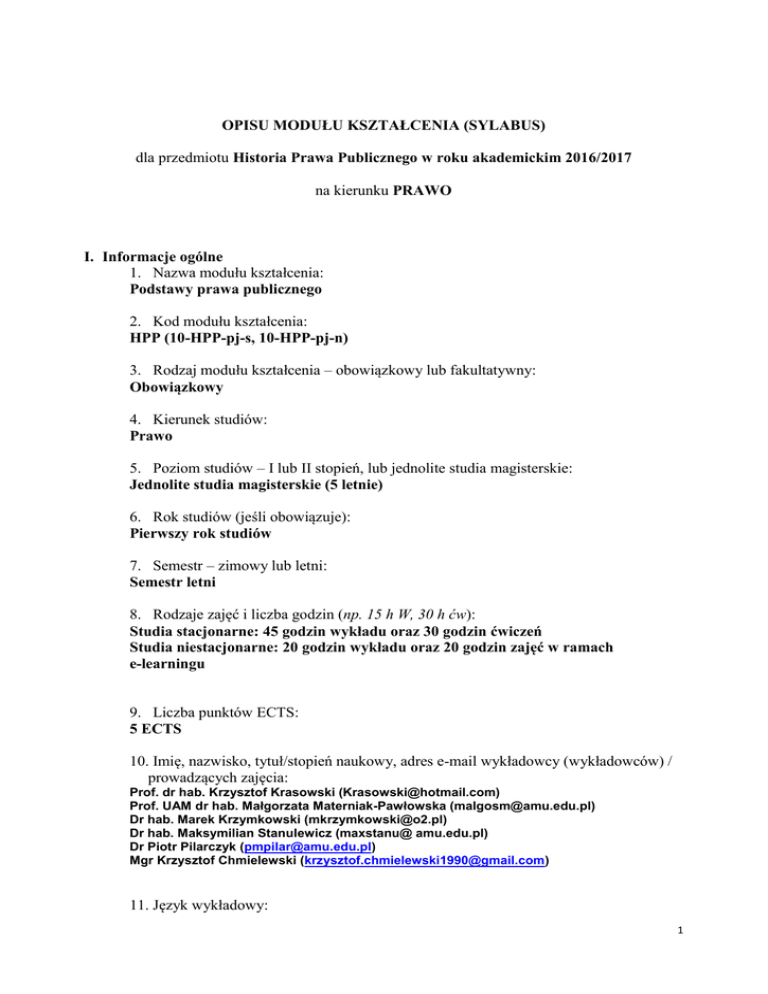 OPISU MODUŁU KSZTAŁCENIA (SYLABUS) dla przedmiotu Historia Prawa Publicznego w roku akademickim 2016/2017 na kierunku PRAWO I. Informacje ogólne 1. Nazwa modułu kształcenia: Podstawy prawa publicznego 2. Kod modułu kształcenia: HPP (10-HPP-pj-s, 10-HPP-pj-n) 3. Rodzaj modułu kształcenia – obowiązkowy lub fakultatywny: Obowiązkowy 4. Kierunek studiów: Prawo 5. Poziom studiów – I lub II stopień, lub jednolite studia magisterskie: Jednolite studia magisterskie (5 letnie) 6. Rok studiów (jeśli obowiązuje): Pierwszy rok studiów 7. Semestr – zimowy lub letni: Semestr letni 8. Rodzaje zajęć i liczba godzin (np. 15 h W, 30 h ćw): Studia stacjonarne: 45 godzin wykładu oraz 30 godzin ćwiczeń Studia niestacjonarne: 20 godzin wykładu oraz 20 godzin zajęć w ramach e-learningu 9. Liczba punktów ECTS: 5 ECTS 10. Imię, nazwisko, tytuł/stopień naukowy, adres e-mail wykładowcy (wykładowców) / prowadzących zajęcia: Prof. dr hab. Krzysztof Krasowski ([email protected]) Prof. UAM dr hab. Małgorzata Materniak-Pawłowska ([email protected]) Dr hab. Marek Krzymkowski ([email protected]) Dr hab. Maksymilian Stanulewicz (maxstanu@ amu.edu.pl) Dr Piotr Pilarczyk ([email protected]) Mgr Krzysztof Chmielewski ([email protected]) 11. Język wykładowy: 1 Język polski II. Informacje szczegółowe 1. Cel (cele) modułu kształcenia: Zdobycie przez studenta wiedzy z zakresu podstawowych zagadnień ustrojowych, ze szczególnym uwzględnieniem rozwoju prawa publicznego, instytucji publicznych, struktur administracyjnych oraz organów wymiaru sprawiedliwości. 2. Wymagania wstępne w zakresie wiedzy, umiejętności oraz kompetencji społecznych (jeśli obowiązują) Brak szczególnych wymagań w zakresie wiedzy, umiejętności i kompetencji społecznych. 3. Efekty kształcenia w zakresie wiedzy, umiejętności oraz kompetencji społecznych dla modułu kształcenia i odniesienie do efektów kształcenia dla kierunku studiów (UWAGA: nie dzielimy efektów kształcenia dla modułów (przedmiotów) na kategorie wiedzy, umiejętności i kompetencji społecznych; każdy moduł (przedmiot) nie musi obejmować wszystkich trzech kategorii efektów kształcenia; jeśli efektem kształcenia jest np. analiza wymagająca określonej wiedzy, to nie trzeba oddzielnie definiować efektów kształcenia w kategorii wiedzy) Symbol efektów kształcenia* Po zakończeniu modułu (przedmiotu) Odniesienie do efektów i potwierdzeniu osiągnięcia efektów kształcenia dla kierunku kształcenia student potrafi: studiów# HPP_01 Posiada rozszerzoną wiedzę na temat K_W06 kształtowania się prawa publicznego HPP_02 Potrafi scharakteryzować podstawowe zasady funkcjonowania państwa na przestrzeni wieków K_W07 HPP_03 Potrafi interpretować historyczne źródła prawa publicznego dotyczące różnorodnej tematyki ustrojowej od czasów średniowiecza do XX wieku K_U04 HPP_04 Posiada poszerzoną wiedzę na temat genezy i mechanizmów działania współczesnego państwa oraz prawa publicznego K_W08 HPP_05 Ma pogłębioną wiedzę o znaczeniu kształtowania się prawa publicznego dla społeczeństwa i państwa K_W02 HPP_06 Potrafi scharakteryzować obowiązujący system władzy i system prawa publicznego K_W04 HPP_07 Posiada podstawową wiedzę o filozoficznych podstawach kształtowania się ustrojów państwowych K_W05 2 HPP_08 Ma rozszerzoną wiedzę o ustrojowym kontekście obowiązującego prawa HPP_09 Jest świadomy szczególnej roli prawa K_K01 publicznego w funkcjonowaniu państwa K_W07 * kod modułu kształcenia, np. KHT_01 (KHT-kod modułu „Kataliza Heterogeniczna” w USOS) # efekty kształcenia dla kierunku studiów (np. K_W01, K_U01, ..) W – wiedza; U – umiejętności; K – kompetencje społeczne (wyszczególnione tylko w symbolach kierunkowych efektów kształcenia) 01, 02… – numer efektu kształcenia UWAGA! Zaleca się, aby, w zależności od modułu, liczba efektów kształcenia zawierała się w przedziale: 5-10. 4. Treści kształcenia Nazwa modułu kształcenia: Podstawy prawa publicznego Symbol treści kształcenia* Opis treści kształcenia TK_01 TK_02 TK_03 TK_04 TK_05 TK_06 TK_07 TK_08 TK_09 TK_10 Odniesienie do efektów kształcenia modułu# Dziedzictwo ustrojowe państwa antycznego Powstanie, rozwój i cechy monarchii feudalnej HPP_01-05, HPP_07, HPP_09 HPP_01-05, HPP_07, HPP_09 HPP_01-05, HPP_07, Parlamentaryzm średniowieczny HPP_09 Demokracja szlachecka. Rozwój ustroju HPP_01-05, HPP_07, polskiego na tle rozwoju Europy HPP_09 HPP_01-05, HPP_07, Model ustrojowy monarchii absolutnej HPP_09 Ogólne zagadnienia państwa HPP_01-05, HPP_07, konstytucyjnego HPP_09 HPP_01-05, HPP_07, Państwo liberalne HPP_09 HPP_01-05, HPP_07, Reżimy autorytarne XIX w. HPP_09 HPP_01-05, HPP_07, Państwo demokratyczne HPP_09 Państwa autorytarne i totalitarne w XX HPP_07, HPP_09 w. * np. TK_01, TK_02, … # np. KHT_01 – kod modułu kształcenia wg tabeli w pkt. II 3 5. Zalecana literatura 3 Dowolne dostępne podręczniki do historii ustroju Polski i powszechnej historii ustroju. Szczegółowe informacje w tym zakresie zostaną przedstawione przez osoby prowadzące wykłady i zajęcia na początku roku akademickiego. 6. Informacja o przewidywanej możliwości wykorzystania e-learningu E-learning jest przewidziany wyłącznie na studiach niestacjonarnych w ramach wykładu (20 godzin e-learningu). 7. Informacja o tym, gdzie można zapoznać się z materiałami do zajęć, instrukcjami do laboratorium, itp. Wszelkie informacje o charakterze i dostępności materiałów potrzebnych do zajęć przekazują prowadzący zajęcia na początku roku akademickiego. III. Informacje dodatkowe 1. Odniesienie efektów kształcenia i treści kształcenia do sposobów prowadzenia zajęć i metod oceniania Nazwa modułu (przedmiotu): Historia Prawa Publicznego Symbol treści Sposoby prowadzenia zajęć Symbol efektu kształcenia umożliwiające osiągnięcie kształcenia dla realizowanych w założonych efektó