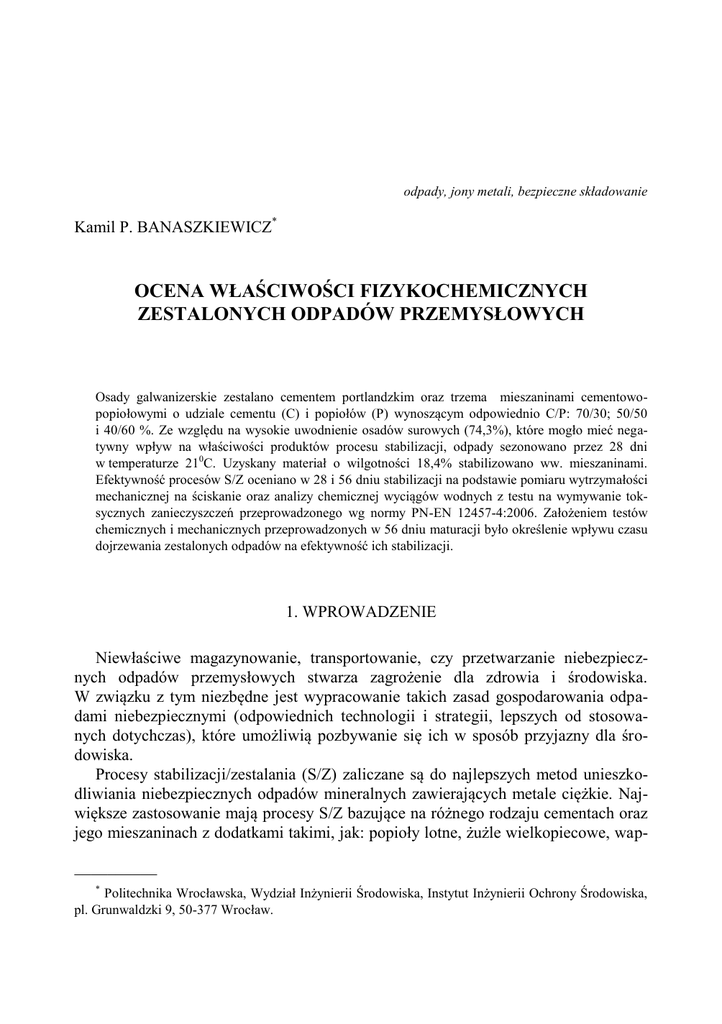odpady, jony metali, bezpieczne składowanie Kamil P. BANASZKIEWICZ* OCENA WŁAŚCIWOŚCI FIZYKOCHEMICZNYCH ZESTALONYCH ODPADÓW PRZEMYSŁOWYCH Osady galwanizerskie zestalano cementem portlandzkim oraz trzema mieszaninami cementowopopiołowymi o udziale cementu (C) i popiołów (P) wynoszącym odpowiednio C/P: 70/30; 50/50 i 40/60 %. Ze względu na wysokie uwodnienie osadów surowych (74,3%), które mogło mieć negatywny wpływ na właściwości produktów procesu stabilizacji, odpady sezonowano przez 28 dni w temperaturze 210C. Uzyskany materiał o wilgotności 18,4% stabilizowano ww. mieszaninami. Efektywność procesów S/Z oceniano w 28 i 56 dniu stabilizacji na podstawie pomiaru wytrzymałości mechanicznej na ściskanie oraz analizy chemicznej wyciągów wodnych z testu na wymywanie toksycznych zanieczyszczeń przeprowadzonego wg normy PN-EN 12457-4:2006. Założeniem testów chemicznych i mechanicznych przeprowadzonych w 56 dniu maturacji było określenie wpływu czasu dojrzewania zestalonych odpadów na efektywność ich stabilizacji. 1. WPROWADZENIE Niewłaściwe magazynowanie, transportowanie, czy przetwarzanie niebezpiecznych odpadów przemysłowych stwarza zagrożenie dla zdrowia i środowiska. W związku z tym niezbędne jest wypracowanie takich zasad gospodarowania odpadami niebezpiecznymi (odpowiednich technologii i strategii, lepszych od stosowanych dotychczas), które umożliwią pozbywanie się ich w sposób przyjazny dla środowiska. Procesy stabilizacji/zestalania (S/Z) zaliczane są do najlepszych metod unieszkodliwiania niebezpiecznych odpadów mineralnych zawierających metale ciężkie. Największe zastosowanie mają procesy S/Z bazujące na różnego rodzaju cementach oraz jego mieszaninach z dodatkami takimi, jak: popioły lotne, żużle wielkopiecowe, wap__________ * Politechnika Wrocławska, Wydział Inżynierii Środowiska, Instytut Inżynierii Ochrony Środowiska, pl. Grunwaldzki 9, 50-377 Wrocław. 52 K. BANASZKIEWICZ no. Rozwój technologii betonu oraz względy ekonomiczne przyczyniły się do zmniejszania udziału „czystego” cementu w procesie stabilizacji/zestalania i zastępowania go kruszywami wykazującymi właściwości pucolanowe i/lub hydrauliczne [1]. Procesy stabilizacji odpadów polegają na ich mechanicznym mieszaniu ze specjalnie opracowanym spoiwem hydraulicznym, które po zarobieniu wodą ulega zestaleniu. Uzyskany produkt charakteryzuje się większą odpornością na działanie agresywnych cieczy oraz wyższą wytrzymałością mechaniczną umożliwiającą bezpieczny transport i składowanie przetworzonych odpadów. Unieszkodliwianie odpadów przy użyciu cementów polega na: chemicznym wiązaniu zanieczyszczeń (głównie jonów metali) z produktami procesu hydratacji cementu, adsorpcji zanieczyszczeń na powierzchni ziaren uwodnionego spoiwa oraz kapsułacji zanieczyszczeń w matrycy mieszaniny stabilizującej [2]. Istotnym czynnikiem decydującym o efektywności ograniczenia swobodnej mobilności jonów metali jest wartość pH tzw. środowiska immobilizacji, stąd bardzo ważne jest ustalenie w mieszaninie wiążącej optymalnych udziałów składników wpływających na jego wartość [3]. Zgodnie z przepisami obowiązującymi w Unii Europejskiej, efektywność procesów stabilizacji/zestalania ocenia się w 28 dniu dojrzewania produktów w oparciu o wyniki: analizy stężeń jonów metali ciężkich w wyciągach wodnych z testu na wymywanie zanieczyszczeń przeprowadzonego zgodnie z procedurą opisaną w normie PN-EN 12457-4:2006 [4], pomiaru wytrzymałości mechanicznej na ściskanie. Zgodnie z polskim ustawodawstwem minimalna wytrzymałość na ściskanie jaką powinny cechować się odpady po procesie solidyfikacji, wynosi 50 kN/m2 (0,05 MPa) [5]. Osady galwanizerskie charakteryzujące się wysoką zawartością jonów Cr(III) i Zn(II) zestalano cementem portlandzkim oraz kilkoma jego mieszaninami z popiołami lotnymi ze spalania węgla kamiennego. Efektywność procesu unieszkodliwiania oceniono w oparciu o analizę właściwości fizykochemicznych otrzymanych kompozytów na bazie odpadów niebezpiecznych po 28 i 56 dniach stabilizacji. 2. MATERIAŁY I METODYKA 2.1. CHARAKTERYZTYKA UNIESZKODLIWIANYCH ODPADÓW Wykorzystane w badaniach odpady pochodziły z oczyszczalni ścieków z przemysłu galwanotechnicznego. W tabeli 1 przedstawiono skład chemiczny unieszkodliwianych osadów. Charakteryzowały się one uwodnieniem wynoszącym 74,3% oraz bardzo wysoką zawartością jonów metali. Ocenę toksyczności przetwarzanych osadów Ocena właściwości fizykochemicznych zestalonych odpadów przemysłowych 53 przeprowadzono na podstawie stężeń jonów Cr(III) i Zn(II) w wyciągach wodnych z testu przeprowadzonego zgodnie z procedurą PN-EN 12457 [4]. Stężenia analizowanych metali oznaczono przy użyciu spektrometru absorpcji atomowej ASA Spectra-400 firmy Varian. Tabela 1. Skład chemiczny unieszkodliwianych odpadów oraz stężenia jonów Cr(III) i Zn(II) w wyciągach wodnych z testu PN-EN Jony Cr (III) Zn (II) Osady galwanizerskie Wyciąg wodny mg/kgsm 78075 37939 mg/dm3 2 655 Stopień wymycia jonów metali z osadów surowych % 0,03 17 Wartość pH wyciągu wodnego Wartość dopuszczalna [6] - mg/dm3 2,5 15 5,46 W wyciągach wodnych z testu na wymywanie zanieczyszczeń obowiązującego w UE zostało przekroczone dopuszczalne stężenie cynku w odniesieniu do kryteriów ustanowionych dla przetworzonych odpadów niebezpiecznych dopuszczonych do składowania na składowisku odpadów innych niż niebezpieczne i obojętne [6]. Ciecz osadowa po 24 h wymywania zanieczyszczeń charakteryzowała się odczynem kwaśnym (pH = 5,46), mającym znaczący wpływ na rozpuszczalność i stopień migracji zawartych w odpadach jonów cynku. 2.2. METODYKA PROCESU ZESTALANIA W badaniach osady galwanizerskie zestalano czystym cementem portlandzkim (CEM I 32,5 R) oraz trzema mieszaninami cementowo-popiołowymi o udziale poszczególnych materiał