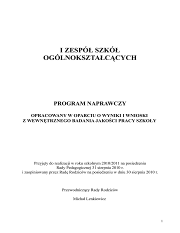 I ZESPÓŁ SZKÓŁ OGÓLNOKSZTAŁCĄCYCH PROGRAM NAPRAWCZY OPRACOWANY W OPARCIU O WYNIKI I WNIOSKI Z WEWNĘTRZNEGO BADANIA JAKOŚCI PRACY SZKOŁY Przyjęty do realizacji w roku szkolnym 2010/2011 na posiedzeniu Rady Pedagogicznej 31 sierpnia 2010 r. i zaopiniowany przez Radę Rodziców na posiedzeniu w dniu 30 sierpnia 2010 r. Przewodniczący Rady Rodziców Michał Lenkiewicz 1 Zgodnie z planem pracy zespół do badania wybranych obszarów pracy szkoły przeprowadził w roku szkolnym 2009/2010 testy diagnostyczne w klasach pierwszych i drugich z wybranych przedmiotów oraz próbne egzaminy maturalne. • • 1.W I semestrze roku szkolnego 2009/2010 zostały przygotowane i przeprowadzone testy diagnostyczne, badające stan wiedzy uczniów klas pierwszych z : języka polskiego we wszystkich klasach pierwszych – 18.09. 2009, języka obcego (kontynuacja nauki w liceum) we wszystkich klasach pierwszych – 11.09.2009, • matematyki we wszystkich klasach pierwszych – 08.09.2009, • historii w klasie I b – 23.09.2009, • chemii w klasie I c – 17.09.2009, • biologii w klasie I c – 12.09.2009, • fizyki w klasie I a – 04.09.2009. 2.W II semestrze roku szkolnego 2009/2010 zostały przygotowane i przeprowadzone testy diagnostyczne, badające stan i przyrost wiedzy uczniów klas drugich z : • języka polskiego we wszystkich klasach drugich – 01.03.2010, • języka obcego (kontynuacja nauki w liceum) we wszystkich klasach drugich – 09.03.2010, • matematyki we wszytkich klasach – 24.03.2010, • historii w klasach II b – 11.06.2010, • chemii w klasach II c – 17.03.2010, • biologii w klasach II c – 26.03.2010, • fizyki w klasie II a – 04.03.2010. Odpowiedzialność za przygotowanie, przeprowadzenie oraz opracowanie wyników testów diagnostycznych spoczywała na zespołach przedmiotowych. Analizy wyników w zakresie kształcenia wraz z wnioskami zostały zawarte w oddzielnych raportach sporządzonych przez przewodniczących poszczególnych zespołów przedmiotowych. 3.W listopadzie 2009 roku zostały przeprowadzone próbne egzaminy maturalne z języka polskiego, języka obcego – języka angielskiego, języka niemieckiego, języka rosyjskiego oraz z wybranego przedmiotu. Na podstawie wyników próbnych egzaminów maturalnych należy w klasach trzecich wyrabiać nawyki wykonywania zadań zamkniętych i otwartych pod kątem pisemnego egzaminu maturalnego z danego przedmiotu oraz zwrócić szczególną uwagę na umiejętność czytania ze zrozumieniem poleceń zawartych w arkuszach egzaminacyjnych. Zgodnie z planem pracy zespół do badania wybranych obszarów pracy szkoły badał stan bezpieczeństwa w szkole. Badania te byłe przeprowadzane przez trzy lata i w roku 2009/2010 zostało dokonane podsumowanie trzyletnich wyników. 2 WNIOSKI DO PRACY W ROKU SZKOLNYM 2010/2011 OPRACOWANE W OPARCIU O WYNIKI TESTÓW DIAGNOSTYCZNYCH PRZEPROWADZONYCH W KLASACH PIERWSZYCH W I SEMESTRZE ROKU SZKOLNEGO 2009/2010 JĘZYK POLSKI Celem diagnozy z języka polskiego, która odbyła się 18 września 2009 roku, było; • Badanie umiejętności czytania ze zrozumieniem, • Badanie umiejętności argumentowania i wyciągania wniosków na podstawie przeczytanego tekstu, • Badanie umiejętności tworzenia krótkich wypowiedzi pisemnych, • Badanie wiadomości z zakresu teorii literatury oraz gramatyki języka polskiego, Uczniowie najmniej problemów mieli z zadaniami zamkniętymi natomiast trudności stwarzały zadania, w których należało; • wskazac środki poetyckie i określic ich funkcje, • precyzyjnie formułowac wnioski i odpowiadac na pytania, • stosowac równoważniki zdań, słownictwo perswazyjne w krótkich formach wypowiedzi, Na lekcjach języka polskiego należy w szczególności: • doskonalić umiejętność czytania ze zrozumieniem, • poświęcić więcej uwagi na wykorzystywanie i zastosowanie zdobytych wiadomości – formułowanie wniosków, stawianie tez, • systematyzować wiedzę, powtarzać najważniejsze pojęcia, środki stylistyczne, • zwiększyć ćwiczenia dotyczące składni zdań pojedynczych i wielokrotnie złożonych, • ćwiczyć umiejętność formułowania dłuższych form wypowiedzi. JĘZYKI OBCE Diagnoza z języków obcych odbyła się 11.09.2009 r. Testy zostały opracowane przez nauczycieli: M.Karolonek i D.Rzepkę – język niemiecki, J.Wojciechowską – język angielski. Uczniowie mieli do rozwiązania test, który sprawdzał kilka sprawności językowych: rozumienie tekstu ze słuchu, rozumienie tekstu czytanego, znajomość gramatyki oraz napisanie dłuższej formy wypowiedzi – listu. Język niemiecki Najłatwiejsze zadanie – rozumienie tekstu czytanego. Największą trudność sprawia uczniom rozumienie tekstu słuchanego oraz gramatyka a także tworzenie wypowiedzi pisemnych. Nauczyciele uczący w klasach I-wszych założyli we wnioskach ćwiczenie sprawności językowych sprawiających uczniom najwięcej problemów. Szczegółowe wyniki: Ia – średnia klasy 49%, najlepszy wynik – 64%, najsłabszy – 34% Ib – 50%, 85%, 30% Ic – 46%, 57%, 33% Id – 38%, 55%, 24% Ie – 38%, 54%, 21% If – 45,6%, 62%, 21% 3 Język angielski Zadanie polegające na rozumieniu tekstu czytanego było ćwiczeniem najłatwiejszym. Bardzo słabo wypadły zadania sprawdzające znajomość gramatyki, przeciętnie – na poziomie 30% - rozumienie tekstu słuchanego. Uczniowie nie znają formy listu – podstawowej formy wypowiedzi pisemnej, posługują się ubogim słownictwem. Nauczyciele języka angielskiego zwracają uwagę na zwiększenie ćwiczeń sprawności sprawiających uczniom największe problemy. Szczegółowe wyniki: Ia – średnia klasy 86,33%, najlepszy wynik – 94%, najsłabszy – 34% Ib – 33%, 67%, 12% Ic – 36%, 66%, 12% Id – 21,5%, 72%, 18% Ie – 23%, 36%, 14% If – 54,21%, 85%, 22% HISTORIA Diagnoza wiedzy i umiejętności z historii w klasie Ib odbyła się 28 września 2009 roku. Wzięło w niej udzi