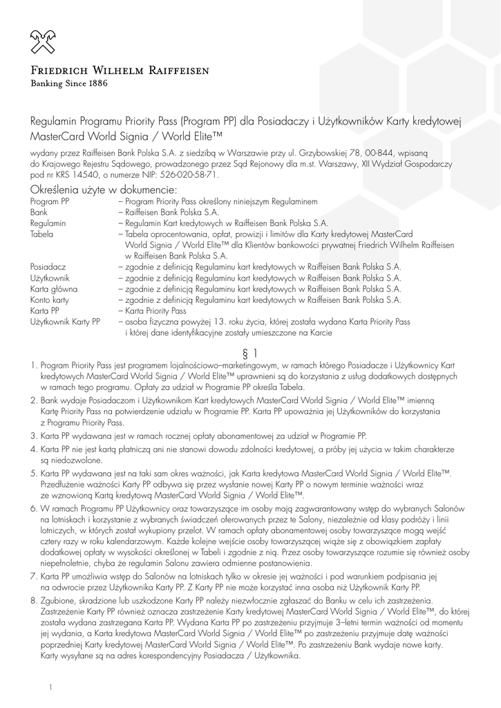 Regulamin Programu Priority Pass (Program PP) dla Posiadaczy i Użytkowników Karty kredytowej MasterCard World Signia / World Elite™ wydany przez Raiffeisen Bank Polska S.A. z siedzibą w Warszawie przy ul. Grzybowskiej 78, 00-844, wpisaną do Krajowego Rejestru Sądowego, prowadzonego przez Sąd Rejonowy dla m.st. Warszawy, XII Wydział Gospodarczy pod nr KRS 14540, o numerze NIP: 526-020-58-71. Określenia użyte w dokumencie: Program PP Bank Regulamin Tabela Posiadacz Użytkownik Karta główna Konto karty Karta PP Użytkownik Karty PP – Program Priority Pass określony niniejszym Regulaminem – Raiffeisen Bank Polska S.A. – Regulamin Kart kredytowych w Raiffeisen Bank Polska S.A. – Tabela oprocentowania, opłat, prowizji i limitów dla Karty kredytowej MasterCard World Signia / World Elite™ dla Klientów bankowości prywatnej Friedrich Wilhelm Raiffeisen w Raiffeisen Bank Polska S.A. – zgodnie z definicją Regulaminu kart kredytowych w Raiffeisen Bank Polska S.A. – zgodnie z definicją Regulaminu kart kredytowych w Raiffeisen Bank Polska S.A. – zgodnie z definicją Regulaminu kart kredytowych w Raiffeisen Bank Polska S.A. – zgodnie z definicją Regulaminu kart kredytowych w Raiffeisen Bank Polska S.A. – Karta Priority Pass – osoba fizyczna powyżej 13. roku życia, której została wydana Karta Priority Pass i której dane identyfikacyjne zostały umieszczone na Karcie §1 1. P rogram Priority Pass jest programem lojalnościowo–marketingowym, w ramach którego Posiadacze i Użytkownicy Kart kredytowych MasterCard World Signia / World Elite™ uprawnieni są do korzystania z usług dodatkowych dostępnych w ramach tego programu. Opłaty za udział w Programie PP określa Tabela. 2. B ank wydaje Posiadaczom i Użytkownikom Kart kredytowych MasterCard World Signia / World Elite™ imienną Kartę Priority Pass na potwierdzenie udziału w Programie PP. Karta PP upoważnia jej Użytkowników do korzystania z Programu Priority Pass. 3. Karta PP wydawana jest w ramach rocznej opłaty abonamentowej za udział w Programie PP. 4. K arta PP nie jest kartą płatniczą ani nie stanowi dowodu zdolności kredytowej, a próby jej użycia w takim charakterze są niedozwolone. 5. K arta PP wydawana jest na taki sam okres ważności, jak Karta kredytowa MasterCard World Signia / World Elite™. Przedłużenie ważności Karty PP odbywa się przez wysłanie nowej Karty PP o nowym terminie ważności wraz ze wznowioną Kartą kredytową MasterCard World Signia / World Elite™. 6. W ramach Programu PP Użytkownicy oraz towarzyszące im osoby mają zagwarantowany wstęp do wybranych Salonów na lotniskach i korzystanie z wybranych świadczeń oferowanych przez te Salony, niezależnie od klasy podróży i linii lotniczych, w których został wykupiony przelot. W ramach opłaty abonamentowej osoby towarzyszące mogą wejść cztery razy w roku kalendarzowym. Każde kolejne wejście osoby towarzyszącej wiąże się z obowiązkiem zapłaty dodatkowej opłaty w wysokości określonej w Tabeli i zgodnie z nią. Przez osoby towarzyszące rozumie się również osoby niepełnoletnie, chyba że regulamin Salonu zawiera odmienne postanowienia. 7. K arta PP umożliwia wstęp do Salonów na lotniskach tylko w okresie jej ważności i pod warunkiem podpisania jej na odwrocie przez Użytkownika Karty PP. Z Karty PP nie może korzystać inna osoba niż Użytkownik Karty PP. 8. Zgubione, skradzione lub uszkodzone Karty PP należy niezwłocznie zgłaszać do Banku w celu ich zastrzeżenia. Zastrzeżenie Karty PP również oznacza zastrzeżenie Karty kredytowej MasterCard World Signia / World Elite™, do której została wydana zastrzegana Karta PP. Wydana Karta PP po zastrzeżeniu przyjmuje 3–letni termin ważności od momentu jej wydania, a Karta kredytowa MasterCard World Signia / World Elite™ po zastrzeżeniu przyjmuje datę ważności poprzedniej Karty kredytowej MasterCard World Signia / World Elite™. Po zastrzeżeniu Bank wydaje nowe karty. Karty wysyłane są na adres korespondencyjny Posiadacza / Użytkownika. 1 9. Wszelkie koszty wynikające z użycia zagubionej lub skradzionej Karty PP obciążają do dnia zgłoszenia jej zagubienia lub kradzieży Użytkownika Karty PP. Użytkownik Karty PP nie będzie obciążany kosztami wynikającymi z użycia zagubionej lub skradzionej Karty PP po dniu zgłoszenia zagubienia lub kradzieży. 10. R ozwiązanie umowy o Kartę kredytową MasterCard World Signia / World Elite™ oznacza zakończenie udziału w Programie PP i zastrzeżenie Karty PP. Użytkownik Karty PP ponosi odpowiedzialność za posługiwanie się nieważną Kartą PP, w tym kosztami wynikającymi z jej użycia. Koszty obciążą Konto karty. 11. K arta PP traci ważność w przypadku niespłacenia przez Posiadacza Minimalnych Kwot do Zapłaty przez co najmniej 60 dni. Termin „Minimalna Kwota do Zapłaty” jest rozumiany zgodnie z definicją zamieszczoną w Regulaminie Kart Kredytowych Raiffeisen Bank Polska S.A. 12. Lista dostępnych Salonów, świadczeń i usług oraz zasady Programu Priority Pass opisane są na stronie internetowej operatora Programu Priority Pass: www.prioritypass.com. §2 1. Opłatą za udział w Programie PP Bank obciąża Konto karty według stawek i warunków opisanych w niniejszych Warunkach oraz zgodnie z opłatami w Tabeli. 2. Obciążenie Konta karty dokonywane jest w oparciu o raporty otrzymywane przez Bank od Priority Pass Limited. §3 1. K orzystanie z Programu PP, w tym wstęp do Salonów na lotniskach, jest uwarunkowane okazaniem ważnej Karty PP. Karta kredytowa MasterCard World Signia / World Elite™ nie jest akceptowana jako zamiennik Kart PP. 2. Wstęp do Salonów jest bezwzględnie uwarunkowany posiadaniem przez Użytkownika Karty PP i osób towarzyszących ważnych biletów lotniczych na ten sam dzień. Poza terytorium USA oprócz biletów lotniczych konieczne jest posiadanie ważnych kart pokładowych na odlot, tj. wstęp mają tylk