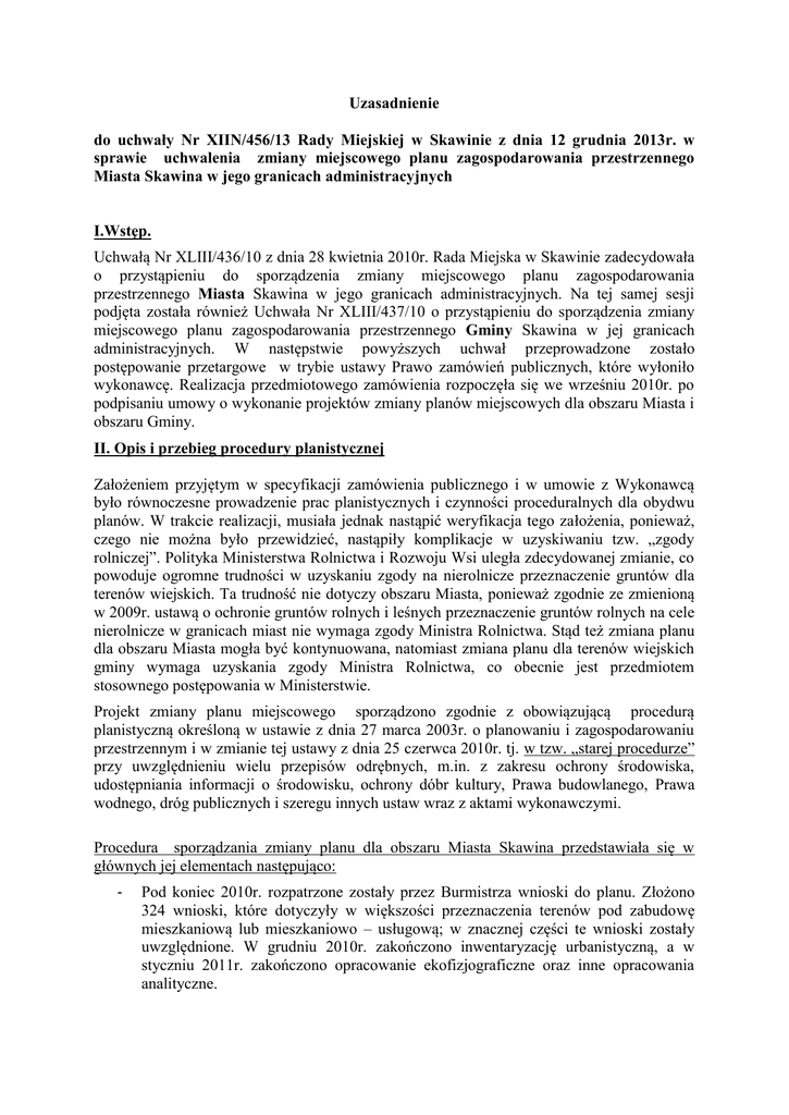 Uzasadnienie do uchwały Nr XIIN/456/13 Rady Miejskiej w Skawinie z dnia 12 grudnia 2013r. w sprawie uchwalenia zmiany miejscowego planu zagospodarowania przestrzennego Miasta Skawina w jego granicach administracyjnych I.Wstęp. Uchwałą Nr XLIII/436/10 z dnia 28 kwietnia 2010r. Rada Miejska w Skawinie zadecydowała o przystąpieniu do sporządzenia zmiany miejscowego planu zagospodarowania przestrzennego Miasta Skawina w jego granicach administracyjnych. Na tej samej sesji podjęta została również Uchwała Nr XLIII/437/10 o przystąpieniu do sporządzenia zmiany miejscowego planu zagospodarowania przestrzennego Gminy Skawina w jej granicach administracyjnych. W następstwie powyższych uchwał przeprowadzone zostało postępowanie przetargowe w trybie ustawy Prawo zamówień publicznych, które wyłoniło wykonawcę. Realizacja przedmiotowego zamówienia rozpoczęła się we wrześniu 2010r. po podpisaniu umowy o wykonanie projektów zmiany planów miejscowych dla obszaru Miasta i obszaru Gminy. II. Opis i przebieg procedury planistycznej Założeniem przyjętym w specyfikacji zamówienia publicznego i w umowie z Wykonawcą było równoczesne prowadzenie prac planistycznych i czynności proceduralnych dla obydwu planów. W trakcie realizacji, musiała jednak nastąpić weryfikacja tego założenia, ponieważ, czego nie można było przewidzieć, nastąpiły komplikacje w uzyskiwaniu tzw. „zgody rolniczej”. Polityka Ministerstwa Rolnictwa i Rozwoju Wsi uległa zdecydowanej zmianie, co powoduje ogromne trudności w uzyskaniu zgody na nierolnicze przeznaczenie gruntów dla terenów wiejskich. Ta trudność nie dotyczy obszaru Miasta, ponieważ zgodnie ze zmienioną w 2009r. ustawą o ochronie gruntów rolnych i leśnych przeznaczenie gruntów rolnych na cele nierolnicze w granicach miast nie wymaga zgody Ministra Rolnictwa. Stąd też zmiana planu dla obszaru Miasta mogła być kontynuowana, natomiast zmiana planu dla terenów wiejskich gminy wymaga uzyskania zgody Ministra Rolnictwa, co obecnie jest przedmiotem stosownego postępowania w Ministerstwie. Projekt zmiany planu miejscowego sporządzono zgodnie z obowiązującą procedurą planistyczną określoną w ustawie z dnia 27 marca 2003r. o planowaniu i zagospodarowaniu przestrzennym i w zmianie tej ustawy z dnia 25 czerwca 2010r. tj. w tzw. „starej procedurze” przy uwzględnieniu wielu przepisów odrębnych, m.in. z zakresu ochrony środowiska, udostępniania informacji o środowisku, ochrony dóbr kultury, Prawa budowlanego, Prawa wodnego, dróg publicznych i szeregu innych ustaw wraz z aktami wykonawczymi. Procedura sporządzania zmiany planu dla obszaru Miasta Skawina przedstawiała się w głównych jej elementach następująco: - Pod koniec 2010r. rozpatrzone zostały przez Burmistrza wnioski do planu. Złożono 324 wnioski, które dotyczyły w większości przeznaczenia terenów pod zabudowę mieszkaniową lub mieszkaniowo – usługową; w znacznej części te wnioski zostały uwzględnione. W grudniu 2010r. zakończono inwentaryzację urbanistyczną, a w styczniu 2011r. zakończono opracowanie ekofizjograficzne oraz inne opracowania analityczne. - W roku 2011 Gmina zleciła wykonanie specjalistycznych opracowań z zakresu osuwisk i zagrożeń powodziowych, nie tylko z uwagi na skutki klęsk żywiołowych z maja 2010r. ale ze względu na wymogi przepisów z dziedziny planowania przestrzennego i ustaw odrębnych. - Opracowany projekt zmiany planu dla obszaru Miasta został zaopiniowany i uzgodniony z właściwymi organami administracji publicznej, uzyskał wymagane zgody na nieleśne przeznaczenie gruntów leśnych a następnie został po raz pierwszy wyłożony do publicznego wglądu w okresie od 22 kwietnia do 23 maja 2013r. Do wyłożonego projektu złożono 193, z czego115 uwag zostało uwzględnionych bądź uwzględnionych w części, zaś 78 zostało nieuwzględnionych. Na skutek uwzględnienia znacznej ilości uwag skutkujących zmianami w projekcie – procedura planistyczna, zgodnie z wymogami ustawy o planowaniu i zagospodarowaniu przestrzennym musiała zostać ponowiona. W ramach ponowionych czynności projekt zmiany planu został ponownie zaopiniowany i uzgodniony przez właściwe organy a następnie ponownie został wyłożony do publicznego wglądu w tej części, w której uległ zmianie po rozpatrzeniu uwag z I wyłożenia. Ponowne – II wyłożenie miało miejsce w okresie od 26 września do 24 października 2013r. Do dnia 7 listopada 2013r. złożono 25 uwagi i pisma, z czego tylko 11 dotyczyło zakresu ponownego częściowego wyłożenia zmiany projektu planu; wszystkie uwagi zostały nieuwzględnione. Następnie projekt planu bez zmian w stosunku do wersji z II wyłożenia został wniesiony do Rady Miejskiej w Skawinie z wnioskiem o jego uchwalenie. W ramach czynności planistycznych wykonano również wymaganą przepisami „strategiczna ocenę oddziaływania na środowisko”. - - III. Rozwiązania projektu zmiany planu miejscowego Miasta Skawina. Zgodność ze Studium Granice obszaru objętego planem miejscowym zostały określone w załączniku graficznym do uchwały Nr XLIII/436/10 z dnia 28 kwietnia 2010r. Rady Miejskiej w Skawinie. Przedmiotem planu jest zgodny z wymogami ustawy o planowaniu i zagospodarowaniu przestrzennym i z przepisami odrębnymi. Wykonanie projektu zmian planów miejscowych miasta (jak i gminy) Skawina poprzedzały wykonane analizy istniejących uwarunkowań, w zakresie: 1) stanu i charakteru istniejącego zainwestowania w zakresie terenów przeznaczonych pod zabudowę mieszkaniową i usługową, 2) systemu przyrodniczego czyli ochrony: terenów leśnych, rolnych i innych obszarów cennych krajobrazowo i przyrodniczo, w tym obszarów Natura 2000, 3) zagrożeń bezpieczeństwa ludności i jej mienia tj.: obszarów narażonych na niebezpieczeństwo powodzi i naturalnych zagrożeń geologicznych, 4) występujących na obszarze miasta i gminy ujęć wód podziemnych i pow