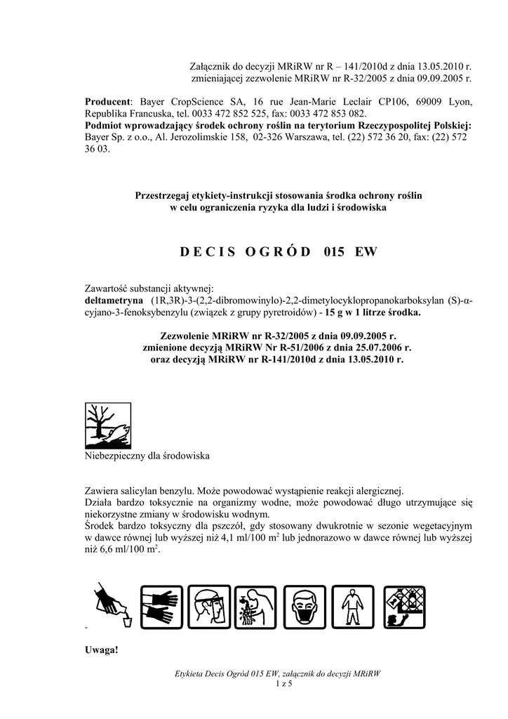 Załącznik do decyzji MRiRW nr R – 141/2010d z dnia 13.05.2010 r. zmieniającej zezwolenie MRiRW nr R-32/2005 z dnia 09.09.2005 r. Producent: Bayer CropScience SA, 16 rue Jean-Marie Leclair CP106, 69009 Lyon, Republika Francuska, tel. 0033 472 852 525, fax: 0033 472 853 082. Podmiot wprowadzający środek ochrony roślin na terytorium Rzeczypospolitej Polskiej: Bayer Sp. z o.o., Al. Jerozolimskie 158, 02-326 Warszawa, tel. (22) 572 36 20, fax: (22) 572 36 03. Przestrzegaj etykiety-instrukcji stosowania środka ochrony roślin w celu ograniczenia ryzyka dla ludzi i środowiska D E C I S O G R Ó D 015 EW Zawartość substancji aktywnej: deltametryna (1R,3R)-3-(2,2-dibromowinylo)-2,2-dimetylocyklopropanokarboksylan (S)-αcyjano-3-fenoksybenzylu (związek z grupy pyretroidów) - 15 g w 1 litrze środka. Zezwolenie MRiRW nr R-32/2005 z dnia 09.09.2005 r. zmienione decyzją MRiRW Nr R-51/2006 z dnia 25.07.2006 r. oraz decyzją MRiRW nr R-141/2010d z dnia 13.05.2010 r. Niebezpieczny dla środowiska Zawiera salicylan benzylu. Może powodować wystąpienie reakcji alergicznej. Działa bardzo toksycznie na organizmy wodne, może powodować długo utrzymujące się niekorzystne zmiany w środowisku wodnym. Środek bardzo toksyczny dla pszczół, gdy stosowany dwukrotnie w sezonie wegetacyjnym w dawce równej lub wyższej niż 4,1 ml/100 m2 lub jednorazowo w dawce równej lub wyższej niż 6,6 ml/100 m2. - Uwaga! Etykieta Decis Ogród 015 EW, załącznik do decyzji MRiRW 1z5 1. Zabrania się stosowania środka w strefie bezpośredniej ochrony ujęć wody. 2. Nie zanieczyszczać wód środkiem ochrony roślin lub jego opakowaniem. Nie myć aparatury w pobliżu wód powierzchniowych. Unikać zanieczyszczania wód poprzez rowy odwadniające z gospodarstw i dróg. 3. W celu ochrony organizmów wodnych konieczne jest wyznaczenie strefy ochronnej o szerokości - 10 m od zbiorników i cieków wodnych w przypadku uprawy ziemniaka; - 20 m od zbiorników i cieków wodnych w przypadku uprawy róży lub astra chińskiego; - 50 m od zbiorników i cieków wodnych w przypadku uprawy jabłoni. 3. W celu ochrony stawonogów niebędących celem działania środka konieczne jest wyznaczenie strefy ochronnej o szerokości: - 5 m od terenów nieużytkowanych rolniczo w przypadku uprawy róży; - 10 m od terenów nieużytkowanych rolniczo w przypadku uprawy astra chińskiego; - 30 m od terenów nieużytkowanych rolniczo w przypadku uprawy jabłoni. I OPIS DZIAŁANIA Środek owadobójczy w formie emulsji – olej w wodzie do sporządzania emulsji wodnej, o działaniu kontaktowym i żołądkowym, przeznaczony do zwalczania stonki ziemniaczanej w ziemniaku, kwieciaka jabłkowca na jabłoni, kwieciaka malinowca w truskawce oraz szkodników ssących na roślinach ozdobnych uprawianych w warunkach polowych i pod osłonami. Na roślinie działa powierzchniowo. II ZAKRES STOSOWANIA 1. ROŚLINY ROLNICZE A) ZIEMNIAK larwy i chrząszcze stonki ziemniaczanej Zalecana dawka: 4-5 ml / 100 m2. Termin stosowania: Opryskiwać po wystąpieniu szkodnika. Wyższą z zalecanych dawek stosować do zwalczania chrząszczy oraz w przypadku bujnej naci ziemniaczanej. Środek stosować 1 raz w sezonie. Zalecana ilość wody: 1,5 – 4 l / 100 m2 (opryskiwanie: średniokropliste). Zalecane opryskiwanie: średniokropliste. 2. ROŚLINY SADOWNICZE A) JABŁOŃ kwieciak jabłkowiec Zalecana dawka: 7,5 ml / 100 m2 Zalecana ilość wody: 7 l/ 100 m2 . Termin stosowania: Opryskiwać tuż przed pękaniem lub w czasie pękania pąków kwiatowych jabłoni. Zabieg wykonywać w dni słoneczne przy temperaturze co najmniej 120 C. Środek stosować maksymalnie 2 razy w sezonie, nie częściej niż co 14 dni. Zalecane opryskiwanie: średniokropliste. 3. ROŚLINY OZDOBNE (POD OSŁONAMI) A) KOCIMIĘTKA FAASSENA Etykieta Decis Ogród 015 EW, załącznik do decyzji MRiRW 2z5 skoczek melisowy Zalecane stężenie: 0,075% (7,5 ml środka w 10 l wody). Termin stosowania: Opryskiwać po wystąpieniu szkodnika. Środek stosować maksymalnie 2 razy w sezonie, nie częściej niż co 7 dni. Zalecana ilość cieczy użytkowej: 7 l/ 100 m2 . Zalecane opryskiwanie: średniokropliste. 4. ROŚLINY OZDOBNE (W GRUNCIE) A) ASTER CHIŃSKI porazik kocankowy Zalecane stężenie: 0,075% (7,5 ml środka w 10 l wody). Termin stosowania: Opryskiwać po wystąpieniu szkodnika. Środek stosować maksymalnie 2 razy w sezonie, nie częściej niż co 7 dni. Zalecana ilość cieczy użytkowej: 10 l/ 100 m2 . Zalecane opryskiwanie: średniokropliste. B) RÓŻA mszyce, skoczek różany Zalecane stężenie: 0,075% (7,5 ml środka w 10 l wody). Termin stosowania: Opryskiwać po wystąpieniu szkodnika. Środek stosować maksymalnie 2 razy w sezonie, nie częściej niż co 7 dni. Zalecana ilość cieczy użytkowej: 7 l/ 100 m2 Zalecane opryskiwanie: średniokropliste. UWAGI: Środek Decis Ogród 015 EW nie powinien być stosowany więcej niż dwa razy w okresie wegetacji rośliny chronionej, a w przypadku ochrony ziemniaka środek powinno się stosować jeden raz w sezonie. 2. Środek działa najskuteczniej w temperaturze poniżej 20oC. W temperaturze wyższej zabiegi wykonywać pod koniec dnia. 3. W przypadku zwalczania szkodników (zwłaszcza ssących) zabieg wykonać dokładnie, aby wszystkie części roślin były pokryte cieczą użytkową. 4. Przed zastosowaniem środka na rośliny ozdobne na każdej uprawianej po raz pierwszy odmianie wykonać próbny zabieg w celu sprawdzenia, czy w ciągu 7 dni nie wystąpiły objawy uszkodzenia roślin. 5. W przypadkach, gdy środek Decis Ogród 015 EW stosowany jest dwukrotnie w sezonie wegetacyjnym w dawce równej lub wyższej niż 4,1 ml/100 m2 lub jednorazowo w dawce równej lub wyższej niż 6,6 ml/100 m2 w celu ochrony pszczół i innych owadów zapylających nie stosować: na rośliny uprawne w czasie kwitnienia, kiedy na uprawie chronionej występują kwitnące chwasty, w miejscach, gdzie pszczoły mają pożytek (spadź), a także na roślinach, k