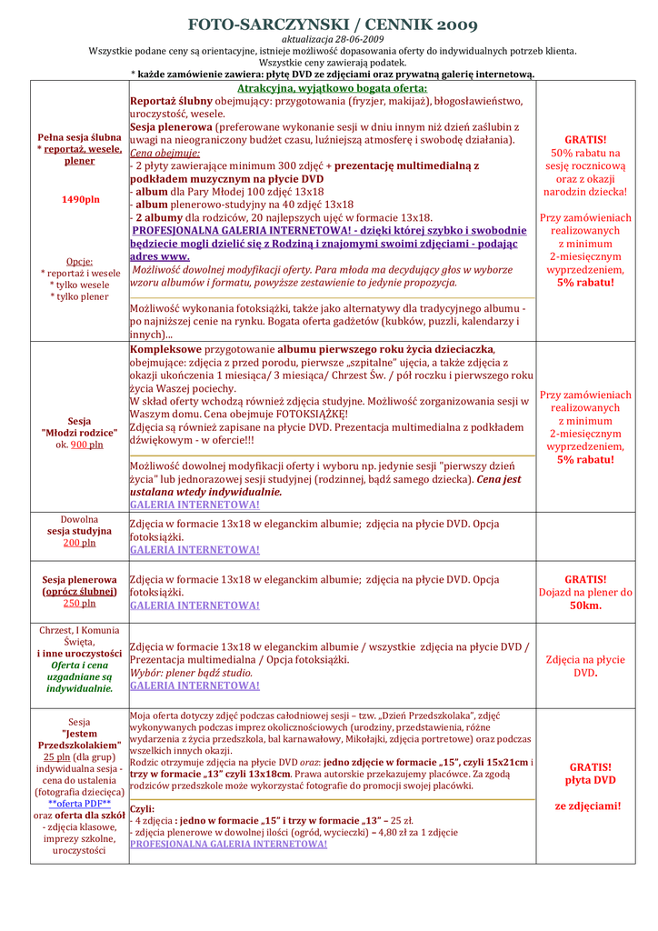 FOTO-SARCZYNSKI / CENNIK 2009 aktualizacja 28-06-2009 Wszystkie podane ceny są orientacyjne, istnieje możliwość dopasowania oferty do indywidualnych potrzeb klienta. Wszystkie ceny zawierają podatek. * każde zamówienie zawiera: płytę DVD ze zdjęciami oraz prywatną galerię internetową. Atrakcyjna, wyjątkowo bogata oferta: Reportaż ślubny obejmujący: przygotowania (fryzjer, makijaż), błogosławieństwo, uroczystość, wesele. Sesja plenerowa (preferowane wykonanie sesji w dniu innym niż dzień zaślubin z Pełna sesja ślubna uwagi na nieograniczony budżet czasu, luźniejszą atmosferę i swobodę działania). * reportaż, wesele, Cena obejmuje: plener - 2 płyty zawierające minimum 300 zdjęć + prezentację multimedialną z podkładem muzycznym na płycie DVD - album dla Pary Młodej 100 zdjęć 13x18 1490pln - album plenerowo-studyjny na 40 zdjęć 13x18 - 2 albumy dla rodziców, 20 najlepszych ujęć w formacie 13x18. PROFESJONALNA GALERIA INTERNETOWA! - dzięki której szybko i swobodnie będziecie mogli dzielić się z Rodziną i znajomymi swoimi zdjęciami - podając adres www. Opcje: * reportaż i wesele Możliwość dowolnej modyfikacji oferty. Para młoda ma decydujący głos w wyborze wzoru albumów i formatu, powyższe zestawienie to jedynie propozycja. * tylko wesele GRATIS! 50% rabatu na sesję rocznicową oraz z okazji narodzin dziecka! Przy zamówieniach realizowanych z minimum 2-miesięcznym wyprzedzeniem, 5% rabatu! * tylko plener Sesja "Młodzi rodzice" ok. 900 pln Możliwość wykonania fotoksiążki, także jako alternatywy dla tradycyjnego albumu po najniższej cenie na rynku. Bogata oferta gadżetów (kubków, puzzli, kalendarzy i innych)... Kompleksowe przygotowanie albumu pierwszego roku życia dzieciaczka, obejmujące: zdjęcia z przed porodu, pierwsze „szpitalne” ujęcia, a także zdjęcia z okazji ukończenia 1 miesiąca/ 3 miesiąca/ Chrzest Św. / pół roczku i pierwszego roku życia Waszej pociechy. Przy zamówieniach W skład oferty wchodzą również zdjęcia studyjne. Możliwość zorganizowania sesji w realizowanych Waszym domu. Cena obejmuje FOTOKSIĄŻKĘ! z minimum Zdjęcia są również zapisane na płycie DVD. Prezentacja multimedialna z podkładem 2-miesięcznym dźwiękowym - w ofercie!!! wyprzedzeniem, 5% rabatu! Możliwość dowolnej modyfikacji oferty i wyboru np. jedynie sesji "pierwszy dzień życia" lub jednorazowej sesji studyjnej (rodzinnej, bądź samego dziecka). Cena jest ustalana wtedy indywidualnie. GALERIA INTERNETOWA! Dowolna sesja studyjna 200 pln Zdjęcia w formacie 13x18 w eleganckim albumie; zdjęcia na płycie DVD. Opcja fotoksiążki. GALERIA INTERNETOWA! Sesja plenerowa (oprócz ślubnej) 250 pln Zdjęcia w formacie 13x18 w eleganckim albumie; zdjęcia na płycie DVD. Opcja fotoksiążki. GALERIA INTERNETOWA! Chrzest, I Komunia Święta, i inne uroczystości Oferta i cena uzgadniane są indywidualnie. Sesja "Jestem Przedszkolakiem" 25 pln (dla grup) indywidualna sesja cena do ustalenia (fotografia dziecięca) **oferta PDF** oraz oferta dla szkół - zdjęcia klasowe, imprezy szkolne, uroczystości Zdjęcia w formacie 13x18 w eleganckim albumie / wszystkie zdjęcia na płycie DVD / Prezentacja multimedialna / Opcja fotoksiążki. Wybór: plener bądź studio. GALERIA INTERNETOWA! Moja oferta dotyczy zdjęć podczas całodniowej sesji – tzw. „Dzień Przedszkolaka”, zdjęć wykonywanych podczas imprez okolicznościowych (urodziny, przedstawienia, różne wydarzenia z życia przedszkola, bal karnawałowy, Mikołajki, zdjęcia portretowe) oraz podczas wszelkich innych okazji. Rodzic otrzymuje zdjęcia na płycie DVD oraz: jedno zdjęcie w formacie „15”, czyli 15x21cm i trzy w formacie „13” czyli 13x18cm. Prawa autorskie przekazujemy placówce. Za zgodą rodziców przedszkole może wykorzystać fotografie do promocji swojej placówki. Czyli: - 4 zdjęcia : jedno w formacie „15” i trzy w formacie „13” – 25 zł. - zdjęcia plenerowe w dowolnej ilości (ogród, wycieczki) – 4,80 zł za 1 zdjęcie PROFESJONALNA GALERIA INTERNETOWA! GRATIS! Dojazd na plener do 50km. Zdjęcia na płycie DVD. GRATIS! płyta DVD ze zdjęciami!