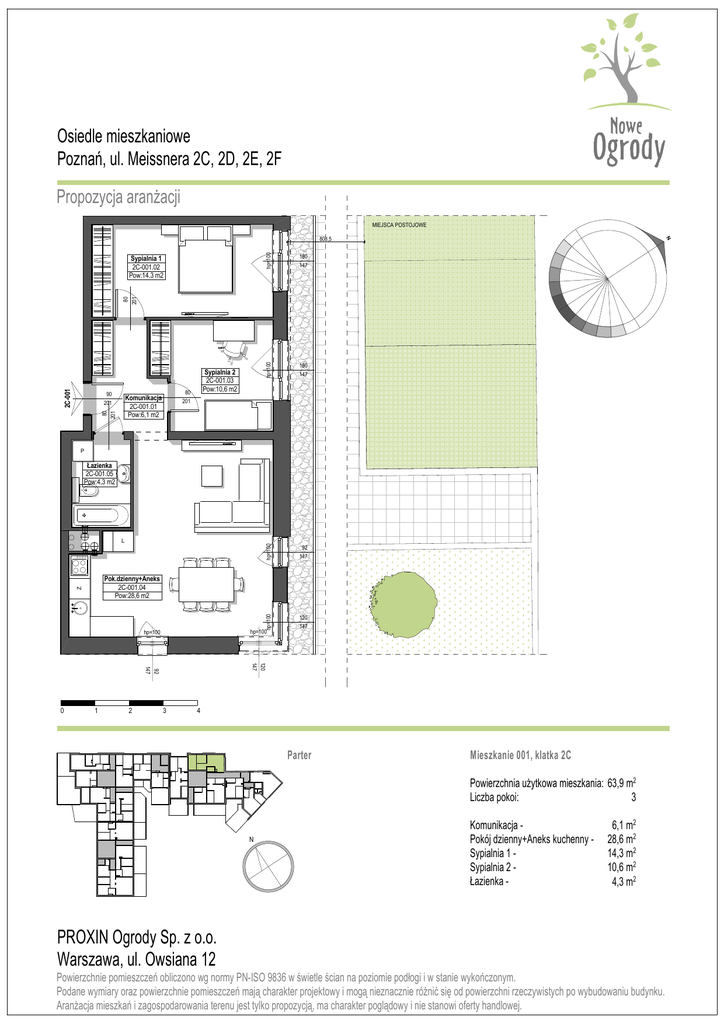 Osiedle mieszkaniowe Poznań, ul. Meissnera 2C, 2D, 2E, 2F Propozycja aranżacji MIEJSCA POSTOJOWE hp=100 180 147 hp=100 180 147 hp=100 92 147 hp=100 120 147 2C-001 80 201 Sypialnia 1 2C-001.02 Pow:14,3 m2 N 808,5 90 201 80 201 Komunikacja 2C-001.01 Pow:6,1 m2 80 201 Sypialnia 2 2C-001.03 Pow:10,6 m2 P Łazienka 2C-001.05 Pow:4,3 m2 L Z Pok.dzienny+Aneks 2C-001.04 Pow:28,6 m2 hp=100 hp=100 120 147 92 147 0 1 2 3 4 Parter Mieszkanie 001, klatka 2C Powierzchnia użytkowa mieszkania: 63,9 m2 Liczba pokoi: 3 N Komunikacja Pokój dzienny+Aneks kuchenny Sypialnia 1 Sypialnia 2 Łazienka - 6,1 m2 28,6 m2 14,3 m2 10,6 m2 4,3 m2 PROXIN Ogrody Sp. z o.o. Warszawa, ul. Owsiana 12 Powierzchnie pomieszczeń obliczono wg normy PN-ISO 9836 w świetle ścian na poziomie podłogi i w stanie wykończonym. Podane wymiary oraz powierzchnie pomieszczeń mają charakter projektowy i mogą nieznacznie różnić się od powierzchni rzeczywistych po wybudowaniu budynku. Aranżacja mieszkań i zagospodarowania terenu jest tylko propozycją, ma charakter poglądowy i nie stanowi oferty handlowej.