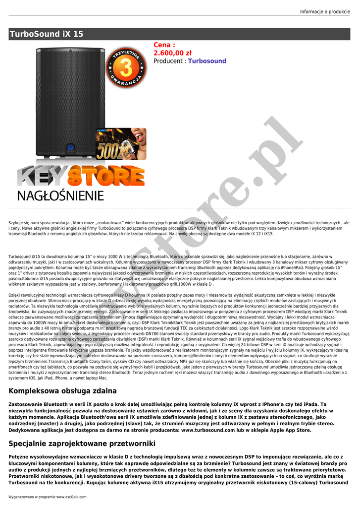 Informacje o produkcie TurboSound iX 15 Cena : 2.600,00 zł or e. pl Producent : Turbosound St Szykuje się nam spora rewolucja , która może „znokautować” wiele konkurencyjnych produktów aktywnych głośników nie tylko pod względem dźwięku ,możliwości technicznych , ale i ceny. Nowe aktywne głośniki angielskiej firmy TurboSound to połączenie cyfrowego procesora DSP firmy Klark Teknik wbudowanym trzy kanałowym mikserem i wykorzystaniem transmisji Bluetooth z renomą angielskich głośników, których nie trzeba reklamować. Na chwilę obecną są dostępne dwa modele iX 12 i iX15. Turbosound iX15 to dwudrożna kolumna 15” o mocy 1000 W z technologią Bluetooth, która doskonale sprawdzi się, jako nagłośnienie przenośne lub stacjonarne, zarówno w odtwarzaniu muzyki, jaki i w zastosowaniach wokalnych. Kolumnę wyposażono w nowoczesny procesor DSP firmy Klark Teknik i wbudowany 3 kanałowy mikser cyfrowy obsługiwany pojedynczym pokrętłem. Kolumna może być także obsługiwana zdalnie z wykorzystaniem transmisji Bluetooth poprzez dedykowaną aplikację na iPhone/iPad. Potężny głośnik 15” oraz 1” driver z tytanową kopułką zapewnia najwyższej jakości odwzorowanie brzmienia w niskich częstotliwościach, rozszerzoną reprodukcję wysokich tonów i wyraźny środek pasma.Kolumna iX15 posiada dwupozycyjne gniazdo na statyw/sztucę umożliwiające elastyczne pokrycie nagłaśnianej przestrzeni. Lekka kompozytowa obudowa wzmacniana włóknem szklanym wyposażona jest w stalowy, perforowany i lakierowany proszkowo grill.1000W w klasie D . K ey Dzięki rewolucyjnej technologii wzmacniacza cyfrowego klasy D kolumna iX posiada potężny zapas mocy i niesamowitą wydajność akustyczną zamknięte w lekkiej i niezwykle poręcznej obudowie. Wzmacniacz pracujący w klasie D odznacza się wysoką wydajnością energetyczną pozwalającą na eliminację ciężkich modułów zasilających i masywnych radiatorów. Ta niezwykła technologia umożliwia konstruowanie wybitnie wydajnych kolumn, wyraźnie lżejszych od produktów konkurencji jednocześnie bardziej przyjaznych dla środowiska, bo zużywających znacznie mniej energii. Zastosowanie w serii iX lekkiego zasilacza impulsowego w połączeniu z cyfrowym procesorem DSP wiodącej marki Klark Teknik oznacza zaawansowane możliwości zarządzania brzmieniem i mocą zapewniające optymalną wydajność i długoterminową niezawodność. Wydajny i lekki moduł wzmacniacza zapewnia do 1000W mocy bi-amp.Sekret doskonałego brzmienia, czyli DSP Klark TeknikKlark Teknik jest powszechnie uważany za jedną z najbardziej prestiżowych brytyjskich marek branży pro audio z 40 letnią historią podpartą m.in. prestiżową nagrodą branżowej fundacji TEC za całokształt działalności. Logo Klark Teknik jest szeroko rozpoznawalne wśród muzyków i realizatorów na całym świecie, a legendarny procesor rewerb DN780 stanowi swoisty standard przemysłowy w branży pro audio. Produkty marki Turbosound wykorzystują szeroko dedykowane rozwiązania cyfrowego zarządzania dźwiękiem (DSP) marki Klark Teknik. Również w kolumnach serii iX sygnał wejściowy trafia do wbudowanego cyfrowego procesora Klark Teknik, zapewniającego jego najwyższą możliwą integralność i reprodukcję zgodną z oryginałem. Co więcej 24-bitowe DSP w serii iX analizuje wchodzący sygnał i poprzez inteligentne filtrowanie faktycznie ulepsza brzmienie. To jakby współpracować z realizatorem monitorującym sygnały na wejściu i wyjściu kolumny iX, wykręcającym idealną korekcję czy też stale wprowadzającym subtelne dostosowania na poziomie crossovera, kompresji/limiterów i innych elementów wpływających na sygnał, co skutkuje wyraźnie lepszym brzmieniem.Transmisja Bluetooth Czasy taśm, dysków CD czy nawet odtwarzaczy MP3 już się skończyły lub właśnie się kończą. Obecnie pliki z muzyką funkcjonują na smartfonach czy też tabletach, co pozwala na pozbycie się wymyślnych kabli i przejściówek. Jako jeden z pierwszych w branży Turbosound umożliwia jednoczesną zdalną obsługę brzmienia i muzyki z wykorzystaniem transmisji stereo Bluetooth. Teraz jednym ruchem ręki możesz włączyć transmisję audio z dowolnego wyposażonego w Bluetooth urządzenia z systemem iOS, jak iPad, iPhone, a nawet laptop Mac. Kompleksowa obsługa zdalna Zastosowanie Bluetooth w serii iX poszło o krok dalej umożliwiając pełną kontrolę kolumny iX wprost z IPhone’a czy też iPada. Ta niezwykła funkcjonalność pozwala na dostosowanie ustawień zarówno z widowni, jak i ze sceny dla uzyskania doskonałego efektu w każdym momencie. Aplikacja Bluetooth’owa serii IX umożliwia zdefiniowanie jednej z kolumn iX z zestawu stereofonicznego, jako nadrzędnej (master) a drugiej, jako podrzędnej (slave) tak, że strumień muzyczny jest odtwarzany w pełnym i realnym trybie stereo. Dedykowana aplikacja jest dostępna za darmo na stronie producenta: www.turbosound.com lub w sklepie Apple App Store. Specjalnie zaprojektowane przetworniki Potężne wysokowydajne wzmacniacze w klasie D z technologią impulsową wraz z nowoczesnym DSP to imponujące rozwiązanie, ale co z kluczowymi komponentami kolumny, które tak naprawdę odpowiedzialne są za brzmienie? Turbosound jest znany w światowej branży pro audio z produkcji jednych z najlepiej brzmiących przetworników, dlatego też te elementy w kolumnie zawsze są traktowane priorytetowo. Przetworniki niskotonowe, jak i wysokotonowe drivery tworzone są z dbałością pod konkretne zastosowanie – to coś, co wyróżnia markę Turbosound na tle konkurencji. Kupując kolumnę aktywną iX15 otrzymujemy oryginalny przetwornik niskotonowy (15-calowy) Turbosound Wygenerowano w programie www.oscGold.com z membraną o niskiej masie oraz 1 calowy driver wysokotonowy z tytanową kopułką. Zostały one zaprojektowane do bezproblemowej pracy w połączeniu z pozostałymi komponentami kolumn iX dla uzyskani