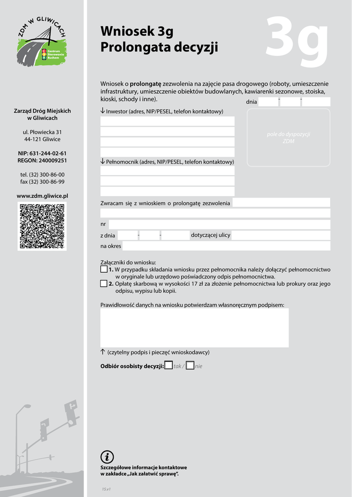3g Zarząd Dróg Miejskich w Gliwicach Wniosek 3g Prolongata decyzji Wniosek o prolongatę zezwolenia na zajęcie pasa drogowego (roboty, umieszczenie infrastruktury, umieszczenie obiektów budowlanych, kawiarenki sezonowe, stoiska, kioski, schody i inne). dnia ¯ ¯ Zarząd Dróg Miejskich w Gliwicach Inwestor (adres, NIP/PESEL, telefon kontaktowy) ul. Płowiecka 31 44-121 Gliwice 1234567890 31 30 29 28 27 26 25 24 23 22 21 20 19 18 17 16 15 14 13 12 11 1234567890 12 11 2020 2019 2018 2017 2016 2015 2014 2013 2012 pole do dyspozycji ZDM NIP: 631-244-02-61 REGON: 240009251 Pełnomocnik (adres, NIP/PESEL, telefon kontaktowy) tel. (32) 300-86-00 fax (32) 300-86-99 www.zdm.gliwice.pl Zwracam się z wnioskiem o prolongatę zezwolenia nr z dnia 1234567890 31 30 29 28 27 26 25 24 23 22 21 20 19 18 17 16 15 14 13 12 11 na okres ¯ 1234567890 12 11 ¯ 2020 2019 2018 2017 2016 2015 2014 2013 2012 dotyczącej ulicy Załączniki do wniosku: 1. W przypadku składania wniosku przez pełnomocnika należy dołączyć pełnomocnictwo w oryginale lub urzędowo poświadczony odpis pełnomocnictwa. 2. Opłatę skarbową w wysokości 17 zł za złożenie pełnomocnictwa lub prokury oraz jego odpisu, wypisu lub kopii. Prawidłowość danych na wniosku potwierdzam własnoręcznym podpisem: (czytelny podpis i pieczęć wnioskodawcy) Odbiór osobisty decyzji: i tak / Szczegółowe informacje kontaktowe w zakładce „Jak załatwić sprawę”. 15.v1 nie 3g Zarząd Dróg Miejskich w Gliwicach JAK ZAŁATWIĆ SPRAWĘ 1. O czym należy wiedzieć: – kompletne wnioski są rozpatrywane zgodnie z datą ich wpływu do Zarządu w terminie 30 dni, jednocześnie informujemy, iż wnioski, w których brakuje wymaganych załączników będą rozpatrzone dopiero po ich uzupełnieniu, o czym osoby składające wniosek zostaną poinformowane pismem. Zarząd Dróg Miejskich w Gliwicach ul. Płowiecka 31 44-121 Gliwice NIP: 631-244-02-61 REGON: 240009251 tel. (32) 300-86-00 fax (32) 300-86-99 2. Jak i gdzie załatwić sprawę: – wypełniony wniosek wraz z załącznikami należy złożyć w ZDM w Gliwicach lub przesłać pocztą, – wniosek składa wnioskodawca: inwestor lub pełnomocnik (w przypadku złożenia wniosku przez pełnomocnika w załączniku należy podać dokładne dane inwestora w tym NIP, Regon lub PESEL), – decyzja zostaje wysłana pocztą (na wniosku jest możliwość zaznaczenia odbioru osobistego), – informacji udziela: Biuro Obsługi Interesantów tel. (32) 300-86-00 www.zdm.gliwice.pl 3. Załączniki: – w przypadku składania wniosków przez spółki prawa handlowego – aktualny wypis z KRS-u. 4. Opłaty: – złożenie wniosku oraz wydanie zezwolenia nie podlega opłacie skarbowej (zwolnione na podstawie części III ust. 44 kol. 4 pkt 9 załącznika do ustawy o opłacie skarbowej), – gdy wniosek składa pełnomocnik należy dołączyć pełnomocnictwo w oryginale lub urzędowo poświadczony odpis pełnomocnictwa i opłatę skarbową w wysokości 17 zł. Opłaty skarbowe należy wpłacić na konto Urzędu Miejskiego w Gliwicach: ING 51 1050 0099 5261 0410 0000 0055 lub w kasie Urzędu Miejskiego w Gliwicach (art. 1 ust. 1 pkt. 2 ustawy o opłacie skarbowej z dnia 16.11.2006 r. Dz. U. 2015.783 j.t.). 5. Podstawa prawna: - art. 39 i 40 Ustawy o drogach publicznych. (Dz. U. 2015.460 j.t.), - art. 33 KPA (Dz. U. 2016.23 j.t.), - ustawa o opłacie skarbowej (Dz. U. 2015.783 j.t.).