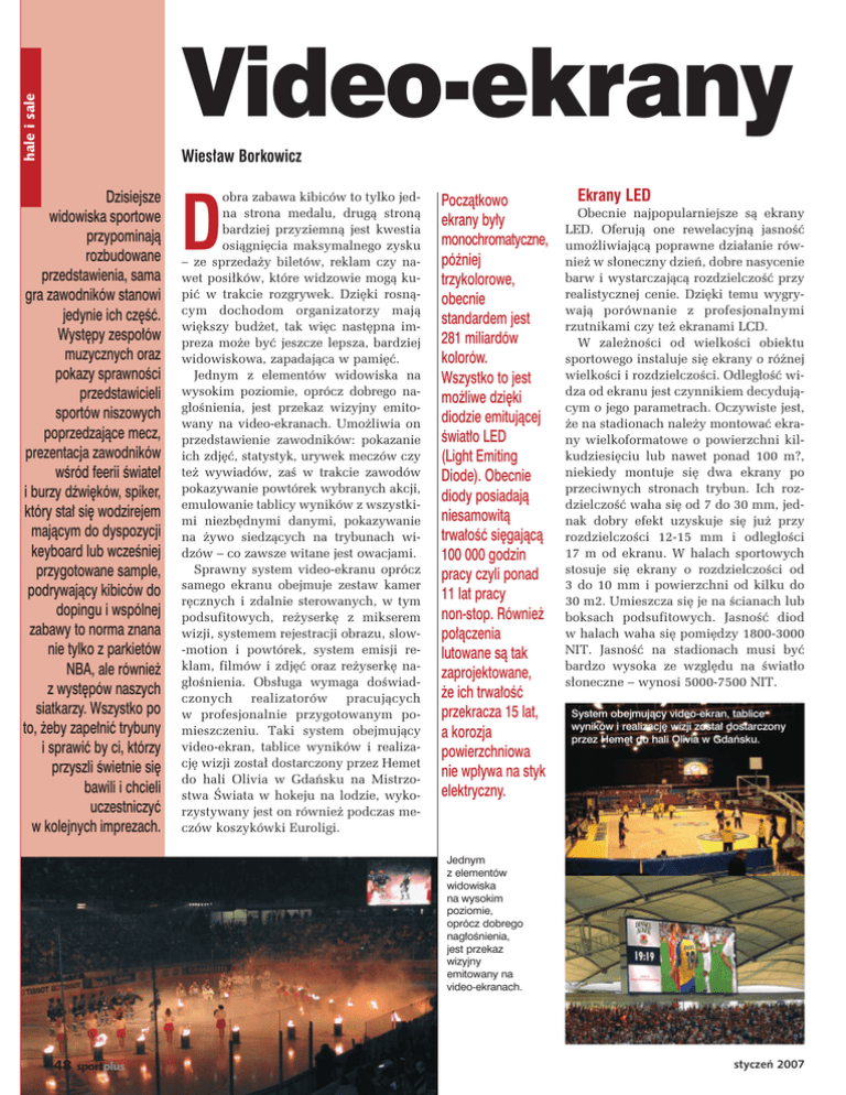 hale i sale Video-ekrany Wies∏aw Borkowicz Dzisiejsze widowiska sportowe przypominajà rozbudowane przedstawienia, sama gra zawodników stanowi jedynie ich cz´Êç. Wyst´py zespo∏ów muzycznych oraz pokazy sprawnoÊci przedstawicieli sportów niszowych poprzedzajàce mecz, prezentacja zawodników wÊród feerii Êwiate∏ i burzy dêwi´ków, spiker, który sta∏ si´ wodzirejem majàcym do dyspozycji keyboard lub wczeÊniej przygotowane sample, podrywajàcy kibiców do dopingu i wspólnej zabawy to norma znana nie tylko z parkietów NBA, ale równie˝ z wyst´pów naszych siatkarzy. Wszystko po to, ˝eby zape∏niç trybuny i sprawiç by ci, którzy przyszli Êwietnie si´ bawili i chcieli uczestniczyç w kolejnych imprezach. obra zabawa kibiców to tylko jedna strona medalu, drugà stronà bardziej przyziemnà jest kwestia osiàgni´cia maksymalnego zysku – ze sprzeda˝y biletów, reklam czy nawet posi∏ków, które widzowie mogà kupiç w trakcie rozgrywek. Dzi´ki rosnàcym dochodom organizatorzy majà wi´kszy bud˝et, tak wi´c nast´pna impreza mo˝e byç jeszcze lepsza, bardziej widowiskowa, zapadajàca w pami´ç. Jednym z elementów widowiska na wysokim poziomie, oprócz dobrego nag∏oÊnienia, jest przekaz wizyjny emitowany na video-ekranach. Umo˝liwia on przedstawienie zawodników: pokazanie ich zdj´ç, statystyk, urywek meczów czy te˝ wywiadów, zaÊ w trakcie zawodów pokazywanie powtórek wybranych akcji, emulowanie tablicy wyników z wszystkimi niezb´dnymi danymi, pokazywanie na ˝ywo siedzàcych na trybunach widzów – co zawsze witane jest owacjami. Sprawny system video-ekranu oprócz samego ekranu obejmuje zestaw kamer r´cznych i zdalnie sterowanych, w tym podsufitowych, re˝yserk´ z mikserem wizji, systemem rejestracji obrazu, slow-motion i powtórek, system emisji reklam, filmów i zdj´ç oraz re˝yserk´ nag∏oÊnienia. Obs∏uga wymaga doÊwiadczonych realizatorów pracujàcych w profesjonalnie przygotowanym pomieszczeniu. Taki system obejmujàcy video-ekran, tablice wyników i realizacj´ wizji zosta∏ dostarczony przez Hemet do hali Olivia w Gdaƒsku na Mistrzostwa Âwiata w hokeju na lodzie, wykorzystywany jest on równie˝ podczas meczów koszykówki Euroligi. D Poczàtkowo ekrany by∏y monochromatyczne, póêniej trzykolorowe, obecnie standardem jest 281 miliardów kolorów. Wszystko to jest mo˝liwe dzi´ki diodzie emitujàcej Êwiat∏o LED (Light Emiting Diode). Obecnie diody posiadajà niesamowità trwa∏oÊç si´gajàcà 100 000 godzin pracy czyli ponad 11 lat pracy non-stop. Równie˝ po∏àczenia lutowane sà tak zaprojektowane, ˝e ich trwa∏oÊç przekracza 15 lat, a korozja powierzchniowa nie wp∏ywa na styk elektryczny. Ekrany LED Obecnie najpopularniejsze sà ekrany LED. Oferujà one rewelacyjnà jasnoÊç umo˝liwiajàcà poprawne dzia∏anie równie˝ w s∏oneczny dzieƒ, dobre nasycenie barw i wystarczajàcà rozdzielczoÊç przy realistycznej cenie. Dzi´ki temu wygrywajà porównanie z profesjonalnymi rzutnikami czy te˝ ekranami LCD. W zale˝noÊci od wielkoÊci obiektu sportowego instaluje si´ ekrany o ró˝nej wielkoÊci i rozdzielczoÊci. Odleg∏oÊç widza od ekranu jest czynnikiem decydujàcym o jego parametrach. Oczywiste jest, ˝e na stadionach nale˝y montowaç ekrany wielkoformatowe o powierzchni kilkudziesi´ciu lub nawet ponad 100 m?, niekiedy montuje si´ dwa ekrany po przeciwnych stronach trybun. Ich rozdzielczoÊç waha si´ od 7 do 30 mm, jednak dobry efekt uzyskuje si´ ju˝ przy rozdzielczoÊci 12-15 mm i odleg∏oÊci 17 m od ekranu. W halach sportowych stosuje si´ ekrany o rozdzielczoÊci od 3 do 10 mm i powierzchni od kilku do 30 m2. Umieszcza si´ je na Êcianach lub boksach podsufitowych. JasnoÊç diod w halach waha si´ pomi´dzy 1800-3000 NIT. JasnoÊç na stadionach musi byç bardzo wysoka ze wzgl´du na Êwiat∏o s∏oneczne – wynosi 5000-7500 NIT. System obejmujàcy video-ekran, tablice wyników i realizacj´ wizji zosta∏ dostarczony przez Hemet do hali Olivia w Gdaƒsku. Jednym z elementów widowiska na wysokim poziomie, oprócz dobrego nag∏oÊnienia, jest przekaz wizyjny emitowany na video-ekranach. 48 sportplus styczeƒ 2007 Tabela przyk∏adowych specyfikacji video-ekranów oferowanych przez firm´ Hemet. SP 10 SP 12 SP 13 Outdoor Outdoor Outdoor Outdoor 8 10 12,5 13,75 15,62 Wymiar modu∏u [mm] 256 x 256 320 x 320 800 x 800 880 x 880 1000 x 1000 RozdzielczoÊç graficzna/m2 125 x 125 100 x 100 64 x 64 64 x 64 64 x 64 15 625 10 000 6400 5289 4096 4 SMD (2R, 1G, 1B) 4 (2 R; 1 G; 1 B) 4 (2 R; 1 G; 1 B) 4 (2 R; 1 G; 1 B) 4 (2 R; 1 G; 1 B) 160° 160° 120° 120° 70° H Zastosowanie RozdzielczoÊç optyczna IloÊç pixeli/m2 LED / pixel Kàt widzenia pionowy Kàt widzenia poziomy Cz´stotliwoÊç odÊwie˝ania JasnoÊç NIT Liczba kolorów Ârednie zapotrzeb. mocy Maksymalne zapot. mocy Temperatura pracy 160° 60° 60° 60° 50° V 600Hz 600Hz 600Hz 600Hz 600Hz 2000 6500 5500 5000 4500 281 000 000 000 281 000 000 000 281 000 000 000 281 000 000 000 281 000 000 000 1,2 kW/m2 1,8 KW/m2 1,4 KW/m2 1,1 KW/m2 1,2 KW/m2 2 2 2 2 0,7 KW/m2 2,0 kW/m 1,0 KW/m od 0°C do +45°C od -20°C do +55°C Im wi´ksza rozdzielczoÊç, tym wi´cej szczegó∏ów mo˝na przekazaç na ekranie tej samej wielkoÊci. Powierzchnia video-ekranu o rozdzielczoÊci 10 mm pokazujàcego ca∏y ekran monitora o rozdzielczoÊci 1024x768 pixeli wynosi∏aby 10,24 m x 7,68 m, dlatego video-ekrany pokazujà tylko cz´Êç obrazu widzianego na ekranie monitora lub ca∏y ekran z pogorszeniem rozdzielczoÊci. Im wi´ksza rozdzielczoÊç i iloÊç barw ekranu tym wi´ksza musi byç moc obliczeniowa komputerów obs∏ugujàcych system. Naturalnie im wi´ksza rozdzielczoÊç tym cena jest wy˝sza. Drugim czynnikiem wp∏ywajàcym na jakoÊç obrazu jest iloÊç barw. Poczàtkowo ekrany by∏y monochromatyczne, póêniej trzykolorowe, obecnie standardem jest 281 miliardów kolorów. Wszystko to jest mo˝liwe dzi´ki dio