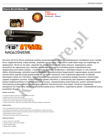 Informacje o produkcie Shure Blx24/Beta 58 Cena : 1.599,00 zł or e. pl Producent : Shure K ey St Od wielu lat firma Shure produkuje zestawy bezprzewodowe, które są podstawowym narzędziem pracy każdej firmy nagłośnieniowej ,małej estrady ,zespołów muzycznych i wszystkich osób które mają coś wspólnego ze śpiewaniem. Shure to nie tylko „legenda”ale jakość która nie ma sobie równych. Zapraszamy zatem wszystkich do zapoznania się z szeroką ofertą tego producenta.Charakterystyka częstotliwościowa dopasowana pod kątem,wokalu, z rozjaśnionym pasmem, środkowym i podciętym,basem w celu kontroli efektu zbliżeniowego. Jednolita superkardioidalna charakterystyka biegunowości zapewniająca wysoki poziom wzmocnienia sygnału przed pojawieniem się sprzężeń zwrotnych oraz znakomitą odporność na dźwięki docierające spoza osi mikrofonu. Magnes neodymowy pozwala na uzyskanie dużego stosunku użytecznego sygnału względem szumów. Siatka ochronna główki mikrofonu z utwardzanej stali zapewnia odpowiedni poziom bezpieczeństwa w trudnych warunkach pracy. Zaawansowany pneumatyczny system antywstrząsowy minimalizuje przekazywanie różnego typu zakłóceń mechanicznych oraz drgań. Zmienna impedancja obciążenia ma minimalny wpływ na charakterystykę pracy mikrofonu. Legendarna jakość i niezawodność pracy produktów Shure. Nadajnik ręczny BLX2 ● Kontrolka LED statusu zasilania oraz stanu naładowania baterii. ● Regulowany poziom wzmocnienia sygnału. ● Szybkie i łatwe zsynchronizowanie częstotliwości transmisji. ● Baterie AA (w zestawie) zapewniają do 14 godzin ciągłej pracy. ● Zasięg transmisji 100 m (300 stóp) - (przy bezpośredniej widoczności nadajnika z odbiornikiem) Odbiornik BLX4 ● Do 12 kompatybilnych systemów (w zależności od kraju). ● Kontrolowane mikroprocesorem działanie wewnętrznych anten działających w układzie różnicowym. ● Jedno dotknięcie przycisku QuickScan powoduje wyszukanie najlepszej wolnej częstotliwości transmisji ● Złącza wyjściowe audio ¼" oraz XLR. ● Dwukolorowa kontrolka LED statusu sygnału audio. Dołączone akcesoria ● Futerał, Część numer: 95D16526 ● Obrotowy adapter, Część numer: 90F4046 ● Zasilacz sieciowy PS23E ● Adapter gwintu: 31B1856 Wygenerowano w programie www.oscGold.com or e. pl St ey K