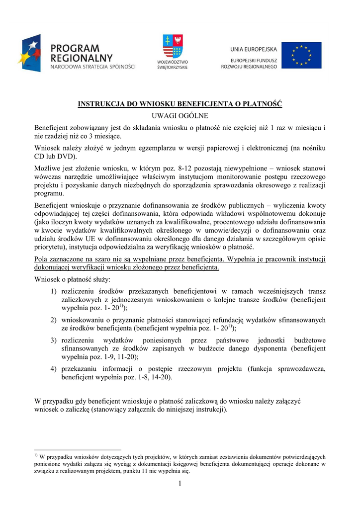 INSTRUKCJA DO WNIOSKU BENEFICJENTA O PŁATNOŚĆ UWAGI OGÓLNE Beneficjent zobowiązany jest do składania wniosku o płatność nie częściej niŜ 1 raz w miesiącu i nie rzadziej niŜ co 3 miesiące. Wniosek naleŜy złoŜyć w jednym egzemplarzu w wersji papierowej i elektronicznej (na nośniku CD lub DVD). MoŜliwe jest złoŜenie wniosku, w którym poz. 8-12 pozostają niewypełnione – wniosek stanowi wówczas narzędzie umoŜliwiające właściwym instytucjom monitorowanie postępu rzeczowego projektu i pozyskanie danych niezbędnych do sporządzenia sprawozdania okresowego z realizacji programu. Beneficjent wnioskuje o przyznanie dofinansowania ze środków publicznych – wyliczenia kwoty odpowiadającej tej części dofinansowania, która odpowiada wkładowi wspólnotowemu dokonuje (jako iloczyn kwoty wydatków uznanych za kwalifikowalne, procentowego udziału dofinansowania w kwocie wydatków kwalifikowalnych określonego w umowie/decyzji o dofinansowaniu oraz udziału środków UE w dofinansowaniu określonego dla danego działania w szczegółowym opisie priorytetu), instytucja odpowiedzialna za weryfikację wniosków o płatność. Pola zaznaczone na szaro nie są wypełniane przez beneficjenta. Wypełnia je pracownik instytucji dokonującej weryfikacji wniosku złoŜonego przez beneficjenta. Wniosek o płatność słuŜy: 1) rozliczeniu środków przekazanych beneficjentowi w ramach wcześniejszych transz zaliczkowych z jednoczesnym wnioskowaniem o kolejne transze środków (beneficjent wypełnia poz. 1- 201)); 2) wnioskowaniu o przyznanie płatności stanowiącej refundację wydatków sfinansowanych ze środków beneficjenta (beneficjent wypełnia poz. 1- 201)); 3) rozliczeniu wydatków poniesionych przez państwowe jednostki budŜetowe sfinansowanych ze środków zapisanych w budŜecie danego dysponenta (beneficjent wypełnia poz. 1-9, 11-20); 4) przekazaniu informacji o postępie rzeczowym projektu (funkcja sprawozdawcza, beneficjent wypełnia poz. 1-8, 14-20). W przypadku gdy beneficjent wnioskuje o płatność zaliczkową do wniosku naleŜy załączyć wniosek o zaliczkę (stanowiący załącznik do niniejszej instrukcji). 1) W przypadku wniosków dotyczących tych projektów, w których zamiast zestawienia dokumentów potwierdzających poniesione wydatki załącza się wyciąg z dokumentacji księgowej beneficjenta dokumentującej operacje dokonane w związku z realizowanym projektem, punktu 11 nie wypełnia się. 1 INSTRUKCJA WYPEŁNIANIA KONKRETNYCH POZYCJI WNIOSKU 1. [pole szare] NaleŜy wpisać datę za jaki okres składany jest wniosek. W przypadku: a) rozliczenia środków przekazanych beneficjentowi w ramach wcześniejszych transz zaliczkowych z jednoczesnym wnioskowaniem o kolejne transze środków, wnioskowania o przyznanie płatności stanowiącej refundację wydatków sfinansowanych ze środków beneficjenta oraz rozliczeniu wydatków poniesionych przez państwowe jednostki budŜetowe sfinansowanych ze środków zapisanych w budŜecie danego dysponenta – naleŜy wpisać datę zapłaty ostatniego wydatku wykazanego we wniosku, b) przekazania informacji o postępie rzeczowym projektu (funkcja sprawozdawcza) – naleŜy podać datę wpływu wniosku do Instytucji Zarządzającej RPOWŚ. 2. W pierwszym wierszu naleŜy podać dane beneficjenta zgodne z umową/decyzją o dofinansowanie projektu. W dalszych wierszach naleŜy wskazać osoby kontaktowe, właściwe do udzielenia informacji w zakresie odpowiednich części wniosku. Nie ma obowiązku podawania danych dwóch osób w przypadku, gdy jedna osoba jest w stanie udzielić odpowiedzi na pytania dotyczące zarówno postępu finansowego jak i rzeczowego. JeŜeli dane osoby kontaktowej pokrywają się z danymi beneficjenta, nie ma obowiązku powtórnego ich wprowadzania. 3. NaleŜy podać nazwę programu, w ramach którego realizowany jest projekt. 4. NaleŜy wybrać z listy numer osi priorytetowej, w ramach której realizowany jest projekt. 5. NaleŜy podać nazwę / tytuł projektu. 6. NaleŜy podać numer projektu zgodny z umową o dofinansowanie lub decyzją. 7. NaleŜy podać numer umowy lub decyzji. 8. NaleŜy wskazać (poprzez wybranie z listy „tak” lub „nie”) czy wniosek o płatność jest końcowym wnioskiem o płatność dotyczącym danego projektu. 8a. NaleŜy podać kwotę poniesionych przez beneficjenta wydatków objętych wnioskiem o płatność i związanych z realizowanym projektem (zarówno kwalifikowalnych jak i niekwalifikowalnych), równieŜ tych nie wykazanych w pkt 11. 9. [pole szare] NaleŜy podać kwotę poniesionych przez beneficjenta wydatków kwalifikowalnych objętych wnioskiem o płatność. Kwota ta powinna być identyczna z pkt (11) „suma ogółem w PLN” (kolumna 9). 10. NaleŜy wpisać kwotę wnioskowaną. W przypadku gdy płatności dla beneficjenta przekazywane są w formie refundacji naleŜy wpisać kwotę stanowiącą wynik mnoŜenia punktu 9 przez montaŜ wynikający z umowy/decyzji o dofinansowanie, tj kwota wnioskowana = pkt 9 x (kwota dofinansowania wynikająca z umowy /całkowite wydatki kwalifikowalne objęte umową) 2 W przypadku gdy beneficjent nabywa prawo do kolejnej transzy zaliczki2 wynikającej z harmonogramu naleŜy uwzględnić dodatkowo wartość kolejnej transzy zaliczki. W przypadku kolejnych transz zaliczki, kwota wnioskowana nie moŜe być wyŜsza niŜ kwota dofinansowania poszczególnych etapów/zadań określonych w aktualnym harmonogramie rzeczowo-finansowym projektu. W przypadku wniosków składanych przez beneficjentów będących państwowymi jednostkami budŜetowymi lub innych wskazanych beneficjentów systemowych, finansujących projekt ze środków zabezpieczonych w budŜecie danej jednostki naleŜy wpisać „0,00” 11. W zestawieniu dokumentów potwierdzających poniesione wydatki ujmuje się jedynie dowody księgowe (faktury VAT, rachunki, listy płac itp.) w całości opłacone w danym okresie rozliczeniowym, za który składany