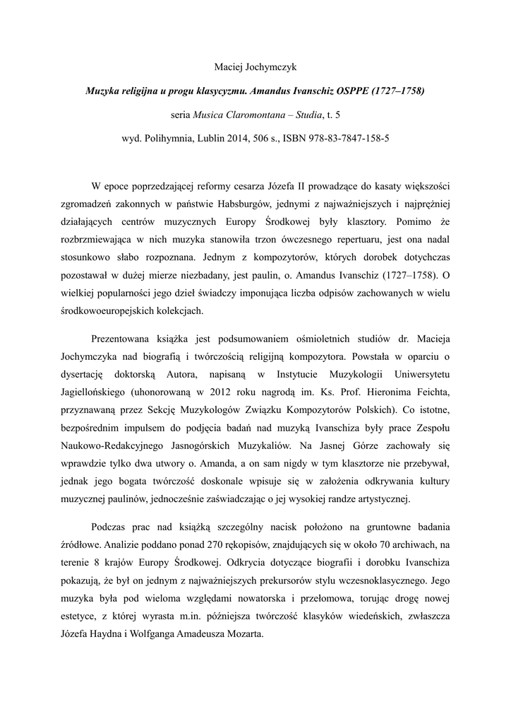Maciej Jochymczyk Muzyka religijna u progu klasycyzmu. Amandus Ivanschiz OSPPE (1727–1758) seria Musica Claromontana – Studia, t. 5 wyd. Polihymnia, Lublin 2014, 506 s., ISBN 978-83-7847-158-5 W epoce poprzedzającej reformy cesarza Józefa II prowadzące do kasaty większości zgromadzeń zakonnych w państwie Habsburgów, jednymi z najważniejszych i najprężniej działających centrów muzycznych Europy Środkowej były klasztory. Pomimo że rozbrzmiewająca w nich muzyka stanowiła trzon ówczesnego repertuaru, jest ona nadal stosunkowo słabo rozpoznana. Jednym z kompozytorów, których dorobek dotychczas pozostawał w dużej mierze niezbadany, jest paulin, o. Amandus Ivanschiz (1727–1758). O wielkiej popularności jego dzieł świadczy imponująca liczba odpisów zachowanych w wielu środkowoeuropejskich kolekcjach. Prezentowana książka jest podsumowaniem ośmioletnich studiów dr. Macieja Jochymczyka nad biografią i twórczością religijną kompozytora. Powstała w oparciu o dysertację doktorską Autora, napisaną w Instytucie Muzykologii Uniwersytetu Jagiellońskiego (uhonorowaną w 2012 roku nagrodą im. Ks. Prof. Hieronima Feichta, przyznawaną przez Sekcję Muzykologów Związku Kompozytorów Polskich). Co istotne, bezpośrednim impulsem do podjęcia badań nad muzyką Ivanschiza były prace Zespołu Naukowo-Redakcyjnego Jasnogórskich Muzykaliów. Na Jasnej Górze zachowały się wprawdzie tylko dwa utwory o. Amanda, a on sam nigdy w tym klasztorze nie przebywał, jednak jego bogata twórczość doskonale wpisuje się w założenia odkrywania kultury muzycznej paulinów, jednocześnie zaświadczając o jej wysokiej randze artystycznej. Podczas prac nad książką szczególny nacisk położono na gruntowne badania źródłowe. Analizie poddano ponad 270 rękopisów, znajdujących się w około 70 archiwach, na terenie 8 krajów Europy Środkowej. Odkrycia dotyczące biografii i dorobku Ivanschiza pokazują, że był on jednym z najważniejszych prekursorów stylu wczesnoklasycznego. Jego muzyka była pod wieloma względami nowatorska i przełomowa, torując drogę nowej estetyce, z której wyrasta m.in. późniejsza twórczość klasyków wiedeńskich, zwłaszcza Józefa Haydna i Wolfganga Amadeusza Mozarta. Integralną częścią publikacji jest Katalog tematyczny dzieł wokalno-instrumentalnych Amanda Ivanschiza, który umożliwi w przyszłości identyfikację utworów kompozytora zachowanych anonimowo lub przypisywanych innym autorom. W aneksie zamieszczono także faksymile XVIII-wiecznego druku kazania, które zostało wygłoszone podczas mszy prymicyjnej Ivanschiza. Jest to niezwykle cenne źródło wiedzy o kompozytorze, które nigdy wcześniej nie było wykorzystywane w badaniach nad jego biografią. Książka ta jest już piątą pozycją ukazującą się w serii Musica Claromontana – Studia, a jednocześnie pierwszą wydaną przez wydawnictwo Polihymnia z Lublina. Nota o autorze Maciej Jochymczyk ukończył z wyróżnieniem studia muzykologiczne w Instytucie Muzykologii UJ w 2007 roku. Za swoją pracę magisterską otrzymał The Ray and Ruth Robinson Musicology Award. W 2012 roku uzyskał na Uniwersytecie Jagiellońskim tytuł doktora na podstawie dysertacji poświęconej twórczości religijnej o. Amanda Ivanschiza, która została uhonorowana nagrodą im. Ks. Prof. Hieronima Feichta, przyznawaną przez Sekcję Muzykologów Związku Kompozytorów Polskich (ZKP). Jego zainteresowania badawcze koncentrują się na muzyce środkowoeuropejskiej XVII i XVIII w., zagadnieniach edytorstwa i źródłoznawstwa muzycznego, a także wykonawstwa historycznego. W ramach swoich badań prowadził kwerendy w archiwach m.in. w Austrii, Chorwacji, Czechach, Niemczech, Słowacji, Słowenii, Szwajcarii i Wielkiej Brytanii. Od 2005 roku aktywnie uczestniczy w pracach zespołu naukowego zajmującego się jednym z najcenniejszych w Polsce zbiorów muzykaliów, zgromadzonym w klasztorze oo. paulinów na Jasnej Górze. Przygotował partytury będące podstawą prawykonań oraz nagrań ponad 50 obszernych dzieł wokalno-instrumentalnych. Jest członkiem Komitetu Naukowo-Redakcyjnego serii nutowej Musica Claromontana, a także członkiem Sekcji Muzykologów ZKP. Od 2012 roku realizuje w Instytucie Muzykologii Uniwersytetu Jagiellońskiego projekt badawczy poświęcony życiu i twórczości o. Amanda Ivanschiza w kontekście przemian stylistycznych w połowie XVIII w.
