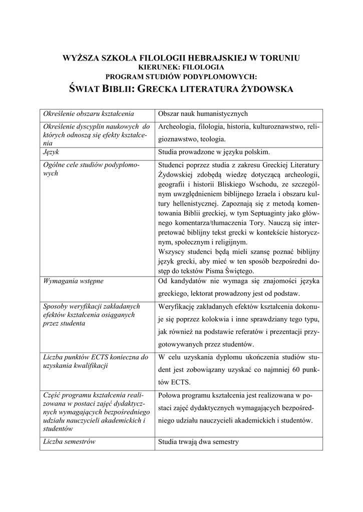 WYŻSZA SZKOŁA FILOLOGII HEBRAJSKIEJ W TORUNIU KIERUNEK: FILOLOGIA PROGRAM STUDIÓW PODYPLOMOWYCH: ŚWIAT BIBLII: GRECKA LITERATURA ŻYDOWSKA Określenie obszaru kształcenia Obszar nauk humanistycznych Określenie dyscyplin naukowych do których odnoszą się efekty kształcenia Język Archeologia, filologia, historia, kulturoznawstwo, reli- Ogólne cele studiów podyplomowych Studenci poprzez studia z zakresu Greckiej Literatury Żydowskiej zdobędą wiedzę dotyczącą archeologii, geografii i historii Bliskiego Wschodu, ze szczególnym uwzględnieniem biblijnego Izraela i obszaru kultury hellenistycznej. Zapoznają się z metodą komentowania Biblii greckiej, w tym Septuaginty jako głównego komentarza/tłumaczenia Tory. Nauczą się interpretować biblijny tekst grecki w kontekście historycznym, społecznym i religijnym. Wszyscy studenci będą mieli szansę poznać biblijny język grecki, aby mieć w ten sposób bezpośredni dostęp do tekstów Pisma Świętego. Od kandydatów nie wymaga się znajomości języka Wymagania wstępne gioznawstwo, teologia. Studia prowadzone w języku polskim. greckiego, lektorat prowadzony jest od podstaw. Sposoby weryfikacji zakładanych efektów kształcenia osiąganych przez studenta Weryfikację zakładanych efektów kształcenia dokonuje się poprzez kolokwia i inne sprawdziany tego typu, jak również na podstawie referatów i prezentacji przygotowywanych przez studentów. Liczba punktów ECTS konieczna do uzyskania kwalifikacji W celu uzyskania dyplomu ukończenia studiów student jest zobowiązany uzyskać co najmniej 60 punktów ECTS. Część programu kształcenia realizowana w postaci zajęć dydaktycznych wymagających bezpośredniego udziału nauczycieli akademickich i studentów Połowa programu kształcenia jest realizowana w po- Liczba semestrów Studia trwają dwa semestry staci zajęć dydaktycznych wymagających bezpośredniego udziału nauczycieli akademickich i studentów. Opis zakładanych efektów kształcenia Zob. załącznik 1. Plan studiów Zob. załącznik 2. Sylabusy poszczególnych modułów kształcenia uwzględniające metody weryfikacji efektów kształcenia osiąganych przez studentów Zob. załącznik 3.