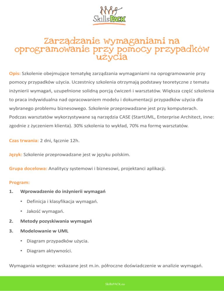 Zarządzanie wymaganiami na oprogramowanie przy pomocy przypadków użycia Opis: Szkolenie obejmujące tematykę zarządzania wymaganiami na oprogramowanie przy pomocy przypadków użycia. Uczestnicy szkolenia otrzymają podstawy teoretyczne z tematu inżynierii wymagań, uzupełnione solidną porcją ćwiczeń i warsztatów. Większa część szkolenia to praca indywidualna nad opracowaniem modelu i dokumentacji przypadków użycia dla wybranego problemu biznesowego. Szkolenie przeprowadzane jest przy komputerach. Podczas warsztatów wykorzystywane są narzędzia CASE (StartUML, Enterprise Architect, inne: zgodnie z życzeniem klienta). 30% szkolenia to wykład, 70% ma formę warsztatów. Czas trwania: 2 dni, łącznie 12h. Język: Szkolenie przeprowadzane jest w języku polskim. Grupa docelowa: Analitycy systemowi i biznesowi, projektanci aplikacji. Program: 1. Wprowadzenie do inżynierii wymagań • Definicja i klasyfikacja wymagań. • Jakość wymagań. 2. Metody pozyskiwania wymagań 3. Modelowanie w UML • Diagram przypadków użycia. • Diagram aktywności. Wymagania wstępne: wskazane jest m.in. półroczne doświadczenie w analizie wymagań. SkillsPACK.eu Trener W branży IT ponad 10 lat. Posiada międzynarodowe doświadczenie w zakresie analizy biznesowej oraz inżynierii wymagań, zarządzania jakością i zarządzania projektami: pracowała dla wiodących organizacji finansowych w RPA, Holandii, Austrii, Słowacji, Włoszech i w Polsce. Podczas swojej kariery pełniła różne role, od testera, przez technical writera, po kierownika projektów R&D, co umożliwiło jej poznanie wielu aspektów realizacji projektów IT i nauczyło postrzegania podejmowanych tematów z różnych punktów widzenia. Karolina Zmitrowicz Praca w międzynarodowych, wielokulturowych zespołach projektowych wykształciła w Karolinie nie tylko umiejętności efektywnego planowania, koordynacji złożonych działań, ale i doskonałe umiejętności interpersonalne. Autorka wielu artykułów, książek z obszaru inżynierii wymagań oraz testowania: „Inżynieria wymagań w praktyce” (PWN 2014) „Analityk systemów” (PWN 2015) „Tester oprogramowania” (PWN 2015) „Jakość projektów informatycznych. Rozwój i testowanie oprogramowania” (Helion 2015) Posiada certyfikaty: REQB, IQBBA, IBUQ, ISTQB. Ponadto jest certyfikowany audytorem systemów zarządzania jakością zgodnych z ISO 9001. Czynnie wspiera prace Stowarzyszenia Jakości Systemów Informatycznych działając w grupach roboczych ISTQB i REQB. Bierze też udział w pracach nad rozwojem programu certyfikacji IQBBA. Wykłada przedmioty związane z testowaniem oprogramowania na Wyższej Szkole Bankowej w Gdańsku oraz prowadzi studia podyplomowe „Inżynieria wymagań w projektach informatycznych”. SkillsPACK.eu