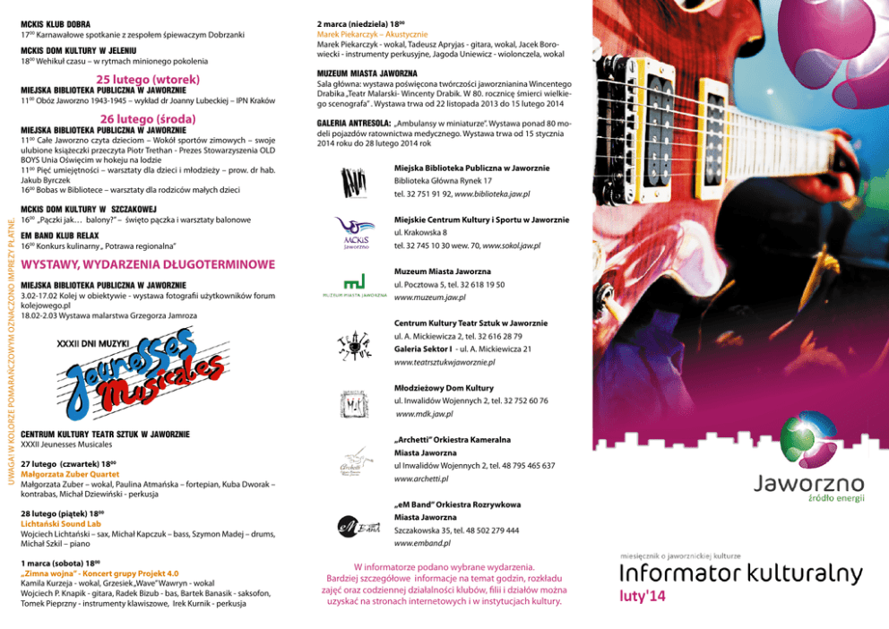MCKiS Klub DOBRA 1700 Karnawałowe spotkanie z zespołem śpiewaczym Dobrzanki MCKiS Dom Kultury w Jeleniu 1800 Wehikuł czasu – w rytmach minionego pokolenia 25 lutego (wtorek) MIEJSKA BIBLIOTEKA PUBLICZNA W JAWORZNIE 1100 Obóz Jaworzno 1943-1945 – wykład dr Joanny Lubeckiej – IPN Kraków 26 lutego (środa) UWAGA! W kolorze pomarańczowym oznaczono imprezy PŁATNE. MIEJSKA BIBLIOTEKA PUBLICZNA W JAWORZNIE 1100 Całe Jaworzno czyta dzieciom – Wokół sportów zimowych – swoje ulubione książeczki przeczyta Piotr Trethan - Prezes Stowarzyszenia OLD BOYS Unia Oświęcim w hokeju na lodzie 1100 Pięć umiejętności – warsztaty dla dzieci i młodzieży – prow. dr hab. Jakub Byrczek 1600 Bobas w Bibliotece – warsztaty dla rodziców małych dzieci MCKiS Dom Kultury w Szczakowej 1600 „Pączki jak… balony?” – święto pączka i warsztaty balonowe eM Band KLUB RELAX 1600 Konkurs kulinarny „ Potrawa regionalna” WYSTAWY, WYDARZENIA DŁUGOTERMINOWE MIEJSKA BIBLIOTEKA PUBLICZNA W JAWORZNIE 3.02-17.02 Kolej w obiektywie - wystawa fotografii użytkowników forum kolejowego.pl 18.02-2.03 Wystawa malarstwa Grzegorza Jamroza 2 marca (niedziela) 1800 Marek Piekarczyk – Akustycznie Marek Piekarczyk - wokal, Tadeusz Apryjas - gitara, wokal, Jacek Borowiecki - instrumenty perkusyjne, Jagoda Uniewicz - wiolonczela, wokal MUZEUM MIASTA JAWORZNA Sala główna: wystawa poświęcona twórczości jaworznianina Wincentego Drabika „Teatr Malarski- Wincenty Drabik. W 80. rocznicę śmierci wielkiego scenografa” . Wystawa trwa od 22 listopada 2013 do 15 lutego 2014 Galeria Antresola: „Ambulansy w miniaturze”. Wystawa ponad 80 modeli pojazdów ratownictwa medycznego. Wystawa trwa od 15 stycznia 2014 roku do 28 lutego 2014 rok Miejska Biblioteka Publiczna w Jaworznie Biblioteka Główna Rynek 17 tel. 32 751 91 92, www.biblioteka.jaw.pl Miejskie Centrum Kultury i Sportu w Jaworznie ul. Krakowska 8 tel. 32 745 10 30 wew. 70, www.sokol.jaw.pl Muzeum Miasta Jaworzna ul. Pocztowa 5, tel. 32 618 19 50 www.muzeum.jaw.pl Centrum Kultury Teatr Sztuk w Jaworznie ul. A. Mickiewicza 2, tel. 32 616 28 79 Galeria Sektor I - ul. A. Mickiewicza 21 www.teatrsztukwjaworznie.pl Młodzieżowy Dom Kultury ul. Inwalidów Wojennych 2, tel. 32 752 60 76 www.mdk.jaw.pl CENTRUM KULTURY TEATR SZTUK W JAWORZNIE XXXII Jeunesses Musicales „Archetti” Orkiestra Kameralna Miasta Jaworzna 27 lutego (czwartek) 1800 Małgorzata Zuber Quartet Małgorzata Zuber – wokal, Paulina Atmańska – fortepian, Kuba Dworak – kontrabas, Michał Dziewiński - perkusja ul Inwalidów Wojennych 2, tel. 48 795 465 637 28 lutego (piątek) 1800 Lichtański Sound Lab Wojciech Lichtański – sax, Michał Kapczuk – bass, Szymon Madej – drums, Michał Szkil – piano Miasta Jaworzna 1 marca (sobota) 1800 „Zimna wojna” - Koncert grupy Projekt 4.0 Kamila Kurzeja - wokal, Grzesiek „Wave” Wawryn - wokal Wojciech P. Knapik - gitara, Radek Bizub - bas, Bartek Banasik - saksofon, Tomek Pieprzny - instrumenty klawiszowe, Irek Kurnik - perkusja www.archetti.pl „eM Band” Orkiestra Rozrywkowa Szczakowska 35, tel. 48 502 279 444 www.emband.pl W informatorze podano wybrane wydarzenia. Bardziej szczegółowe informacje na temat godzin, rozkładu zajęć oraz codziennej działalności klubów, filii i działów można uzyskać na stronach internetowych i w instytucjach kultury. 1 lutego (sobota) 8 lutego (sobota) MUZEUM MIASTA JAWORZNA 1000 Pokazy filmów: „Zbigniew Krudzielski - pozytywista czy romantyk?” Oraz „Cementownia Jaworzno” MUZEUM MIASTA JAWORZNA 1000 Rody, herby, herbarze – zagadnienia z heraldyki MŁODZIEŻOWY DOM KULTURY 1100 Finał Jaworznickiego Konkursu Talentów „Szału nie ma” MCKiS Klub STRAŻAK 1600 Wycieczka do Wspólnoty Betlejem na wystawę projektu modernizacji budynku wg twórczości Gaudiego i Hundertwassera 10 lutego (poniedziałek) MCKIS - Hala widowiskowo-sportowa 900 II Zimowy Turniej Rycerski MCKiS Dom Kultury w Jeleniu 1000 Jubileusz Jelenia – historię dzielnicy opowiada Maria Leś – Runicka MCKiS Dom Kultury w Szczakowej 1030 Improwizowany mini spektakl dla dzieci MCKiS Klub PODŁĘŻE 1700 Karaoke – konkurs muzyczny dla dzieci i młodzieży 7 lutego (piątek) MIEJSKA BIBLIOTEKA PUBLICZNA W JAWORZNIE 800 Warsztaty dziennikarsko-filmowe dla młodzieży – prow. Edyta Kaszyca i Ewa Maj. Zajęcia współorganizowane z III Liceum Ogólnokształcącym 1700 Czytanie siostrą pisania. Rozmowy o literaturze z Małgorzatą Cichy – Ile komedii jest w „Komedii ludzkiej” Honore de Balzaka – wykład dr Karoliny Wojtasik MCKiS Klub WEGA 1700 Vivat antenaci! – uroczystość środowiskowa z chórem Ćwierćnutki MŁODZIEŻOWY DOM KULTURY 1630 Zabawa Karnawałowa dla dzieci MUZEUM MIASTA JAWORZNA 1700 „Spotkanie przy kawie – Nieistniejące już fabryki i zakłady przemysłowe Jaworzna”. 12 lutego (środa) MIEJSKA BIBLIOTEKA PUBLICZNA W JAWORZNIE 1600 Bobas w Bibliotece – warsztaty dla rodziców małych dzieci 1700 Kondycja ludzka - teoria i praktyka – Mądrość w powtarzaniu - prow. dr hab. Jakub Byrczek MCKiS Klub NIKO 1600 Zabawa walentynkowa dla dzieci 13 lutego (czwartek) MIEJSKA BIBLIOTEKA PUBLICZNA W JAWORZNIE 1100 Klub Czytających Dziadków – Bal u Królowej Śniegu 1700 Ona w jego oczach – znani mężczyźni o kobietach – spotkanie autorskie z Iloną Adamską MCKiS Klub STRAŻAK 1600 Walentynki – dzień uprzejmości MCKiS Dom Kultury w Jeleniu 1700 Bal karnawałowy dla dzieci CENTRUM KULTURY TEATR SZTUK W JAWORZNIE 1700 Spotkanie z cyklu „Podwieczorki w foyer” 14 lutego (piątek) MCKiS Dom Kultury w Jeleniu 1600 Walentynkowa zabawa dla dzieci i młodzieży MCKiS Klub DOBRA 1600 Piernikowe serca z okazji św. Walentego MŁODZIEŻOWY DOM KULTURY 900 i 1100 „Pierścień i róża” - walentynkowy spektakl dla dzieci 15 lutego (sobota) MUZEUM MIASTA JAWORZNA 1000 Warsztaty kostiumologiczne MCKiS Klub WEGA 1500 Pers czy dachowiec – o kotach w Świato