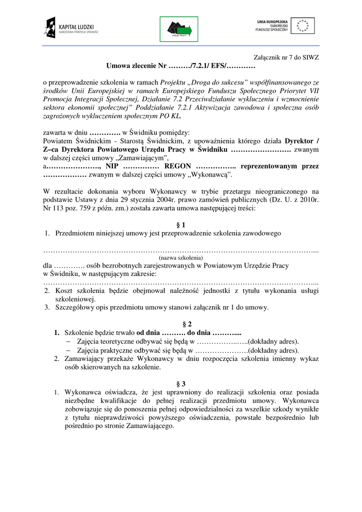 Załącznik nr 7 do SIWZ Umowa zlecenie Nr ………/7.2.1/ EFS/………… o przeprowadzenie szkolenia w ramach Projektu „Droga do sukcesu” współfinansowanego ze środków Unii Europejskiej w ramach Europejskiego Funduszu Społecznego Priorytet VII Promocja Integracji Społecznej, Działanie 7.2 Przeciwdziałanie wykluczeniu i wzmocnienie sektora ekonomii społecznej” Poddziałanie 7.2.1 Aktywizacja zawodowa i społeczna osób zagrożonych wykluczeniem społecznym PO KL. zawarta w dniu …………. w Świdniku pomiędzy: Powiatem Świdnickim - Starostą Świdnickim, z upoważnienia którego działa Dyrektor / Z–ca Dyrektora Powiatowego Urzędu Pracy w Świdniku ……………………. zwanym w dalszej części umowy „Zamawiającym”, a…………………., NIP …………… REGON …………….. reprezentowanym przez ……………… zwanym w dalszej części umowy „Wykonawcą”. W rezultacie dokonania wyboru Wykonawcy w trybie przetargu nieograniczonego na podstawie Ustawy z dnia 29 stycznia 2004r. prawo zamówień publicznych (Dz. U. z 2010r. Nr 113 poz. 759 z późn. zm.) została zawarta umowa następującej treści: §1 1. Przedmiotem niniejszej umowy jest przeprowadzenie szkolenia zawodowego …………………………………………………………………………………………………... (nazwa szkolenia) dla …………. osób bezrobotnych zarejestrowanych w Powiatowym Urzędzie Pracy w Świdniku, w następującym zakresie: …………………………………………………………………………………………………... 2. Koszt szkolenia będzie obejmował należność jednostki z tytułu wykonania usługi szkoleniowej. 3. Szczegółowy opis przedmiotu umowy stanowi załącznik nr 1 do umowy. §2 1. Szkolenie będzie trwało od dnia ………. do dnia ……….... − Zajęcia teoretyczne odbywać się będą w ……………..…..(dokładny adres). − Zajęcia praktyczne odbywać się będą w ………………….(dokładny adres). 2. Zamawiający przekaże Wykonawcy w dniu rozpoczęcia szkolenia imienny wykaz osób skierowanych na szkolenie. §3 1. Wykonawca oświadcza, że jest uprawniony do realizacji szkolenia oraz posiada niezbędne kwalifikacje do pełnej realizacji przedmiotu umowy. Wykonawca zobowiązuje się do ponoszenia pełnej odpowiedzialności za wszelkie szkody wynikłe z tytułu nieprawdziwości powyższego oświadczenia, powstałe bezpośrednio lub pośrednio po stronie Zamawiającego. §4 Wykonawca zobowiązuje się do: 1. Przeprowadzenia szkolenia w terminie wskazanym w załączniku nr 1 do umowy. 2. Załączenia do umowy szkoleniowej: • programu szkolenia (Załącznik nr 2 do umowy), • wzoru anonimowej ankiety dla uczestników szkolenia służącej do oceny szkolenia (Załącznik nr 3 do umowy), • wzoru zaświadczenia lub innego dokumentu potwierdzającego ukończenie szkolenia i uzyskanie kwalifikacji (Załącznik nr 4 do umowy). • kompletu materiałów szkoleniowych, które będą otrzymywać uczestnicy szkolenia wraz z ich wykazem (Załącznik nr 5 do umowy). • kalkulacji kosztów szkolenia (Załącznik nr 6 do umowy). 3. Naniesienia zmian w załączonych materiałach szkoleniowych dotyczących realizowanego programu szkolenia, w przypadku zgłoszenia do nich uwag przez Instytucję Pośredniczącą II stopnia (WUP w Lublinie) w terminie 2 dni roboczych od powiadomienia przez PUP w Świdniku. 4. Dostarczenia harmonogramu szkolenia nie później niż na 5 dni roboczych przed rozpoczęciem szkolenia. 5. Przeprowadzenia szkolenia zgodnie z obowiązującymi w tym zakresie przepisami. 6. Prowadzenia dokumentacji przebiegu szkolenia składającej się z: a) dziennika zajęć edukacyjnych zawierającego tematy i wymiar godzin zajęć edukacyjnych oraz listę obecności zawierającą imię, nazwisko oraz podpis uczestnika szkolenia; b) protokołu i karty ocen z okresowych sprawdzianów efektów kształcenia oraz egzaminu końcowego, jeżeli zostały przeprowadzone; c) rejestru wydanych zaświadczeń lub innych dokumentów potwierdzających ukończenie szkolenia i uzyskanie kwalifikacji zawierającego: numer, imię i nazwisko oraz numer PESEL uczestnika szkolenia, a w przypadku cudzoziemca numer dokumentu stwierdzającego tożsamość, oraz nazwę szkolenia i datę wydania zaświadczenia. 7. Dostarczania kopii listy obecności do Zamawiającego do końca każdego miesiąca kalendarzowego, w którym prowadzone jest szkolenie. 8. Informowania Zamawiającego o każdorazowej nieusprawiedliwionej nieobecności uczestnika szkolenia na zajęciach. 9. Zawiadomienia o fakcie nie przystąpienia uczestnika do zaliczeń, sprawdzianów, egzaminów. 10. Wydania osobie przeszkolonej zaświadczenia lub innego dokumentu potwierdzającego ukończenie szkolenia i uzyskanie kwalifikacji. 11. Poddania się kontroli przeprowadzanej przez Zamawiającego w zakresie prawidłowości realizacji niniejszej umowy. Prawo kontroli przysługuje Zamawiającemu, Instytucji Pośredniczącej II stopnia (WUP w Lublinie) oraz innym uprawnionym podmiotom w siedzibie Wykonawcy, jak również w miejscu realizowania umowy. 12. Zapewnienia podmiotom, o których mowa w ust. 11, prawo wglądu we wszystkie dokumenty (w tym finansowe, elektroniczne) związane z realizacją umowy przez cały okres ich przechowywania określony w §6 ust. 2 i 3. 13. Zarejestrowania instytucji szkoleniowej w internetowej bazie ofert szkoleniowych dostępnej na stronie internetowej: www.inwestycjawkadry.pl i aktualizowania w tej bazie informacji o każdym szkoleniu otwartym organizowanym w ramach projektu „Droga do sukcesu” – Poddziałanie 7.2.1 PO KL nie rzadziej niż raz w miesiącu. 14. Zawiadomienia Zamawiającego o zakończeniu szkolenia oraz o jego wynikach. 15. Zapewnienia uczestnikom szkolenia warunków pracy zgodnie z przepisami BHP. 16. Zapewnienia uczestnikom szkolenia nadzoru wewnętrznego służącego podnoszeniu jakości prowadzonego 