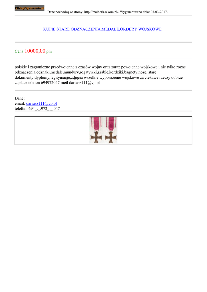 Dane pochodzą ze strony: http://malbork.wkom.pl/. Wygenerowano dnia: 03-03-2017. KUPIE STARE ODZNACZENIA,MEDALE,ORDERY WOJSKOWE Cena:10000,00 pln polskie i zagraniczne przedwojenne z czasów wojny oraz zaraz powojenne wojskowe i nie tylko różne odznaczenia,odznaki,medale,mundury,rogatywki,szable,kordziki,bagnety,noże, stare dokumenty,dyplomy,legitymacje,zdjęcia wszelkie wyposażenie wojskowe za ciekawe rzeczy dobrze zaplace telefon 694972047 meil [email protected] Dane: email: [email protected] telefon: 694_._.972_._.047