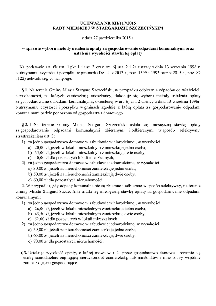 UCHWAŁA NR XII/117/2015 RADY MIEJSKIEJ W STARGARDZIE SZCZECIŃSKIM z dnia 27 października 2015 r. w sprawie wyboru metody ustalenia opłaty za gospodarowanie odpadami komunalnymi oraz ustalenia wysokości stawki tej opłaty Na podstawie art. 6k ust. 1 pkt 1 i ust. 3 oraz art. 6j ust. 2 i 2a ustawy z dnia 13 września 1996 r. o utrzymaniu czystości i porządku w gminach (Dz. U. z 2013 r., poz. 1399 i 1593 oraz z 2015 r., poz. 87 i 122) uchwala się, co następuje: § 1. Na terenie Gminy Miasta Stargard Szczeciński, w przypadku odbierania odpadów od właścicieli nieruchomości, na których zamieszkują mieszkańcy, dokonuje się wyboru metody ustalenia opłaty za gospodarowanie odpadami komunalnymi, określonej w art. 6j ust. 2 ustawy z dnia 13 września 1996r. o utrzymaniu czystości i porządku w gminach zgodnie z którą opłata za gospodarowanie odpadami komunalnymi będzie ponoszona od gospodarstwa domowego. § 2. 1. Na terenie Gminy Miasta Stargard Szczeciński ustala się miesięczną stawkę opłaty za gospodarowanie odpadami komunalnymi zbieranymi i odbieranymi w sposób selektywny, z zastrzeżeniem ust. 2: 1) za jedno gospodarstwo domowe w zabudowie wielorodzinnej, w wysokości: a) 20,00 zł, jeżeli w lokalu mieszkalnym zamieszkuje jedna osoba, b) 35,00 zł, jeżeli w lokalu mieszkalnym zamieszkują dwie osoby, c) 40,00 zł dla pozostałych lokali mieszkalnych; 2) za jedno gospodarstwo domowe w zabudowie jednorodzinnej w wysokości: a) 30,00 zł, jeżeli na nieruchomości zamieszkuje jedna osoba, b) 50,00 zł, jeżeli na nieruchomości zamieszkują dwie osoby, c) 60,00 zł dla pozostałych nieruchomości. 2. W przypadku, gdy odpady komunalne nie są zbierane i odbierane w sposób selektywny, na terenie Gminy Miasta Stargard Szczeciński ustala się miesięczną stawkę opłaty za gospodarowanie odpadami komunalnymi: 1) za jedno gospodarstwo domowe w zabudowie wielorodzinnej, w wysokości: a) 26,00 zł, jeżeli w lokalu mieszkalnym zamieszkuje jedna osoba, b) 45,50 zł, jeżeli w lokalu mieszkalnym zamieszkują dwie osoby, c) 52,00 zł dla pozostałych w lokali mieszkalnych; 2) za jedno gospodarstwo domowe w zabudowie jednorodzinnej w wysokości: a) 39,00 zł, jeżeli na nieruchomości zamieszkuje jedna osoba, b) 65,00 zł, jeżeli na nieruchomości zamieszkują dwie osoby, c) 78,00 zł dla pozostałych nieruchomości. § 3. Ustalając wysokość opłaty, o której mowa w § 2 przez gospodarstwo domowe - rozumie się osobę samodzielnie zajmującą nieruchomość zamieszkałą, lub małżonków i inne osoby wspólnie zamieszkujące i gospodarujące. § 4. Traci moc uchwała Nr XXIV/270/2012 Rady Miejskiej w Stargardzie Szczecińskim z dnia 18 grudnia 2012 r. w sprawie wyboru metody ustalenia opłaty za gospodarowanie odpadami komunalnymi oraz ustalenia wysokości stawki tej opłaty zmieniona uchwałą Nr XXVII/324/2013 Rady Miejskiej w Stargardzie Szczecińskim z dnia 26 marca 2013 r. (Dz. Urz. Woj. Zachodniopomorskiego z 2013 r., poz. 370, poz. 1683). § 5. Wykonanie uchwały powierza się Prezydentowi Miasta Stargard Szczeciński. § 6. Uchwała podlega ogłoszeniu w Dzienniku Urzędowym Województwa Zachodniopomorskiego i wchodzi w życie z dniem 1 stycznia 2016 r. UZASADNIENIE W związku z przepisami art. 11 ustawy z dnia 28 listopada 2014 r. o zmianie ustawy o utrzymaniu czystości i porządku w gminach (Dz. U. z 2015 r. poz. 87) gminy zostały zobowiązane do uchwalenia nowych aktów prawa miejscowego w zakresie systemów gospodarowania odpadami komunalnymi w terminie 18 miesięcy od dnia wejścia w życie ustawy, tj. do 01.08.2016 r. (dotyczy uchwał wydanych na podstawie art. 4, art. 6l, art. 6n i art. 6r ust. 3 i 4 zmienianej ustawy). W wyniku nowelizacji ustawy zmianie uległy również przepisy w zakresie sposobu naliczania opłat za gospodarowanie odpadami komunalnymi. Nowelizacja art. 6k, poprzez m.in. dodanie ust. 2a i zmianę ust. 2, 3 i 4 wprowadziła inny niż dotychczas sposób ustalania przez radę gminy stawek opłat. Według tych zasad, stawką podstawową jest stawka opłaty za gospodarowanie odpadami zbieranymi i odbieranymi w sposób selektywny. Natomiast jeżeli odpady komunalne nie są zbierane i odbierane w sposób selektywny, rada gminy określa wyższe stawki. Ponadto, przy określaniu stawek rada gminy bierze pod uwagę koszty funkcjonowania systemu gospodarowania odpadami komunalnymi, o których mowa w znowelizowanych przepisach art. 6r ust. 22b i 2d. Ustalone przez radę gminy stawki nie mogą także przekroczyć stawek maksymalnych, określonych w ustawie. Poza tym poprzez zmianę art. 6k ust. 4 ustawy rady gmin nie mogą już w indywidualny sposób określać szczegółowych zasad ustalania opłat za gospodarowanie odpadami. W Stargardzie Szczecińskim w ten sposób ograniczono opłaty (max. do 150 m2 w zabudowie jednorodzinnej i do 100 m2 w zabudowie wielorodzinnej) oraz ograniczono opłaty dla gospodarstw jedno i dwuosobowych. Np. właściciel domu jednorodzinnego o powierzchni 300 m2 dotychczas płacił 75 zł, a w obecnym stanie prawnym musiałby zapłacić za rzeczywistą powierzchnię, czyli 150 zł. W związku z nowelizacją przepisów ustawy pojawiło się ryzyko braku możliwości dalszego ograniczenia wysokości wnoszonych opłat przez właścicieli mieszkań o większym niż maksymalnie ustalono metrażu (zwłaszcza rodzin wielodzietnych) oraz ryzyko braku możliwości ochrony osób prowadzących samotnie gospodarstwa domowe. Powoduje to konieczność znalezienia nowych rozwiązań, głównie w zakresie ponownego wyboru metody naliczenia opłat oraz ustalenia stawek opłat na poziomie akceptowalnym przez możliwie wszystkie rodzaje gospodarstw domowych. W związku z tym, szukając metody naliczania opłaty, która spełniłaby wymagania znowelizowanej ustawy, a jednocześnie zachowałaby zalety metody dotychczas stosowanej w Stargardzie Szczecińskim, rozważono wszystkie cztery metody dopuszczone w przepisach ustawy. W wyniku pr