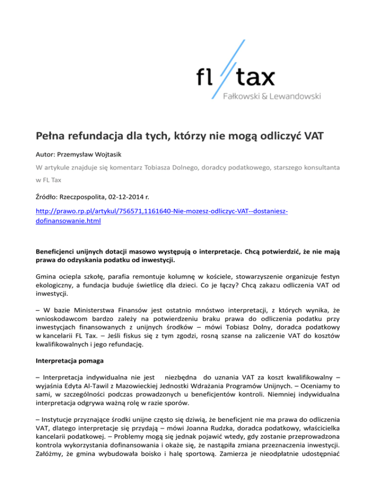 Pełna refundacja dla tych, którzy nie mogą odliczyć VAT Autor: Przemysław Wojtasik W artykule znajduje się komentarz Tobiasza Dolnego, doradcy podatkowego, starszego konsultanta w FL Tax Źródło: Rzeczpospolita, 02-12-2014 r. http://prawo.rp.pl/artykul/756571,1161640-Nie-mozesz-odliczyc-VAT--dostanieszdofinansowanie.html Beneficjenci unijnych dotacji masowo występują o interpretacje. Chcą potwierdzić, że nie mają prawa do odzyskania podatku od inwestycji. Gmina ociepla szkołę, parafia remontuje kolumnę w kościele, stowarzyszenie organizuje festyn ekologiczny, a fundacja buduje świetlicę dla dzieci. Co je łączy? Chcą zakazu odliczenia VAT od inwestycji. – W bazie Ministerstwa Finansów jest ostatnio mnóstwo interpretacji, z których wynika, że wnioskodawcom bardzo zależy na potwierdzeniu braku prawa do odliczenia podatku przy inwestycjach finansowanych z unijnych środków – mówi Tobiasz Dolny, doradca podatkowy w kancelarii FL Tax. – Jeśli fiskus się z tym zgodzi, rosną szanse na zaliczenie VAT do kosztów kwalifikowalnych i jego refundację. Interpretacja pomaga – Interpretacja indywidualna nie jest niezbędna do uznania VAT za koszt kwalifikowalny – wyjaśnia Edyta Al-Tawil z Mazowieckiej Jednostki Wdrażania Programów Unijnych. – Oceniamy to sami, w szczególności podczas prowadzonych u beneficjentów kontroli. Niemniej indywidualna interpretacja odgrywa ważną rolę w razie sporów. – Instytucje przyznające środki unijne często się dziwią, że beneficjent nie ma prawa do odliczenia VAT, dlatego interpretacje się przydają – mówi Joanna Rudzka, doradca podatkowy, właścicielka kancelarii podatkowej. – Problemy mogą się jednak pojawić wtedy, gdy zostanie przeprowadzona kontrola wykorzystania dofinansowania i okaże się, że nastąpiła zmiana przeznaczenia inwestycji. Załóżmy, że gmina wybudowała boisko i halę sportową. Zamierza je nieodpłatnie udostępniać mieszkańcom. Nie są to czynności opodatkowane, nie ma więc prawa do odliczenia VAT, który zostaje jej dofinansowany z unijnych środków. Jeśli okaże się, że wynajmuje obiekty odpłatnie, będzie musiała refundację zwrócić. Aby uniknąć takich sytuacji, należy wcześniej dokładnie przeanalizować inwestycję pod względem podatkowym – tłumaczy ekspertka. Tobiasz Dolny dodaje, że kłopoty są też często przy rozliczaniu infrastruktury wodnokanalizacyjnej. Gminy twierdzą, że nie mogą odliczać od niej VAT, i dostają jego refundację. Wystarczy mieć prawo – Potem np. okazuje się, że pobierają odpłatność za udostępnianie infrastruktury spółce, która ma nią zarządzać. Jest to czynność opodatkowana, która daje prawo do odzyskania VAT. I to wystarczy (nie trzeba faktycznie skorzystać z odliczenia), aby stracić refundację. Trzeba wtedy korygować rozliczenia – wyjaśnia Tobiasz Dolny. Opinia Łukasz Jamróz doradca podatkowy w kancelarii Jamróz i Pogorzelski Podmioty prowadzące inwestycje finansowane ze środków unijnych chętnie ubiegają się też o dofinansowanie VAT. Nie powinno być z tym kłopotów, jeśli beneficjent nie wykonuje żadnych opodatkowanych czynności. Przykładowo, gdy o dotację ubiega się parafia, która nie prowadzi w ogóle działalności. Wtedy wiadomo, że nie ma prawa do odliczenia. Choć może się zdarzyć, że dostanie dofinansowanie na remont wieży kościelnej, którą potem wynajmie operatorowi telefonii komórkowej w celu umieszczenia urządzeń nadawczych. I właśnie z tym jest główny problem; w momencie rozpoczynania inwestycji, czyli wtedy, gdy musimy zadeklarować, czy VAT jest kosztem kwalifikowalnym, nie zawsze da się przewidzieć, jakie będą jej dalsze losy. W razie pomyłki trzeba się niestety liczyć z negatywnymi konsekwencjami.